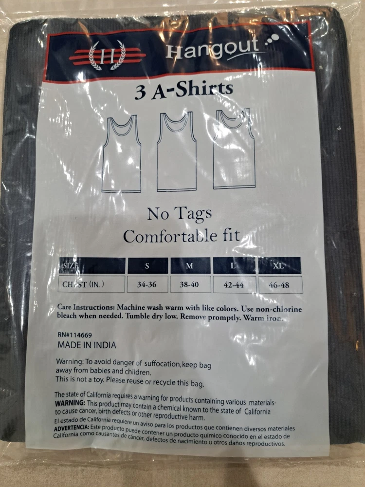 Introducing the Hangout Men's A-Shirts in black, grey, and white, available in a 12 pack size L. This T-Shirt is made of a lightweight and breathable blend of polyester and cotton that ensures comfort all day. The Sleeveless and Round Neck design provides a classic and regular fit, perfect for any occasion. In addition, this A-Shirt is easy to care for and is ideal for everyday use. With solid pattern and easy-care features, this T-Shirt is a must-have for any men's wardrobe. Cotton 65% Polyester 35% Good for 42-44 in. chest
