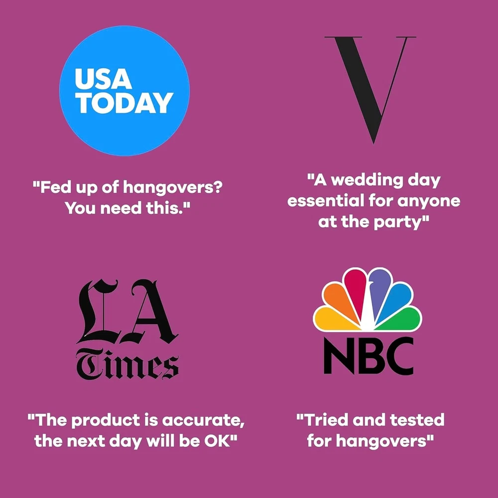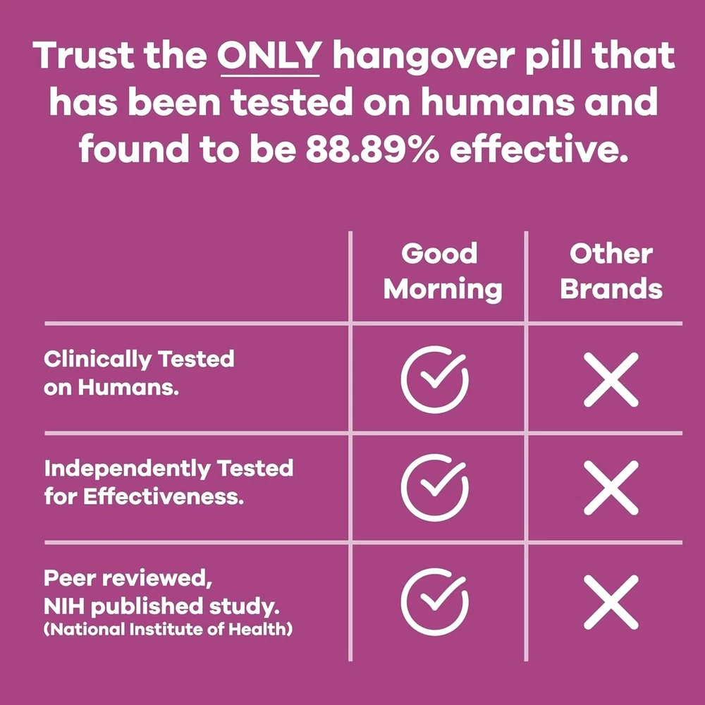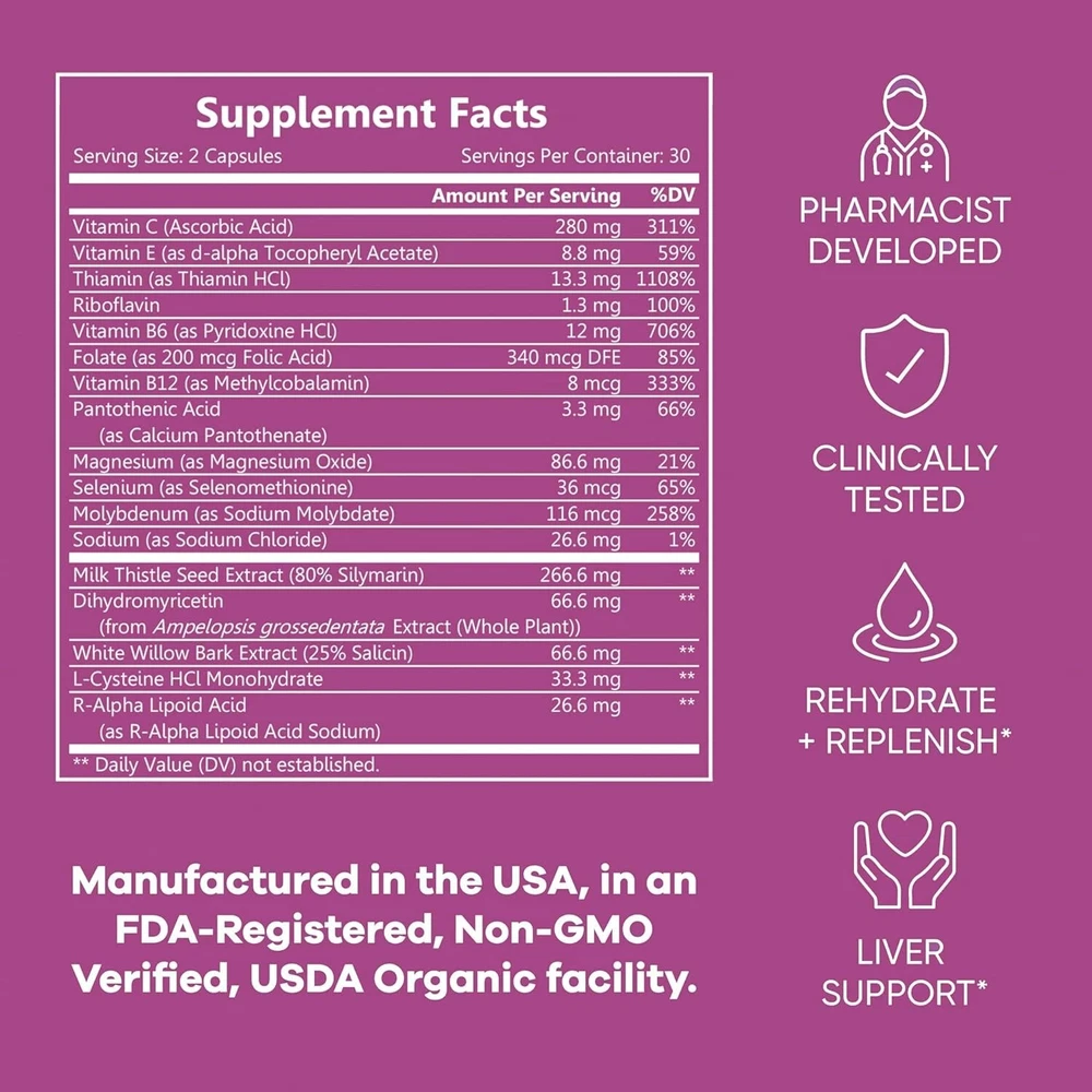 Key Features: No Magic, Just Science: Experience a natural way to support your body with our multivitamin supplement designed for hangover relief. Clinically tested and proven to aid in morning recovery, it’s packed with natural ingredients to help you feel your best after a night out. Clinically Tested for Effectiveness: This is the only hangover pill tested on humans in an independent study conducted by the University of Pacific, California, and published by the National Institute of Health. Rehydrate & Replenish: Formulated with essential electrolytes, our supplement helps prevent and relieve dehydration, ensuring you stay hydrated. Electrolytes are crucial for rebalancing your brain, heart, and body after drinking. After-Alcohol Detox Support: Replace the nutrients depleted by alcohol with our powerful antioxidant supplement, which helps restore your body's focus and energy. Featuring Milk Thistle for liver detox, our capsules support your body's ability to break down alcohol efficiently. Perfect for Travel: Take our hangover recovery kit with you to weddings, bachelor or bachelorette parties, cruises, or college events. These capsules are the ideal addition to any party-goer's essentials. Key Ingredients: Milk Thistle: Helps support liver detoxification. Electrolytes: Aid in hydration and replenishment. DHM (Dihydromyricetin): Known for its liver-protective and anti-inflammatory properties. Antioxidants & Multivitamins: Boost energy, focus, and general well-being. Directions: Take two capsules before bed after drinking, or two capsules before a night out for added protection. Safety Information: Not intended to diagnose, treat, cure, or prevent any disease. Consult with a healthcare provider before use if pregnant, nursing, or on medication. Always drink responsibly. Ingredients: Milk Thistle Seed Extract (80% Silymarin), Dihydromyricetin (DHM), Vitamin C, Vitamin E, Thiamin HCl, Riboflavin, Vitamin B6, Folate, Vitamin B12, Pantothenic Acid, Magnesium Oxide, Selenium, Molybdenum, Sodium Chloride, White Willow Bark Extract, L-Cysteine, R-Alpha Lipoic Acid. Legal Disclaimer: These statements have not been evaluated by the FDA. This product is not intended to diagnose, treat, cure, or prevent any disease. Please consume alcohol responsibly.