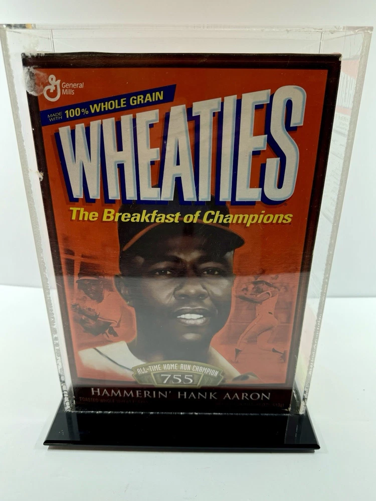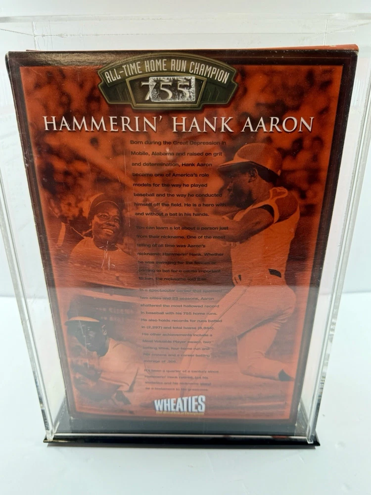 Celebrate baseball history with the Hank Aaron All Time Home Run Champion Wheaties cereal box, a must-have for any serious collector of sports memorabilia. This limited edition piece from 2002 commemorates Aaron's legendary career with the Atlanta Braves and his enduring legacy as a home run champion. Encased in a sealed plastic case, this original vintage item is preserved in impeccable condition, hailing from the United States and bearing the authentic mark of its era. The cereal box is steeped in the nostalgia of America's pastime and is an official piece of sports memorabilia. It pays homage to one of baseball's greatest players and is a tribute to the tournaments and events that have shaped the sport. Whether you're a die-hard Braves fan or a collector of vintage sports cereal boxes, this item is a remarkable find that encapsulates the essence of Hank Aaron's historic achievements.