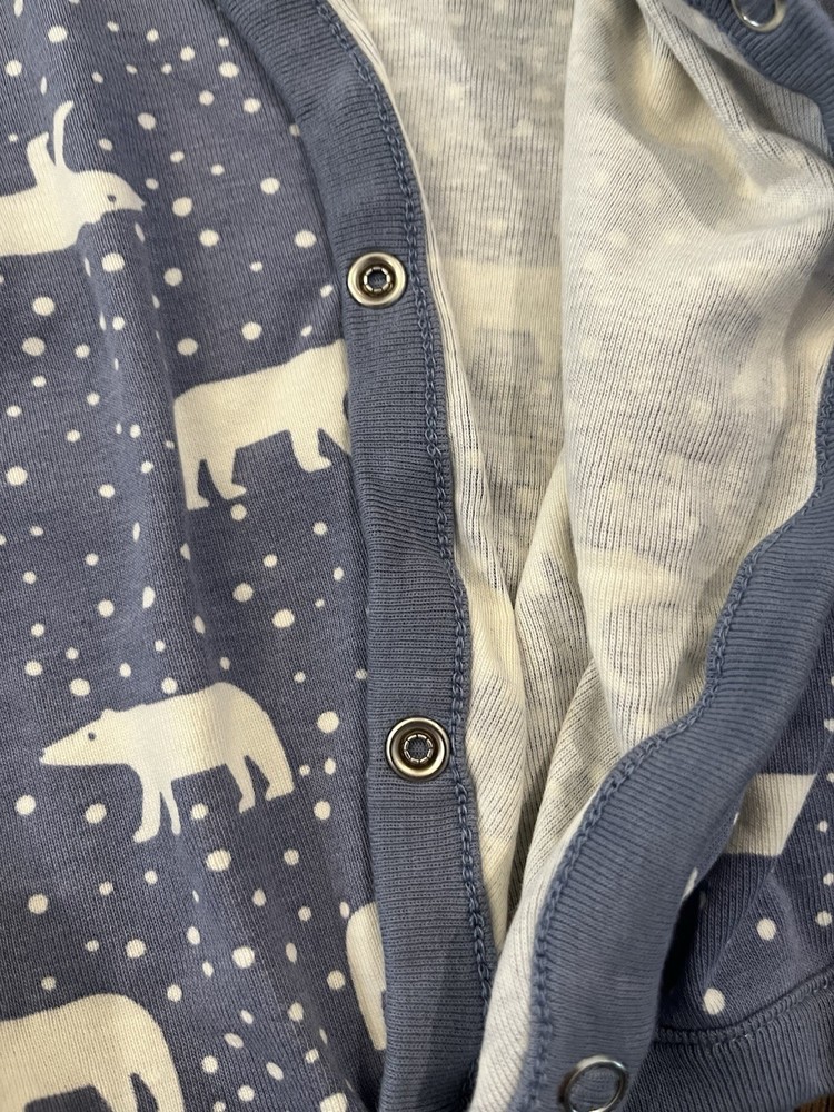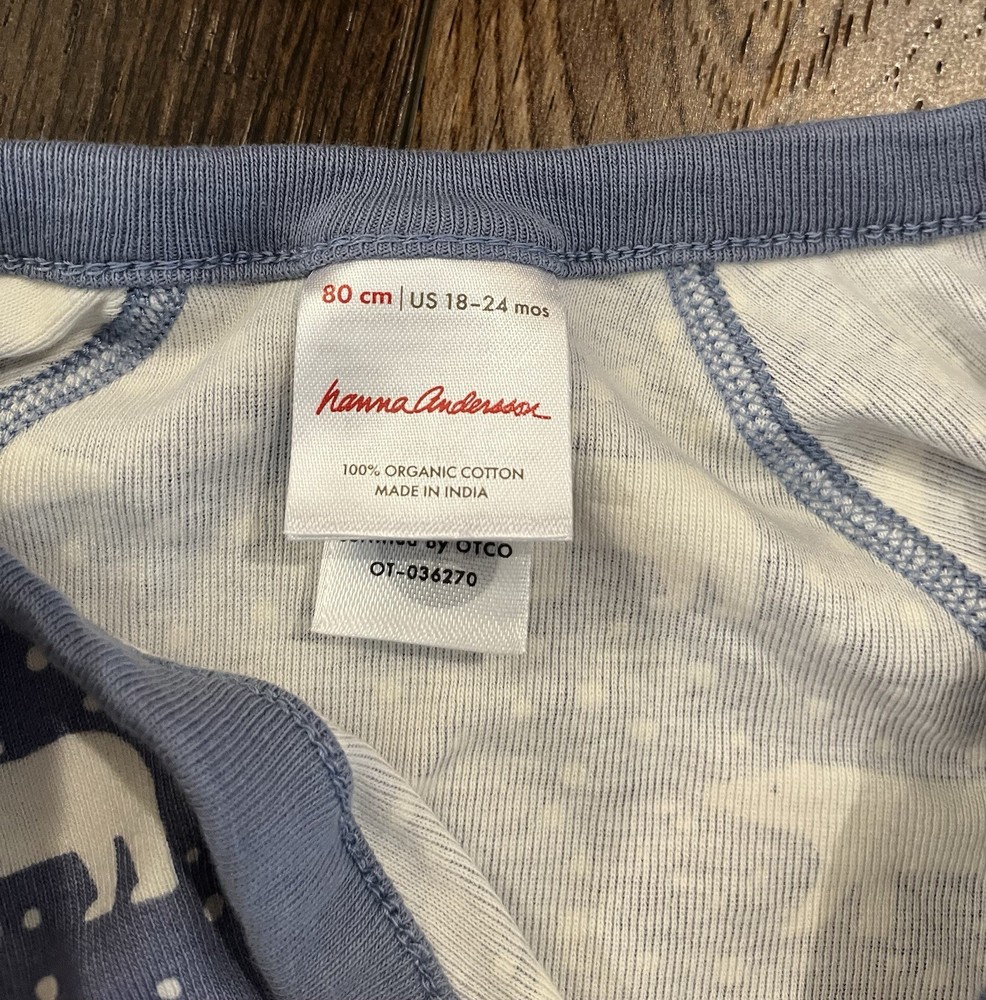 Don’t miss your chance to get this adorable polar bear print outfit for your little one! Hanna Andersson brand size 18-24 months. Long sleeve snap bodysuit and striped pants. Made of 100% organic cotton. Worn only once, from a smoke and pet free home.