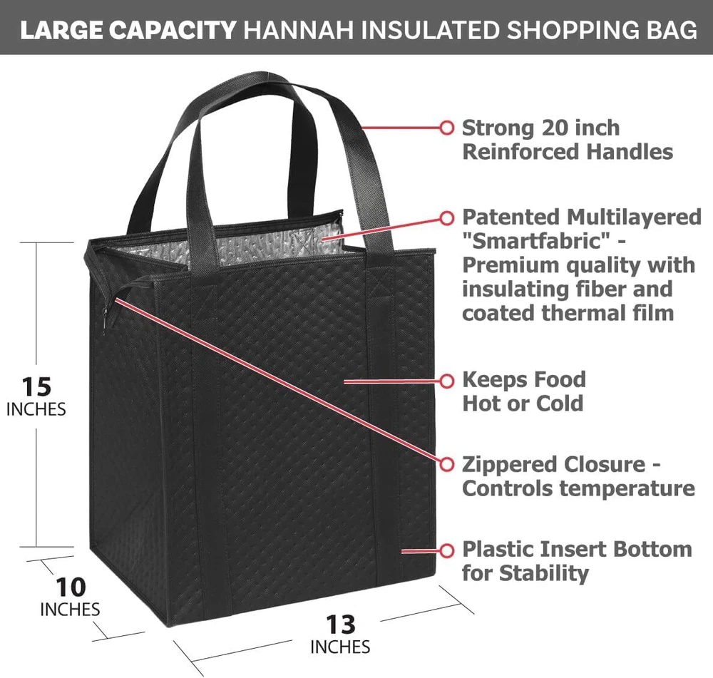 Hannah Direct Large Capacity Heavy Duty Insulated Smart Shopping Bag - Strong Reusable Grocery Tote 2 Pack (Red and Black) PRODUCT DESCRIPTION Description Experience the ultimate convenience and temperature control with our premium insulated grocery totes. Crafted from high-quality non-woven polypropylene, these totes are designed to keep your items hot or cold while you're on the move. Measuring 13"W x 10"D x 15"H, they provide ample space for all your groceries and essentials, making them the perfect companion for shopping trips or picnics. The zippered top ensures both security and easy access, preventing spills and temperature changes. The reinforced 20" handles are not only strong enough to carry heavy loads but also provide comfortable handling, whether you're holding the tote by hand or wearing it over your shoulder. Plus, with the added convenience of collapsibility, these totes can be effortlessly folded flat for storage when not in use. Elevate your shopping experience with these versatile, durable, and reusable insulated totes, designed to make your life easier while prioritizing style and functionality. PRODUCT FEATURES Premium Insulation: Keep your groceries and items at the desired temperature for longer, thanks to the high-quality non-woven polypropylene insulation that is great at keeping your food hot or cold. Spacious Design: With dimensions of 13"W x 10"D x 15"H, this large tote offers ample space to accommodate a variety of items, making it perfect for grocery shopping - especially at a big box store, picnics, food or meal delivery, sporting events and more. Secure Zippered Top: The zippered closure ensures that your items are safely enclosed within the tote, preventing spillage and maintaining the temperature of your hot or cold products. Built to Last: The durable, heavy duty construction of this eco-friendly tote was designed for longevity, the tote features dual reinforced 20" handles that can comfortably bear the weight of your groceries. The plastic bottom insert adds stability and durability, preventing sagging or wear and tear. Convenient Handling: The 1 1β4β-wide x 20β-long handles provide a comfortable grip for easy carrying, whether you're lifting the tote by hand or wearing it over your shoulder. Plus it is collapsible - it folds flat for easy storage and makes it great for storing an extra 1 or 2 in your car for any last minute needs. π SHIPPING We offer fast and reliable shipping. Your order will be processed within 1-2 business days. International shipping is available to most countries. All items are securely packaged to ensure safe delivery. π RETURNS If you are not satisfied with your purchase, you can return it within 30 days for a full refund. Refunds will be processed to your original method of payment. Items must be returned in their original condition and packaging. π³ PAYMENT We accept payment via PayPal, credit cards, and other payment methods supported by eBay. Please ensure your payment method is correct and updated to avoid any delays in processing your order. β FEEDBACK We value your feedback. If you are happy with your purchase, please leave us a positive review. π CONTACT US If you have any questions or need further assistance, please feel free to contact us through eBay messages.