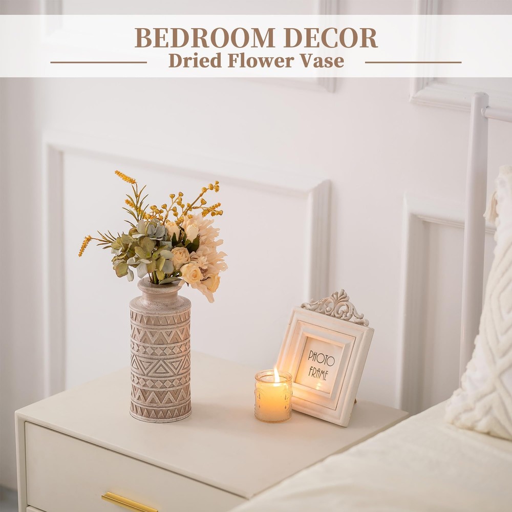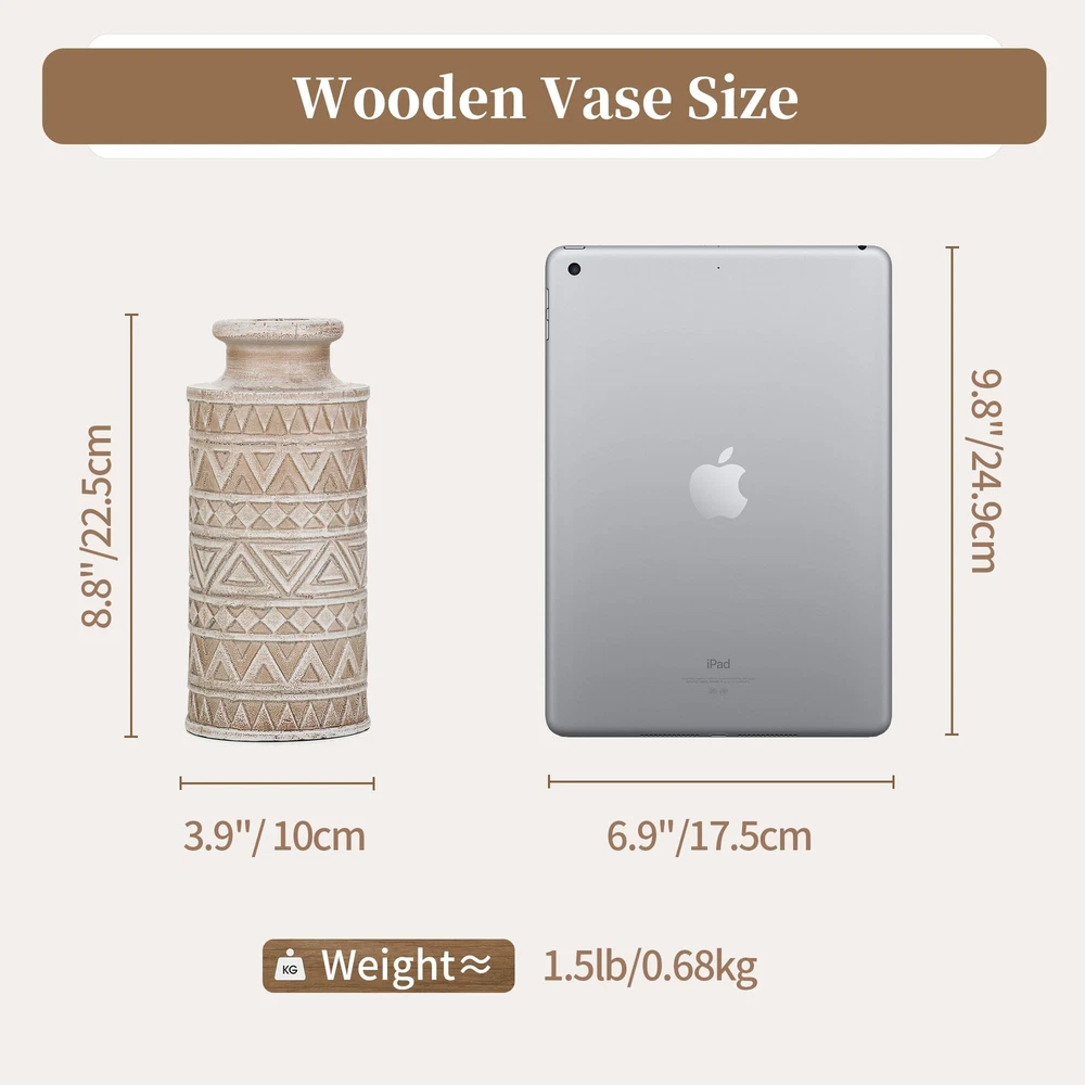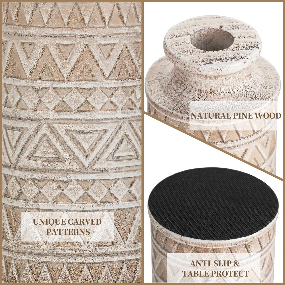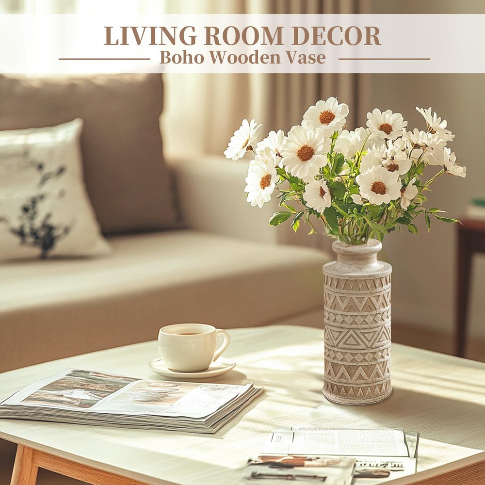 Unique Carved Beauty: Elevate your room decor with our decorative fall vase, featuring unique carved patterns that make a striking statement. The wooden dried flower vase is vintage elegant with a natural charm, adding texture and warmth to your space Durable and Pet-Friendly: Each centerpiece vases for table crafted from solid pine, boasts unique variations, ensuring durability. No pet or child's playful touch can harm these timeless pieces, suit to display artificial greenery plants or faux flowers Versatile Boho Farmhouse Style: Our beige vintage vase fits seamlessly into various styles, from modern to traditional. The farmhouse vase can be used as a living room coffee table vase, or as a standalone decorative piece in any room Elegant Display for Any Room: Measuring 4 x 4 x 8.7 inches with a 1.2-inch opening, it's ideal size for floral arrangements, seasonal decorations. Add an organic touch to bathrooms, office, kitchens, entryway, dining room, mantels, bedrooms or shelves Thoughtful Gift Option: This decorative vases for home decor is an ideal gift for every celebration. It's neutral minimalist design appeals to all tastes, making it a versatile choice for birthdays, Mother's Day, Christmas, or housewarmings present