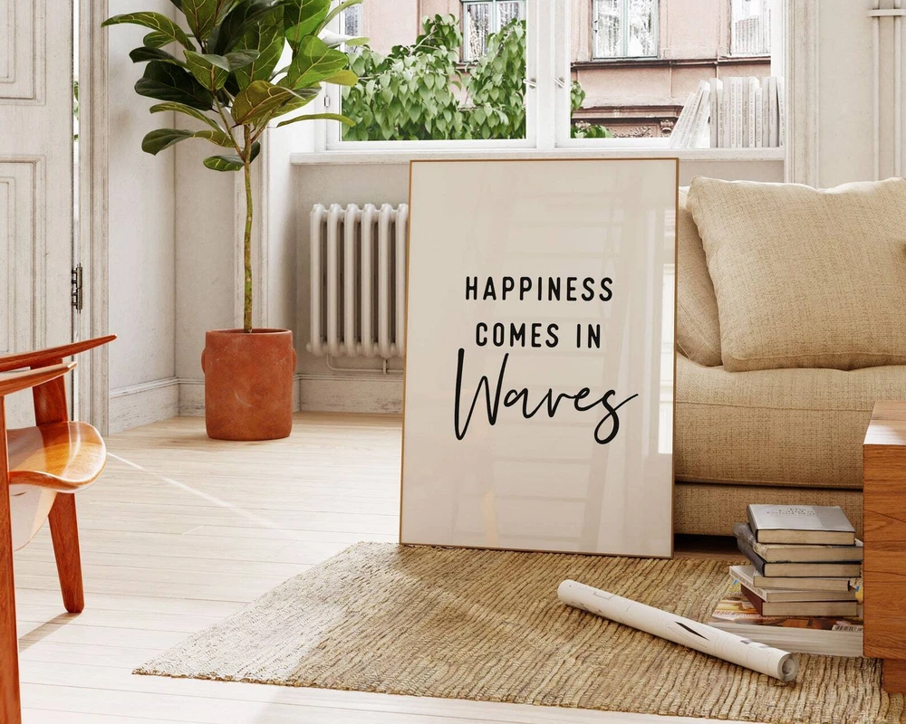 Happiness Comes In Waves Wall Art Printable Beach House Sign Motivational Quotes Print Poster Coastal Wall Decor Material: Premium luster photo paper Print type: Inkjet printing One side printed + The finish provides the highest possible resolution and color saturation + Lasts up to 200 years in color and 400 years in black-and-white + Printed on high-quality resin-coated photo base paper medium + Posters can be hung with double-sided tape, tacks, or framed + Hand washing with a gentle cry cloth is recommended for extended durability I will hand select the best choice of paper for your chosen design to ensure top quality results for a beautiful, bright and luxurious print. All prints are sealed in cellophane slips for protection during transportation, and are shipped in a protective cardboard envelope.