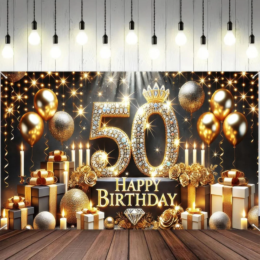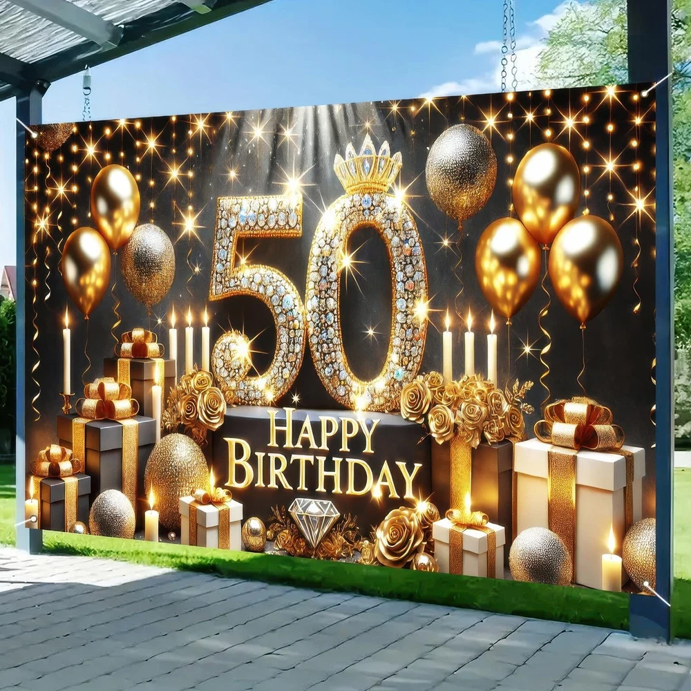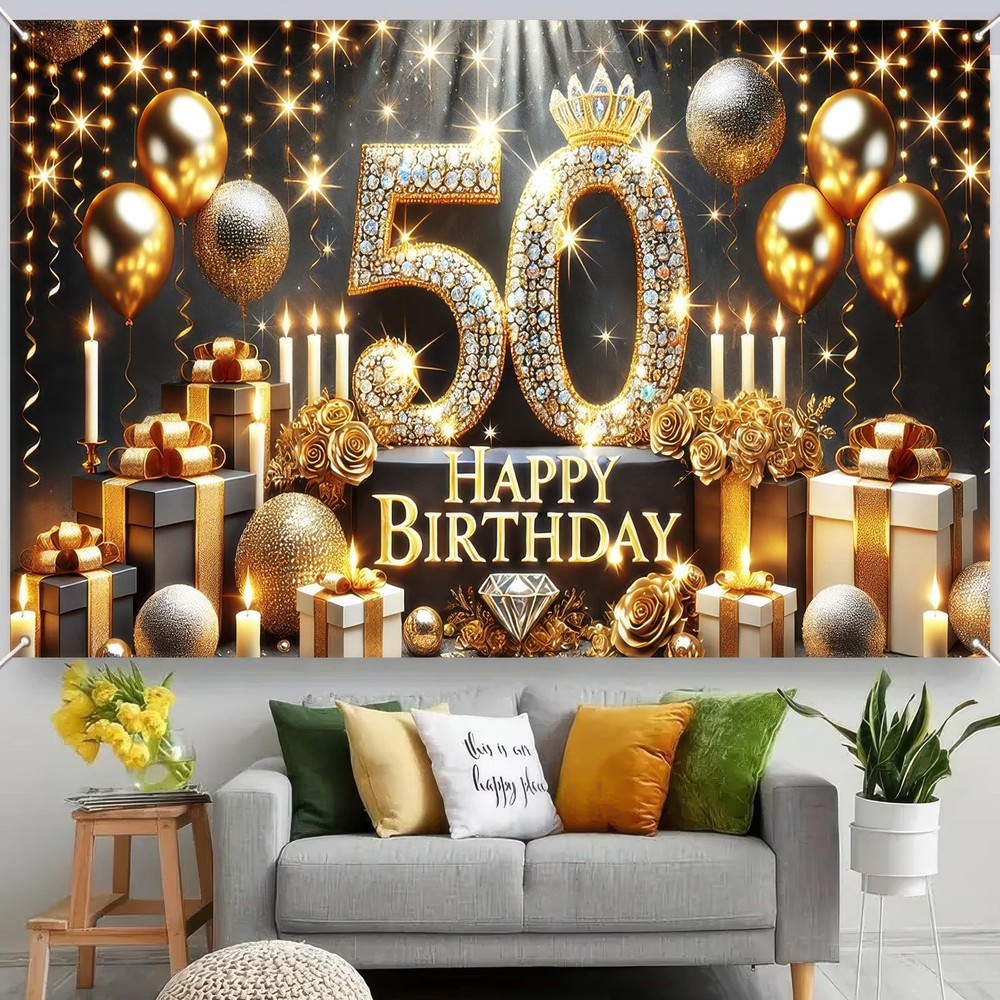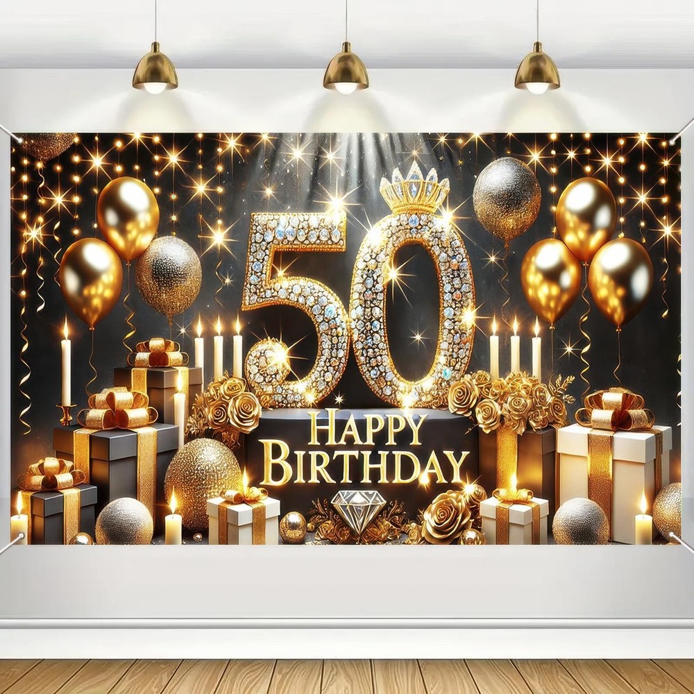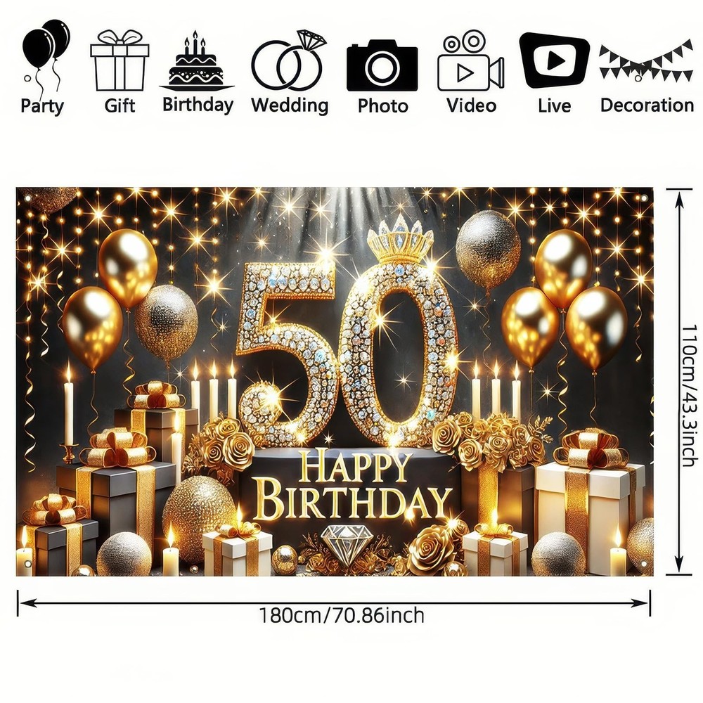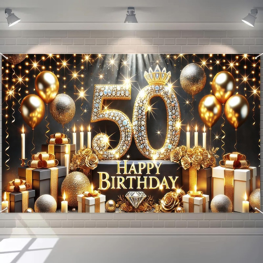 Happy 50th Birthday Sign Backdrop Birthday Backdrop for Photography Background Gold Diamond Balloon Party Photo Studio Banner Background Decorations for Women 71x43 Inch Product Details Size: 71 inches x 43 inches Brand: BlissYard Item Weight: 0.15 Kilograms Product Care Instructions: Machine Wash or Hand Wash Product Dimensions: 71 x 43 x 0.04 inches Item Weight: 5.4 ounces Item model number: Y25010906YXLF Date First Available: January 27, 2025 Manufacturer: BlissYard Reliable MaterialMade from lightweight, tear-resistant polyester fabric, this 50th Birthday Backdrop is washable, easy to fold, and portable. Its built to last and is perfect for long-term use, making it ideal for decorating a 50th birthday party. Large SizeMeasuring approximately 70.8 x 43.3 inches (180 x 110 cm), this backdrop is the perfect size to use as a signature wall or photo background, making it an excellent choice for decorating your birthday party. Elegant DesignFeaturing a large, glamorous number "50", embellished with diamonds, marking the significant milestone of a 50th birthday. Versatile UseIdeal for 50th birthday celebrations, this Happy Birthday banner can be used for decorating theme parties, birthday parties, and more. Its perfect as a party supply, wall decor, or for photography, and can also be displayed on windows or in the garden. Package IncludesThe set contains one "50 HAPPY BIRTHDAY" backdrop and a 20-foot (6 m) ribbon. The backdrop is designed with vibrant colors and adorned with balloons, adding a stunning visual element to your 50th birthday celebration.