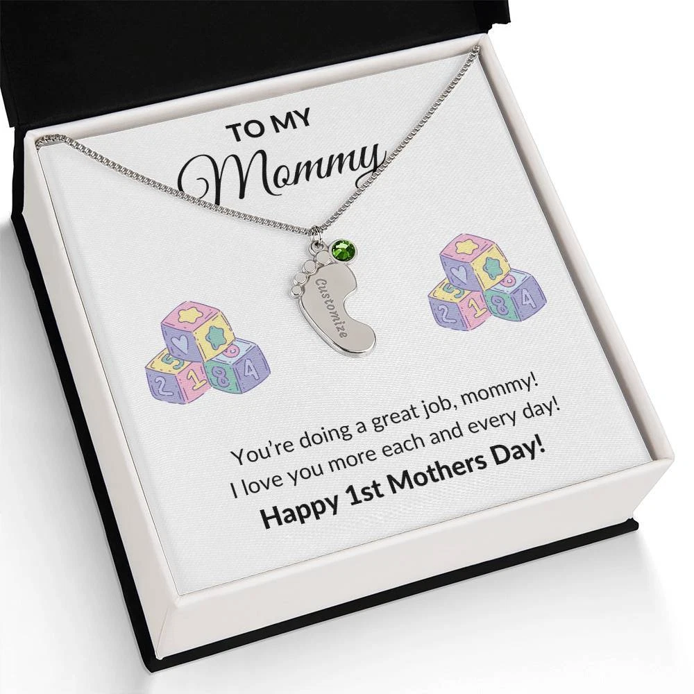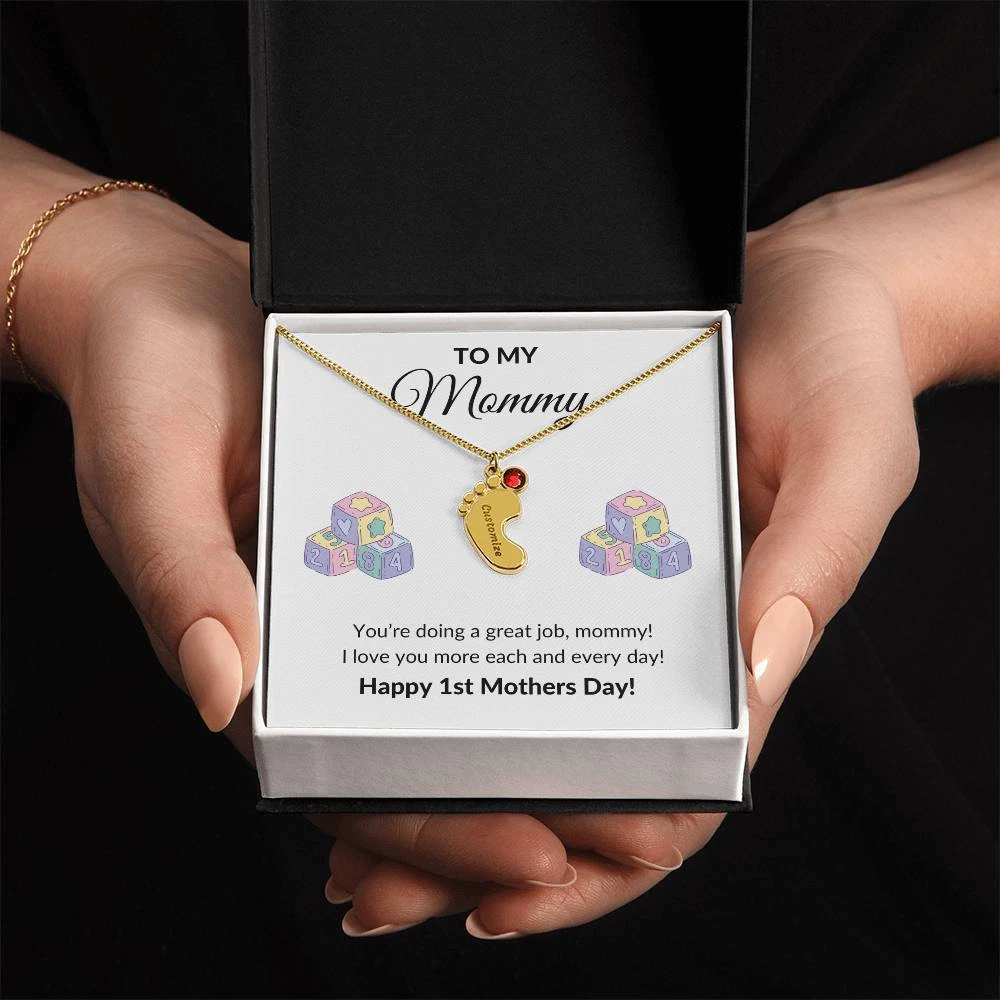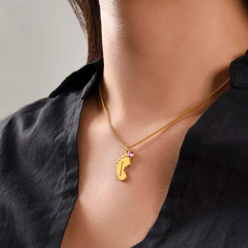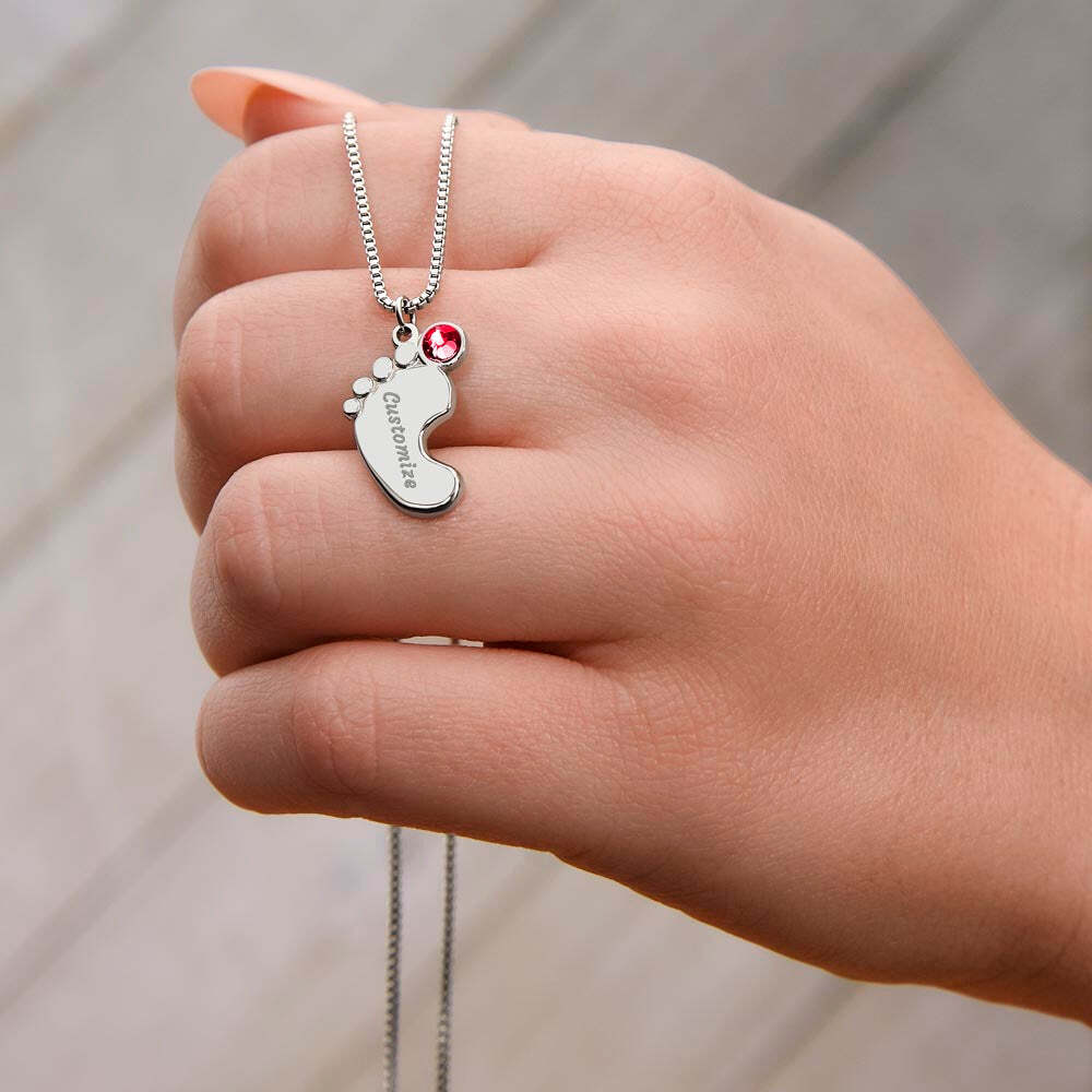 Get your new mom the perfect 1st Mother's Day gift with this engraved baby feet birthstone necklace. Celebrate the arrival of a newborn or cherish a precious memory with our Custom Baby Feet Necklace with Birthstone . Personalize your gift by engraving a name of your choice onto the pendant and choosing a crystal that correlates with the baby's birth month. And by picking multiple pendants, a custom present like this is perfect for moms and grandmothers with big families. This is a one-of-a-kind keepsake that will be treasured for a lifetime! MADE IN THE USA! Your necklace will be custom made upon ordering in the name or word of your choice, with up to 10 characters in the Courgette font. You can choose up to 4 personalized pendants with a birthstone crystal. This present makes for a truly unique and sentimental gift that will be treasured for years to come! Product specifications: Polished stainless steel or 18K yellow gold finish Customized with up to 10 characters 0.8” x 0.5” (20.57mm x 12.45mm) Adjustable box chain (16”-18”) 9mm lobster clasp MADE IN THE USA! Your piece is lovingly packaged in a complimentary soft touch box for easy gifting. Elevate your presentation by upgrading to the mahogany style luxury box, which features a brilliant LED spotlight.
