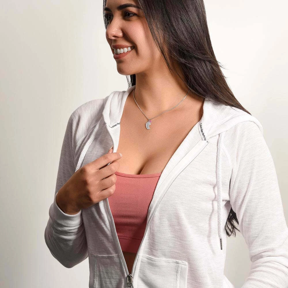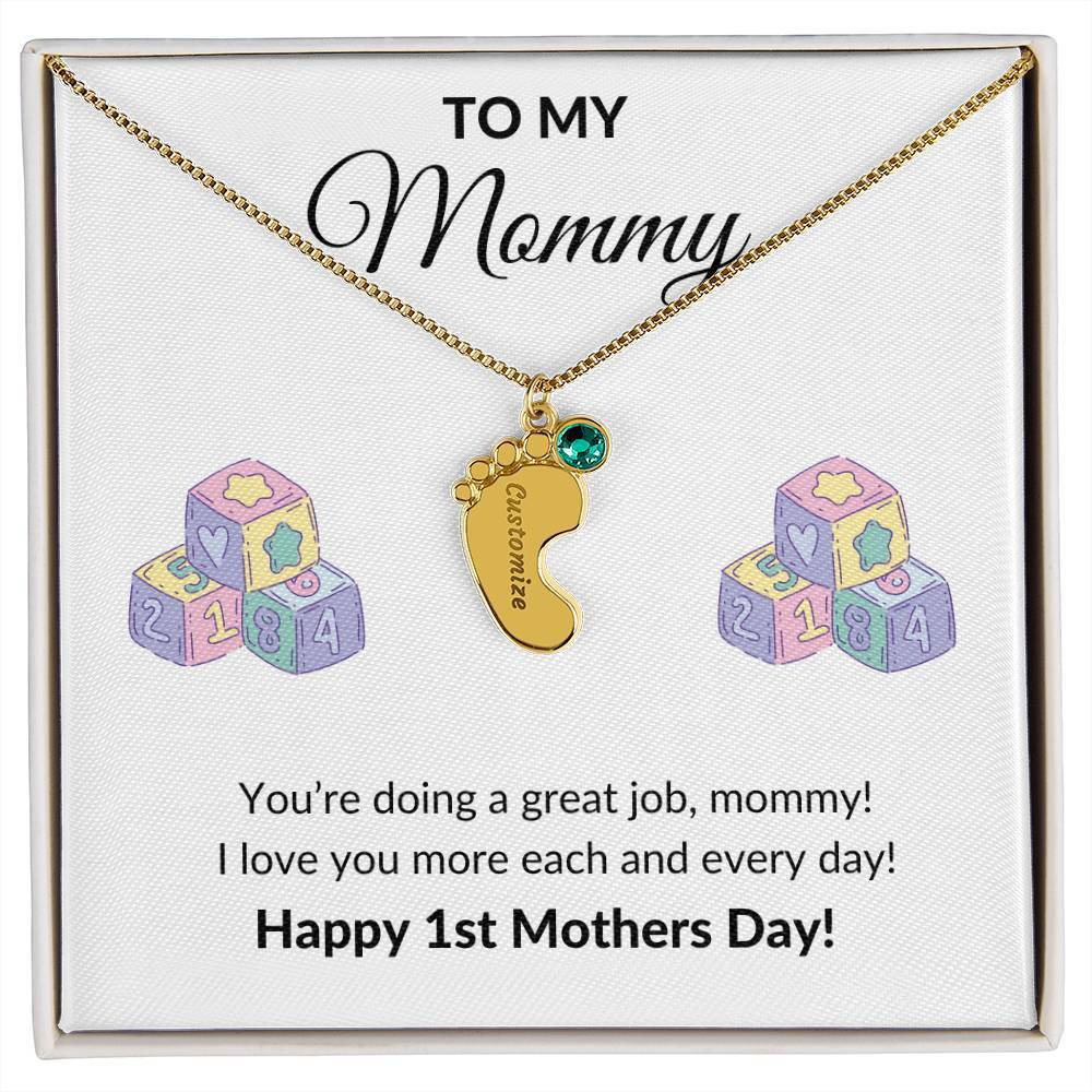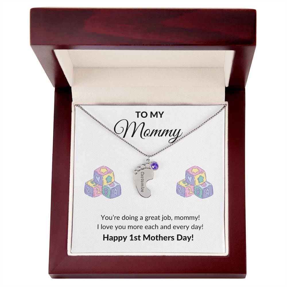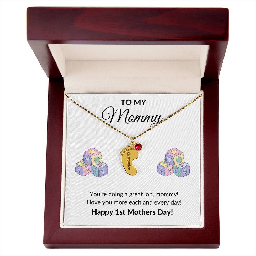 Get your new mom the perfect 1st Mother's Day gift with this engraved baby feet birthstone necklace. Celebrate the arrival of a newborn or cherish a precious memory with our Custom Baby Feet Necklace with Birthstone . Personalize your gift by engraving a name of your choice onto the pendant and choosing a crystal that correlates with the baby's birth month. And by picking multiple pendants, a custom present like this is perfect for moms and grandmothers with big families. This is a one-of-a-kind keepsake that will be treasured for a lifetime! MADE IN THE USA! Your necklace will be custom made upon ordering in the name or word of your choice, with up to 10 characters in the Courgette font. You can choose up to 4 personalized pendants with a birthstone crystal. This present makes for a truly unique and sentimental gift that will be treasured for years to come! Product specifications: Polished stainless steel or 18K yellow gold finish Customized with up to 10 characters 0.8” x 0.5” (20.57mm x 12.45mm) Adjustable box chain (16”-18”) 9mm lobster clasp MADE IN THE USA! Your piece is lovingly packaged in a complimentary soft touch box for easy gifting. Elevate your presentation by upgrading to the mahogany style luxury box, which features a brilliant LED spotlight.
