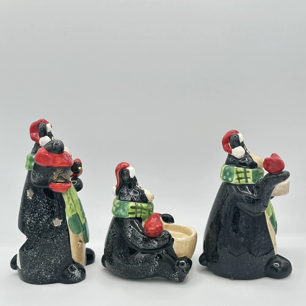 Add some festive cheer to your home with this Happy Holidays set of 3 black bears/cardinals ceramic tea light candle holders. Perfect for any room and suitable for Christmas, these candle holders are made from high-quality ceramic material and feature a cute design of bears. The multicolor adds a touch of playfulness to your holiday décor. Bring home the magic of the holiday season with these adorable candle holders. No chips or cracks.