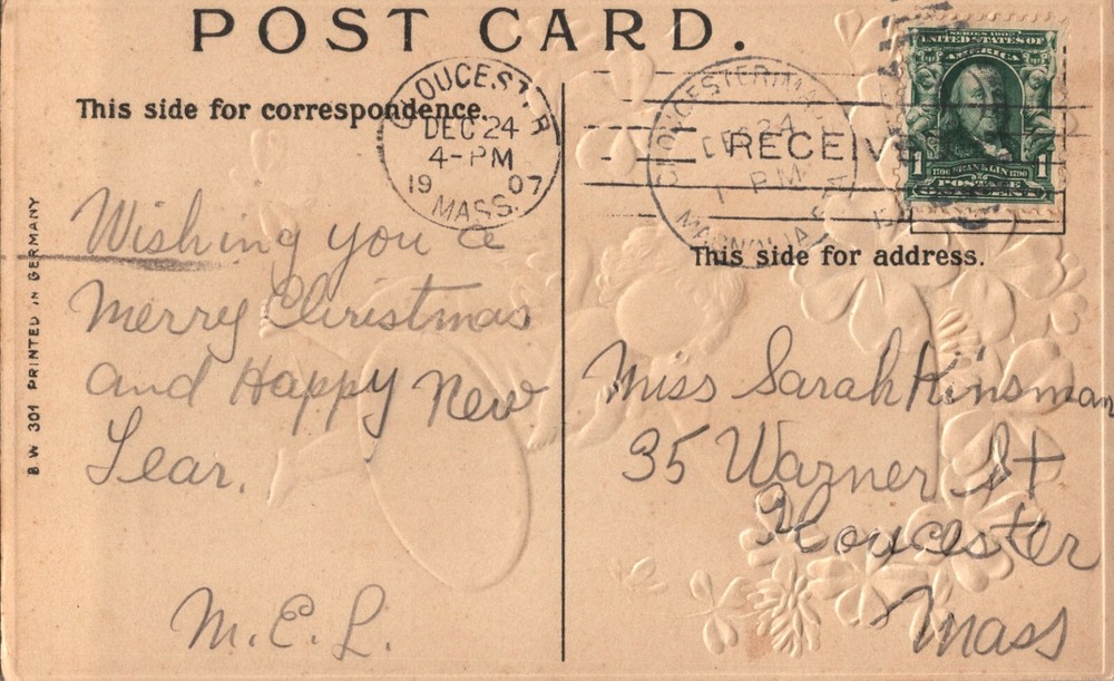 Happy New Year Angel Baby Holiday Big Champagne Glass Vintage 1907 Postcard Embossed Measures: 3.5" x 5.5" The FREE SHIPPING option in the USA that is offered on this item, is via the eBay Standard Envelope method, which is a great way to ship, with limited tracking features. However, if you want this item shipped with a more robust tracking, please upgrade your shipping option to USPS GROUND ADVANTAGE or USPS PRIORITY MAIL which provide a more accurate method of scanning.
