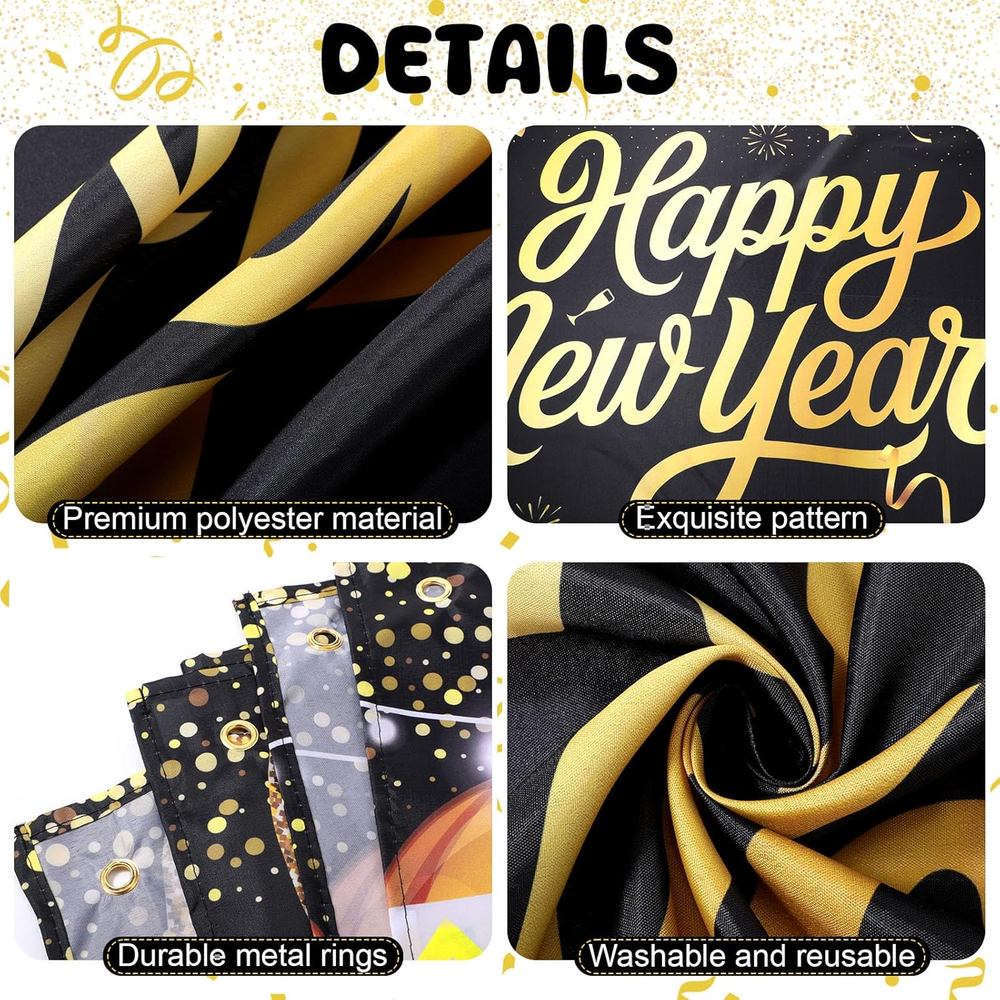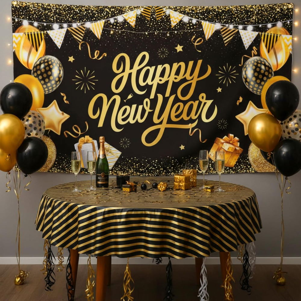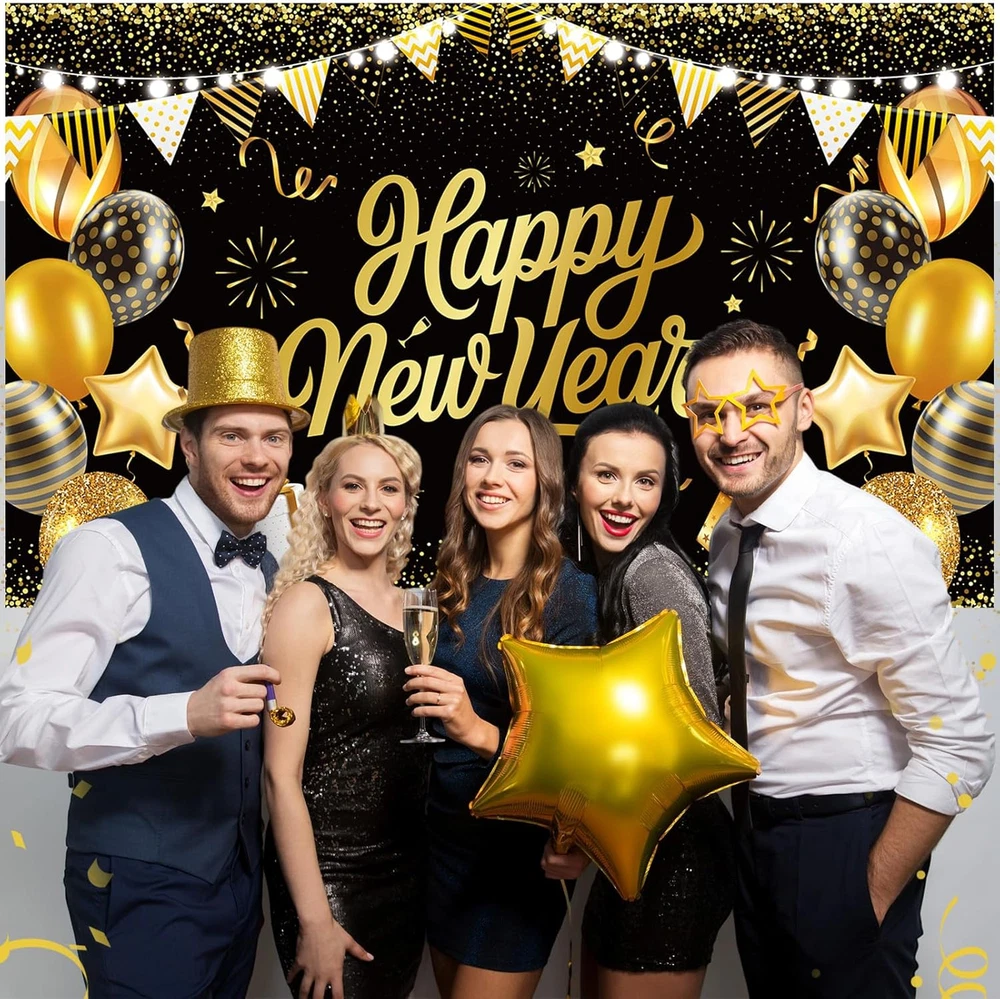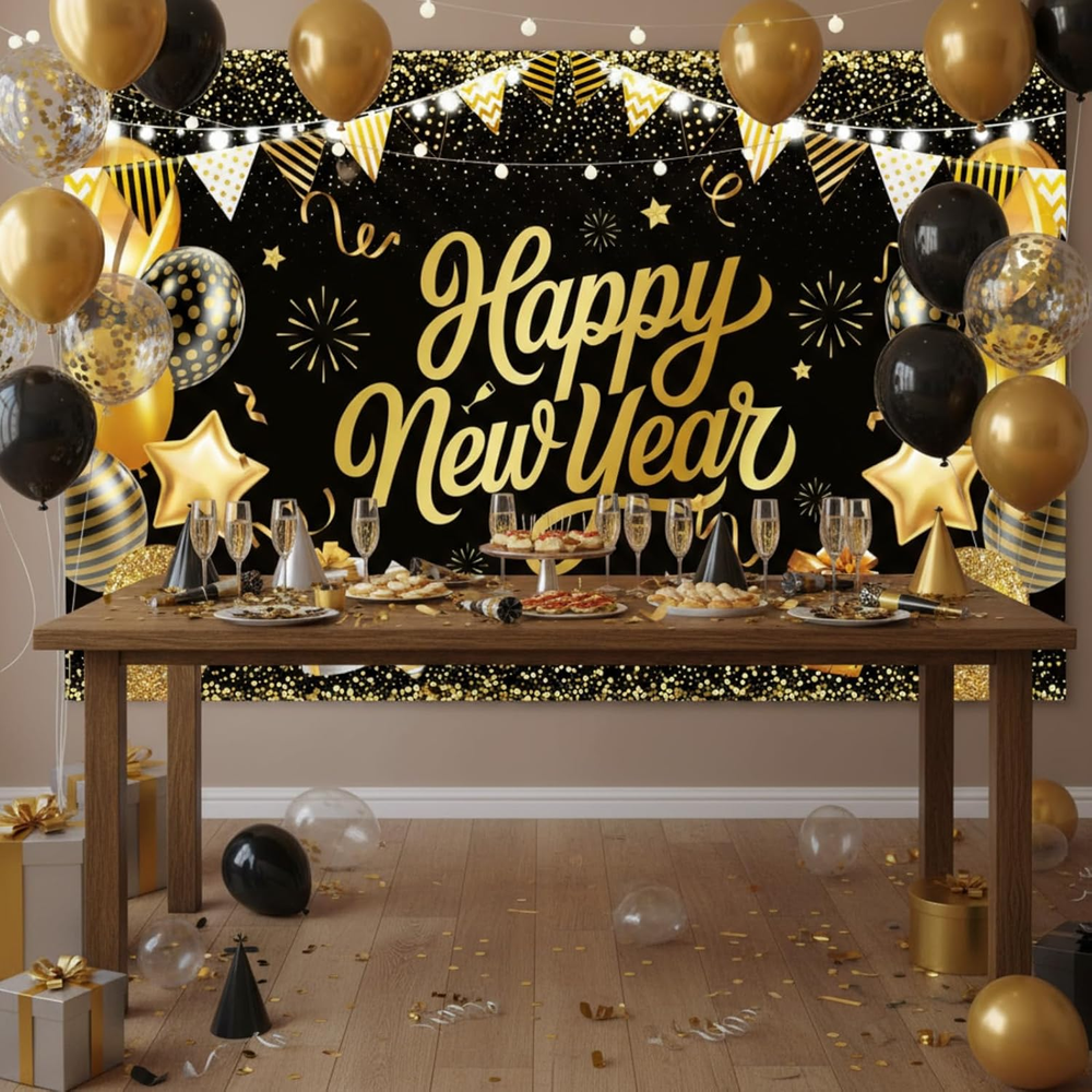 Store New Arrivals Add to Favorite View Feedback Contact Happy New Year Banner Backdrop 2026 for New Years Eve Party Supplies Glitter Black Gold Background Backdrop Decorations for 2026 Holiday Celebration Background Party Supplies(6 X 3.6 Ft) Description Item model number QQ--3583 Number of Items 1 Color black, gold Product Dimensions 0.72"L x 44.49"W Item Weight 7 ounces Happy New Year Party Supplies: this gold black photo backdrop banner comes in a large size of 71 x 43 inch/ 180 x 110 cm, making it an eye-catching centerpiece for any New Year's event; Its shimmering glitter finish and elegant design ensure your party space stands out with style Festive Banner Set: designed with “Happy New Year” greetings alongside vibrant illustrations of balloons, fireworks, and gift boxes, this backdrop instantly brings a joyful and celebratory vibe; The black gold color scheme offers a sophisticated touch suitable for both home gatherings and large parties Good Material: crafted from durable polyester, this happy new year banner is not only strong and resistant to wear but also features classic colors that resist fading; It's foldable for convenient storage and portability, making it a reusable decoration you can enjoy year after year Easy to Install: each corner of the banner includes pre-punched holes and comes with attached ropes; Simply thread the ropes through the holes, and you can easily hang it in various locations — whether on walls, doors, fences, windows, trees, or in your garden — hassle-free setup in minutes Versatile Usage: Nice for New Year's parties, family reunions, holiday events, or even as a gorgeous photo prop. Let this backdrop serve as the nice background for capturing memorable moments with friends and loved ones during the 2026 celebrations Features: A great gift or party essential: More than just a decorative element, it makes a great gift for friends, family, or the host, no matter who enjoys celebrating in style. Whether use at home or at a venue, this banner will bring everyone together and add a professional touch to any 2026 New Year's event. Application: The happy new year Party Fabric Sign Poster Banner Backdrop for your birthday/Merry Christmas/new year party. It is amazing to boost atmosphere for your party Decorations. Specifications: Material: polyester Color: black, gold Size: 6 x 3.6 ft Package includes: 1 x Happy new year backdrop banner Notes: Manual measurement, please allow slight errors on size. The color may exist a slight difference due to different screen displays ABOUT US We offer the best prices around on high quality products. Our E-store includes media such as books, movies, music and games while offering electronics, toys, sporting apparel, clothing, tools, general home, garden items and more. SHIPPING We are always working hard to ensure your package arrives as soon as possible. Please understand that some factors like weather, high postal traffic, and the performance of shipping companies are outside of our control. We offer free shipping to the lower 48 states and ship within 2 business days of payment, usually sooner. We do not accept P.O. Boxes. Please provide a physical address. For shipping outside of the continental USA, we only use eBay's Global Shipping Program.The item is shipped to KY and then sent to the rest of the world. International customers are responsible for all duties and taxes. Continue to check out in order to calculate costs for shipping the item to your country. Messages regarding eBay's Global Shipping Program MUST be directed at eBay EXCLUSIVELY. RETURNS We offer a 30-Day Return Policy on items which you are not completely satisfied with. You have the option for a full-refund or an exchange of the item. No returns are available on items shipped outside of the USA. PAYMENT We accept PayPal. CONTACT US This page content is yet to come Please ad us to your favorite seller and visit again later Thank You CUSTOMER SATISFACTION We try our very best to make sure every customer is completely satisfied. If there's a problem, message us! We're happy to help. WE ACCEPT