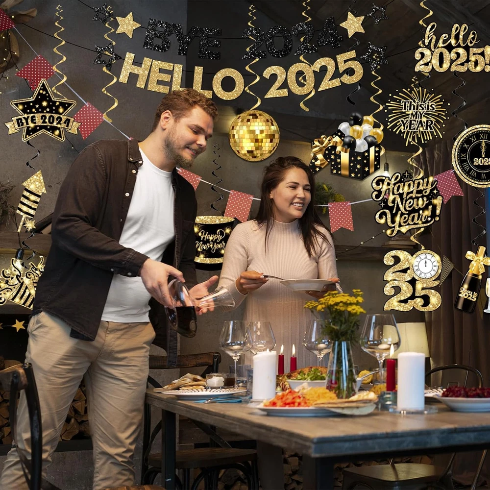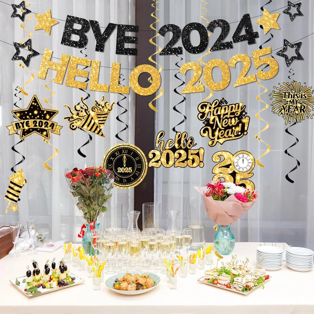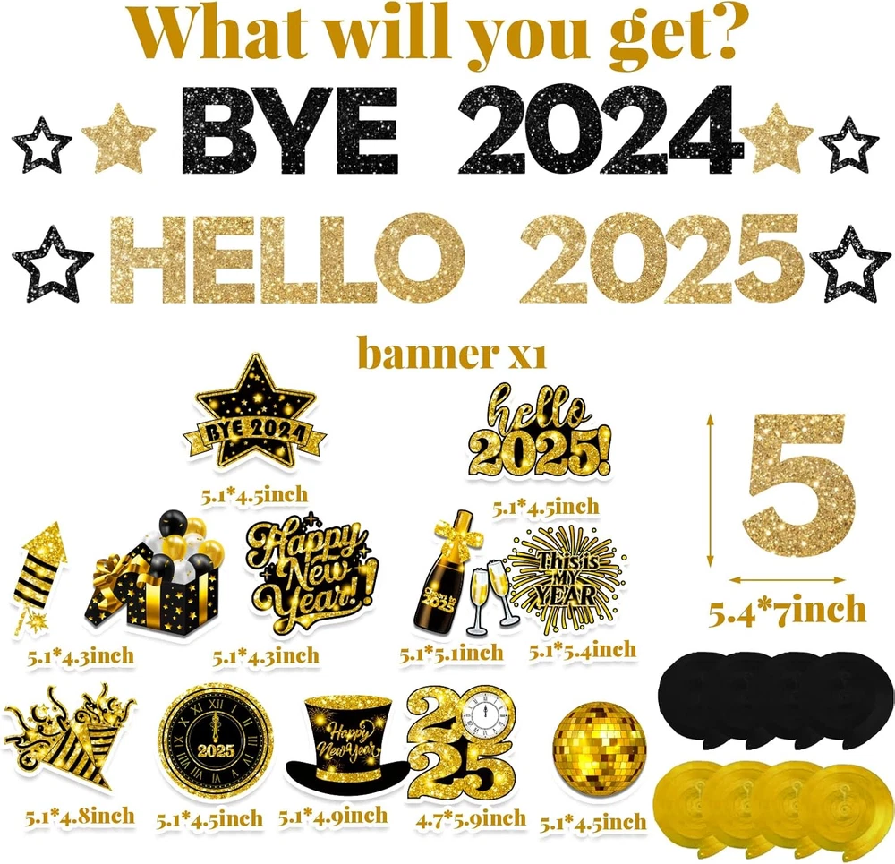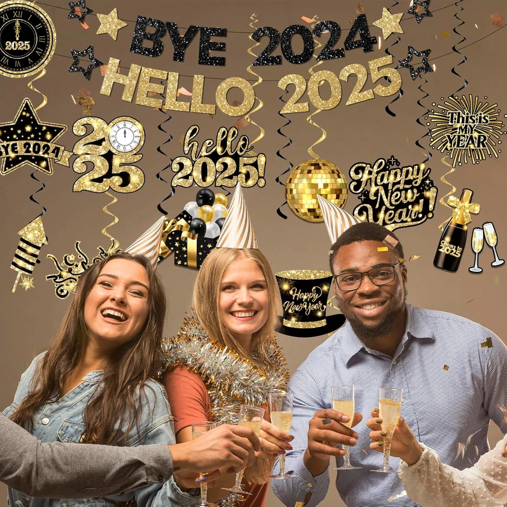 value package: our new year banner decoration comes with 1 pc glitter gold happy new year 2025 banner, 10pc happy new year hanging swirls and come with 10 pcs of different card cutouts in 10 different designs; 10pcs whirls glitter foil ceiling swirls streams in colorful, and clear plastic hooks for hanging. our happy new year decorations 2025 will be a big hit at your christmas party and adding festival atmosphere by setting this happy new year ceiling decorations happy new year banner:make way for 2025!! this beautiful shiny 2025 new years decorations is a perfect choice to add charm to your new years decorations 2025. this new year party supplies banner will create an extravaganza new years party vibe which will astound your guests and will make your new years eve decorations memorable.Let the countdown to a brighter future begin with happy new year 2025 decorations excellent material: these new year banner 2025 are made of high-quality cardstock and 350g glitter paper, which is thick enough and hd double-sided printed and not easy to bend and not fragile. the new year decorations use rich, shimmering colors and high-quality materials ensure the new years sign will sparkle and shine throughout the celebration. this hello 2025 banner create stunning and festive atmosphere with new years eve party supplies 2025 multiple occasions: the new years hanging decorations are suited for holiday decorations, new year's party, christmas decorations, and nye decorations 2025,new years eve party supplies. the nye banner can be applied to new year eve party and other special occasions, ideal party supplies and decorations add much fun and festive atmosphere to the for 2025 new year decorations. this happy new year ceiling decorations is a must have choice for you new years eve decorations 2025 perfect decorations: planning a glam & shining décor for the happy new year decorations 2025? these stunning new year hanging swirls for new years eve will make it real! fill the ceiling with these printed glittering happy new year decoration pack to add the shimmering effect & use this as a new years eve noise maker more fun atmosphere for family, kids, friends & your special someone on your dream event Product Description