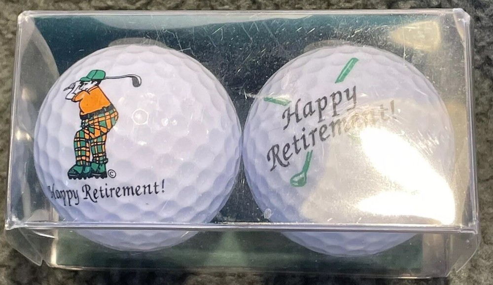 Enhance your golf game with the "Happy Retirement" Golf Balls from Tour USA 1. This set includes two white balls with the features of a golfer. Perfect for retirement gifts or for adding to your collection, these balls are a great addition to your golf equipment. Get ready to hit the greens with style and celebrate your retirement with these delightful golf balls.