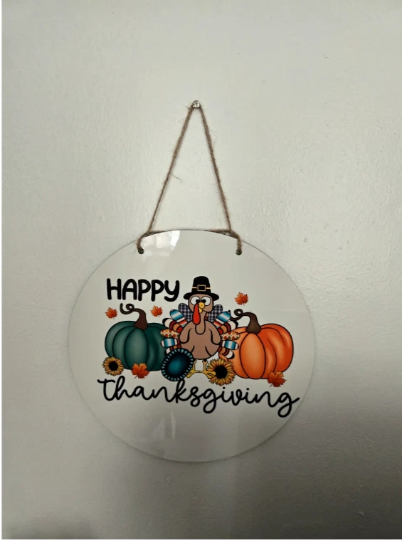 Happy thanksgiving Doorhanger 11.75 inches. Its white on the front and the back is a wooden finish great to hang outdoors.