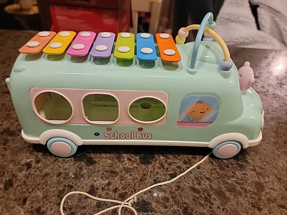 The Happy Time School Bus Baby Toy with Shapes is a musical toy designed to promote hand-eye coordination and motor skills in babies aged 2 years and up. With a colorful multicolor design, this toy features various shaped pieces that children can sort and place into the school bus. The toy's theme combines music and fun, making playtime engaging and educational for little ones. Ideal for both boys and girls, this unisex toy is a great way to entertain and stimulate young children while promoting important developmental skills.