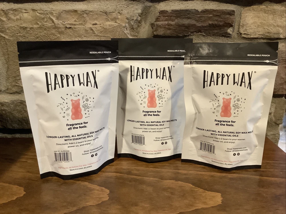 Happy Wax Signature Wax Warmer Flame Free Home Fragrance 3 Xtra Bags Wax Melts Brand New 2 oz Fall Woods scented soy wax melt 2 oz Autumn Breeze scented soy wax melt 2 oz Pumpkin Spice Latte soy wax melt