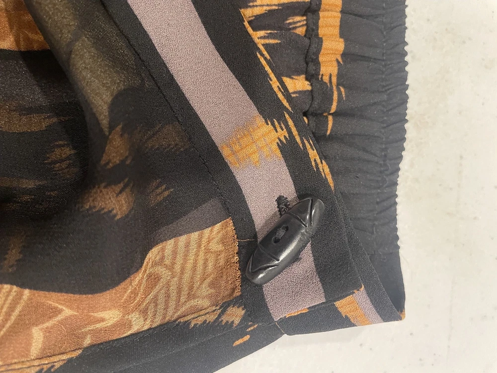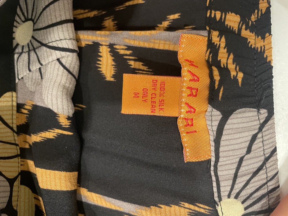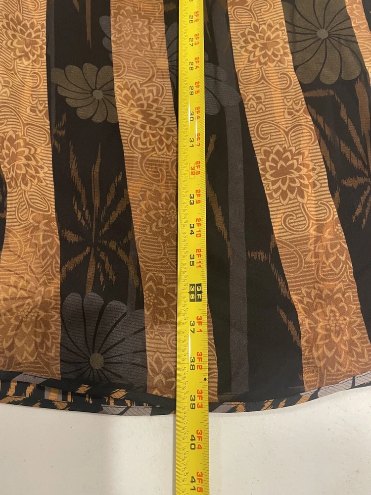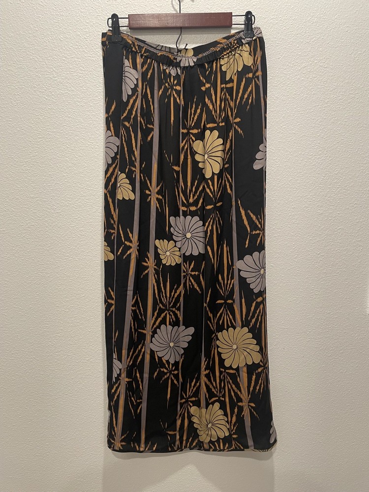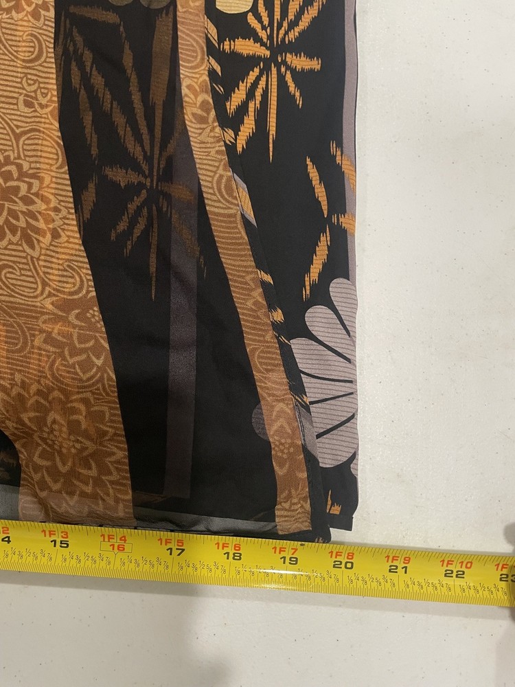 The Harari Women's Size M Orange and Black Silk Midi Wrap Skirt is a stylish and versatile piece perfect for casual occasions. Made of luxurious silk fabric with a floral pattern and black/orange color combination, this skirt features a high rise and an elastic waist for a comfortable fit. The wrap design and midi length add a touch of elegance, making it a great choice for various seasons and themes such as nature, flower, and bohemian style. Made by Harari, this skirt is a standout addition to any woman's wardrobe, sure to elevate her outfit with its unique design and quality craftsmanship. See pictures for quality and measurements.