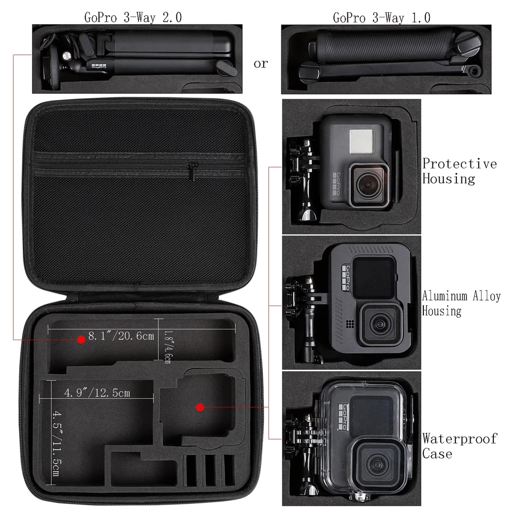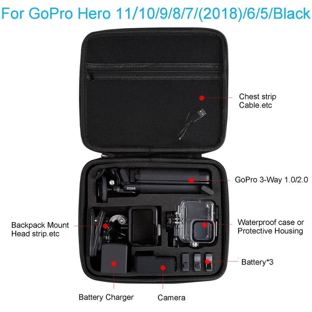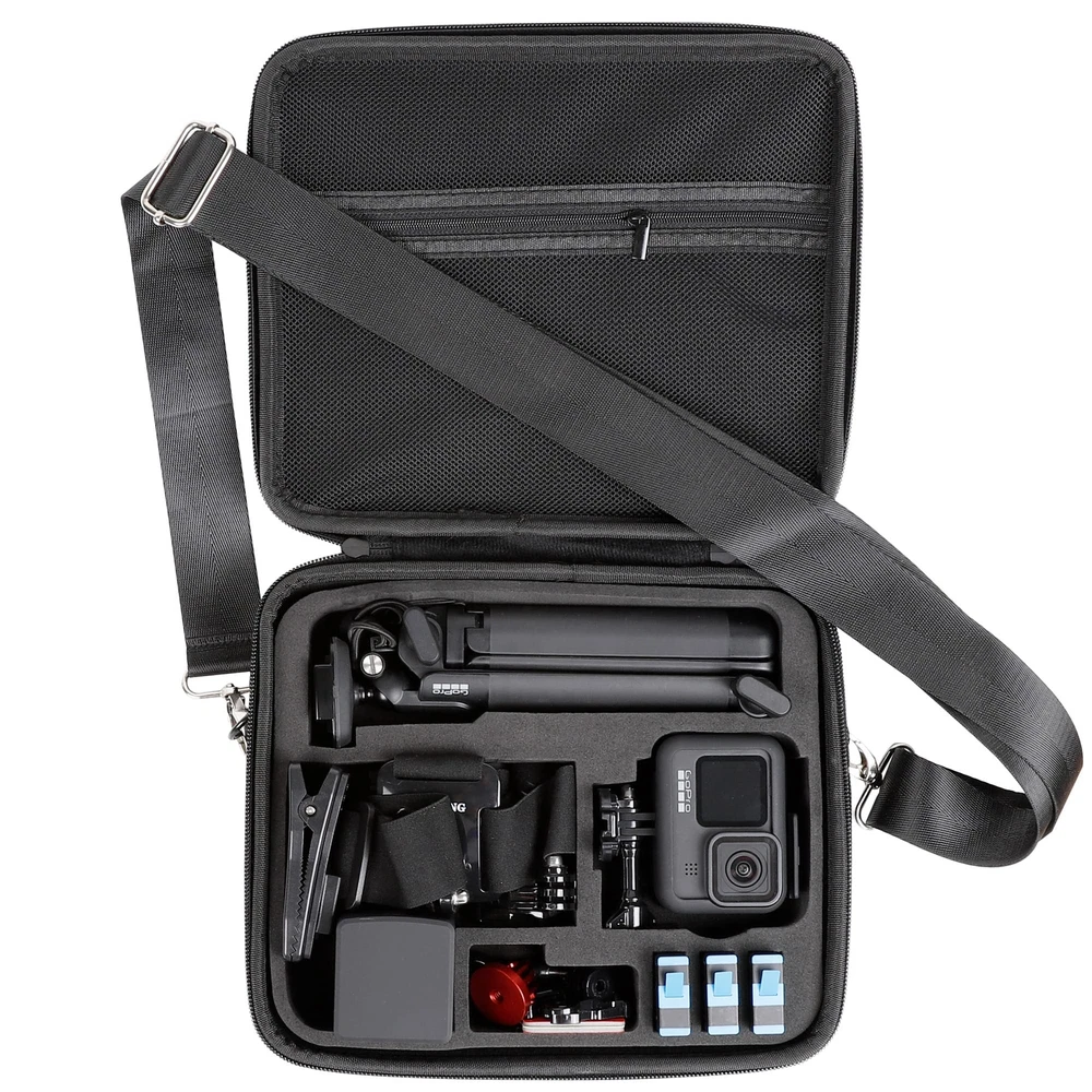 Description Upgrade: We have improved this suitcase. Mainly include extended width, exclusive designed camera slot block, double zipper, shoulder strap, mesh zipper pocket, etc. FITS SIZE: Stores your Gopro camera and case along with some other essential accessories. Keep your GoPro and accessories safe, protected and organized. Compact and easy to store in a backpack or carry-on, recommended for travel and home storage. High Quality: High quality hard surface, Rainproof and moisture resistant. High quality EVA foam interior padding with pre-cut slots to secure your items on all sides. Double-layer elastic mesh pockets provide superior storage space for cables and other accessories. Package includes: handbag Shoulder strap Case Designed for the GoPro Camera: The new Protection Carrying Case for GoPro Hero 13,Hero 12,Hero 11, Hero 10,Hero 9, Hero 8, Hero 7, Hero 2018, Hero 6, Hero 5 Black Action Camera and DJI Osmo Action 5 4 3 Insta360 Ace Pro. Perfectly Compatible With GoPro Cameras And Accessories: The case is perfect for storing GoPro cameras and accessories such as the GoPro 3-Way Grip/GoPro 3-Way 2.0 Selfie Stick, 3*Battery, Battery Charger, Waterproof Case, Protective Body, Chest Strap, Head Strap, Backpack Clip,and Other Mount Acessories. High Quality Manufacturing: The hard shell protects the contents of the box from being squeezed, the exterior is made of 1680D double- layer Oxford cloth,has good rain-proof functionand the inner rigid EVA padding will not deform and fits the outer case perfectly without shaking. This is the perfect bag for your travels. Easy To Carry: This bag not only has upgraded rubber handles but also has an adjustable shoulder strap (59IN/150CM) so you can carry it slung over your shoulder when your hands are occupied with shooting, At the same time with double zipper design,This Case size: 10.2*8.8*2.6 inches / 26*22*6.6cm, weight 510g / 18 Ounces. Top Mesh Pocket Design: Ideal for storing charging cables, thumbscrews, helmet accessories, microSD cards, and more