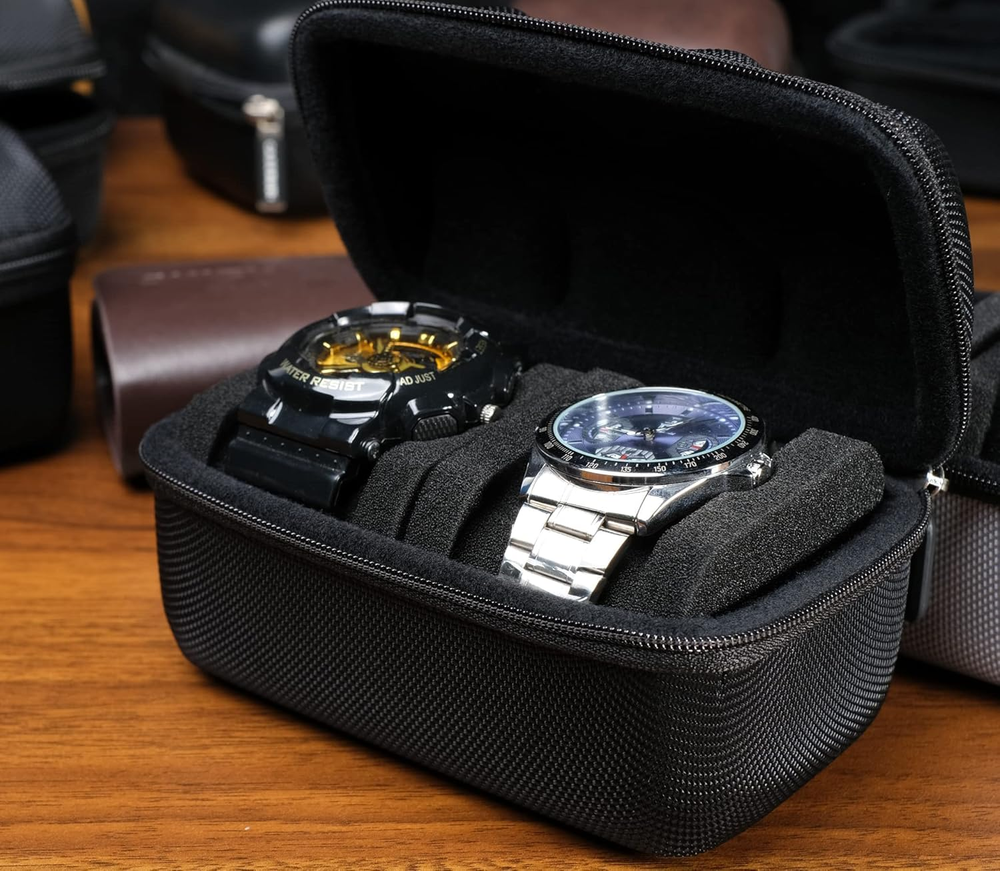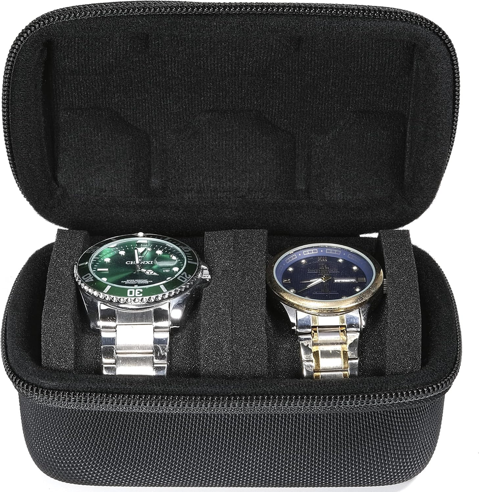 Store New Arrivals Add to Favorite View Feedback Hard Compact Watch Roll Case, 2 Slots Portable Holder and Organizer with Soft Pillow, Keep Watch from Moving(Fit up to 55 Mm) Description Item model number FR44S6 Style Modern Number of Items 2 Closure Type Elastic Country of Origin Canada Batteries Included? No Jewelry Storage Type Jewelry Roll Batteries Required? No Number of Compartments 2 Special Feature Hardshell watch vault Product Dimensions 2.76"D x 5.51"W x 2.76"H Material velvet Number of Drawers 1 Finish Type Hard Item Package Quantity 1 Item Weight 3.53 ounces Finish Hard Occasion Father's Day Special Features Hardshell watch vault Target Audience Women, Men Part Number FR44S6 Mounting Type Table Top Color Black Inner Material Velvet Shape Rectangular Recommended Uses For Product Watch Size 2 slots black Number Of Pieces 1 Separation Watch Pillow: Custom watch pillow keep watches from move around and touch each other, offering great protection like never before; Watch pillow is made with high-quality elastic foam, can fit women and men watches up to 55mm watch face。 Stylish Design: With compact and stylish design, can easily be tossed in a backpack or luggage case, ideal for traveling. Hard Watch Roll Case: The outside case is made with hardcore material, the inside case is soft velvet lining, offer enough protection in traveling and daily usage. Quality and satisfaction: this watch case and pillow are handmade and carefully checked, it's unique design would make a big difference in watch organization Great gift idea for loved ones; Quick after-sale response, should you have any question, please let us know Product Description 2 Slots Watch Case With Custom Separation Watch Pillow Build to last: Hard Rugged case with durable Ballistic nylon fabric Outside is hard molded EVA and covered with durable1680d nylon fabric Inside is thick soft velvet, offer extra protection for watch band and face. Original design watch pillow Groove design Help to keep watch in place, with side foam bar for separation and protection Compressible foam is flexible to fit small and large sized watches up to 60mm face Steamlined Design Compact and streamlined design: Easily put inside backpack or luggage, take minimal space. ABOUT US We offer the best prices around on high quality products. Our E-store includes media such as books, movies, music and games while offering electronics, toys, sporting apparel, clothing, tools, general home, garden items and more. SHIPPING We are always working hard to ensure your package arrives as soon as possible. Please understand that some factors like weather, high postal traffic, and the performance of shipping companies are outside of our control. We offer free shipping to the lower 48 states and ship within 2 business days of payment, usually sooner. We do not accept P.O. Boxes. Please provide a physical address. RETURNS We offer a 30-Day Return Policy on items which you are not completely satisfied with. You have the option for a full-refund or an exchange of the item. No returns are available on items shipped outside of the USA. PAYMENT We accept PayPal. CONTACT US This page content is yet to come Please ad us to your favorite seller and visit again later Thank You