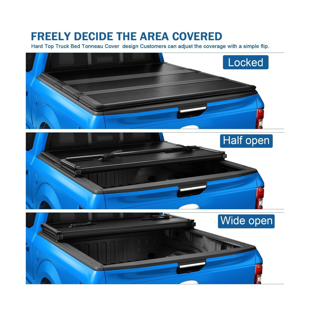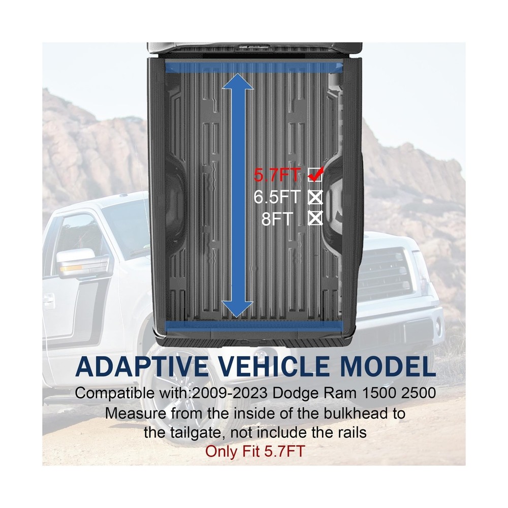 Hard Tri-Fold Truck Bed Tonneau Cover Compatible with 2009-2023 Dodge Ram 1500 2500 5.7FT Bed Description Features: [VEHICLE MODEL FIT] Compatible with 2009-2023 Dodge Ram 1500 2500 5.7FT Bed. Please verify your bed length before ordering. [EXCELLENT MATERIAL] FRP panels and internal honeycomb structure support, resist the impact of heavy objects, protect your cargo from the elements & theft. Waterproof, snow proof and dirt proof, keeps truck bed dry and secure. [PRACTICAL FUNCTION] Suitable for various weather conditions, including rainy and snowy days. It can not only decorate your truck, but also improve fuel economy and protect your shopping, toys, and camping supplies. It can prevent your items from being stolen or rained on the cover. [EASY INSTALLATION] Easy to install, no drilling and further modification. Provided necessary hardware and instructions for installation. Easy to use clamping system secures the cover to your truck, so it won't detach when you're. [WARRANTY] Provide one year warranty. For any reason, if you are not satisfied with your purchase, contact us directly. Product Details: Brand: DICMIC Style: Folding Exterior Finish: Fiber Reinforced Plastic Material: FRP Lock Type: Tailgate Brand: DICMIC Style: Folding Exterior Finish: Fiber Reinforced Plastic Material: FRP Lock Type: Tailgate Manufacturer: DICMIC Automotive Fit Type: Vehicle Specific Fit Model: Dodge Ram Truck Bed Tonneau Cover Item Weight: 62.6 pounds Product Dimensions: 72.05 x 26.77 x 5.31 inches Item model number: DICMIC-H212 Manufacturer Part Number: DICMIC-H212 Date First Available: December 15, 2023 Delivery We Do Not Ship Outside of the Continental US. Return Policy All items qualify for returns within 30 days of receipt. Buyer is responsible for return shipping on any item that is not damaged. Feedback We take our reputation seriously, we buy and sell online, so we understand the value of trust. If you are unsatisfied with your order, please contact us and we will work with you to resolve it to your satisfaction.