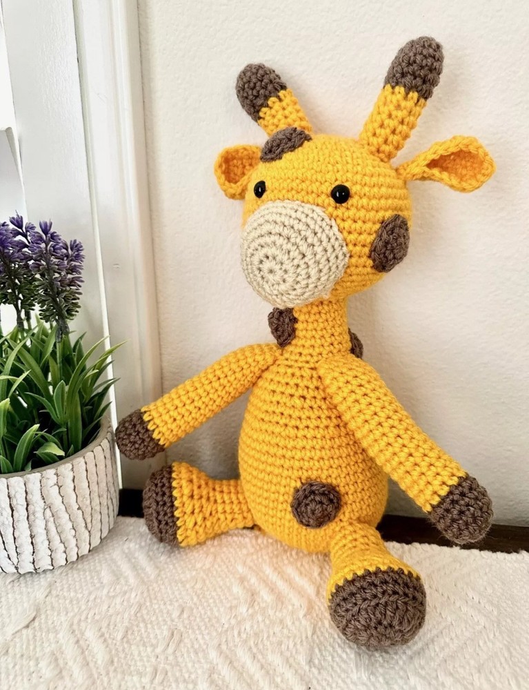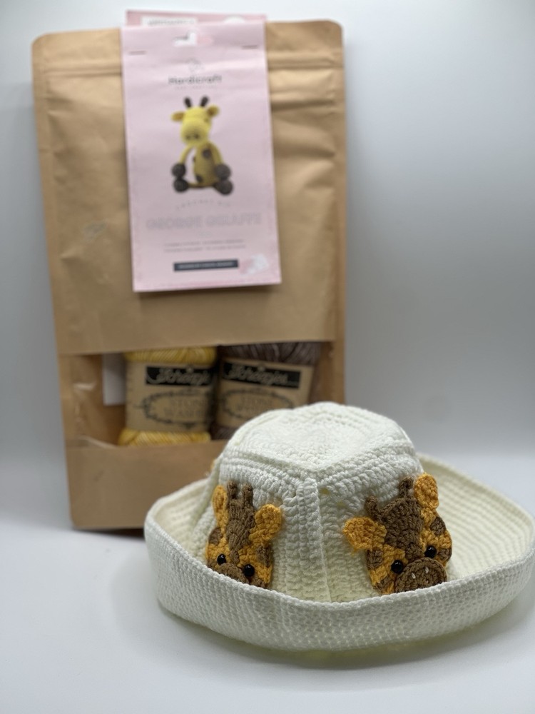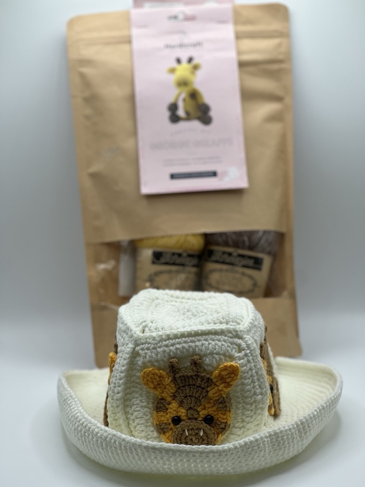 The product is a HardiCraft Do It Yourself Crochet Kit for making a George Giraffe and a new already made knitted giraffe hat. The kit includes materials to make one unit, referring to the giraffe and the hat is already completed. The brand, HardiCraft, is known for providing high-quality crochet kits and this particular kit is made in the Netherlands. It offers an opportunity for crafting enthusiasts to create their own adorable giraffe and matching hat through crochet.