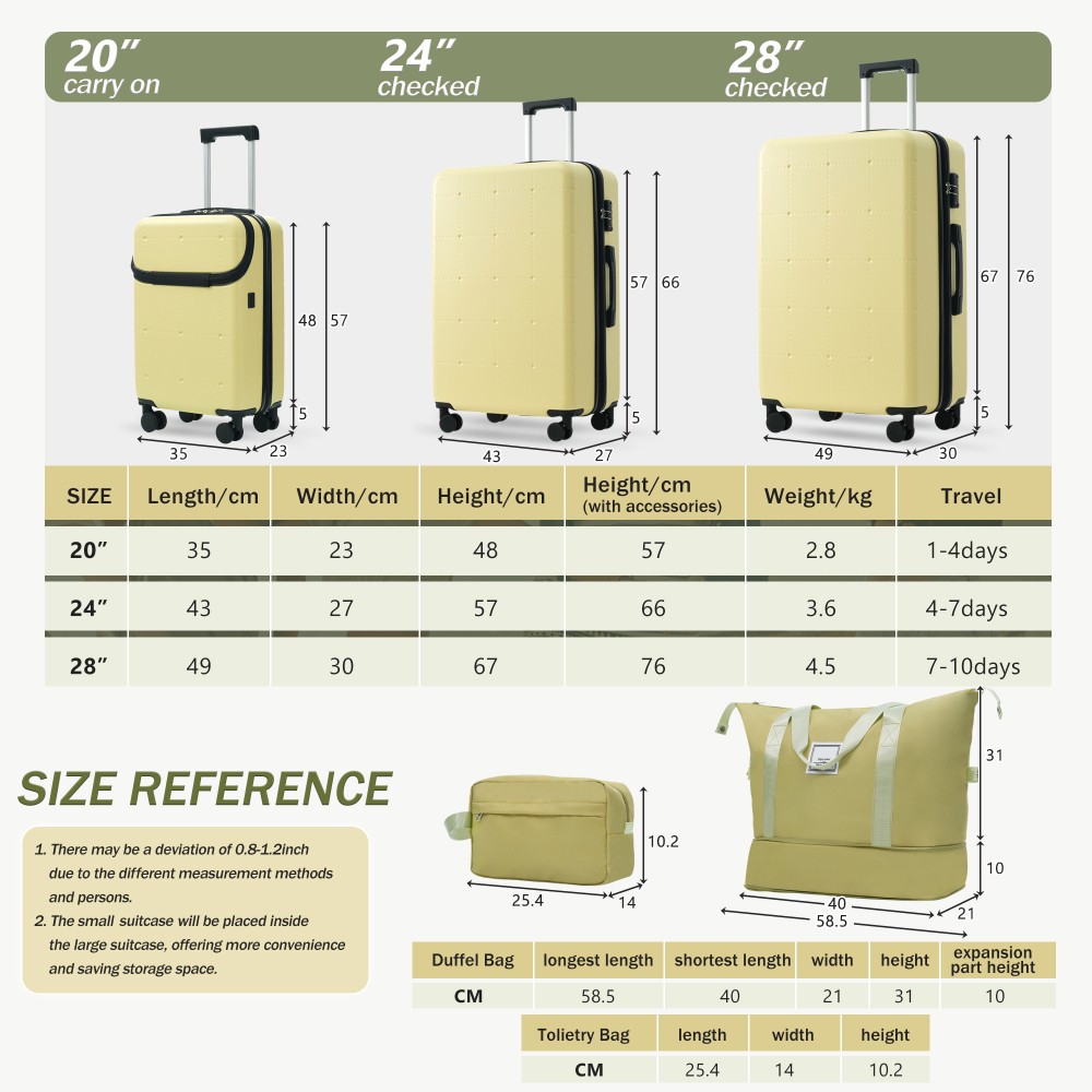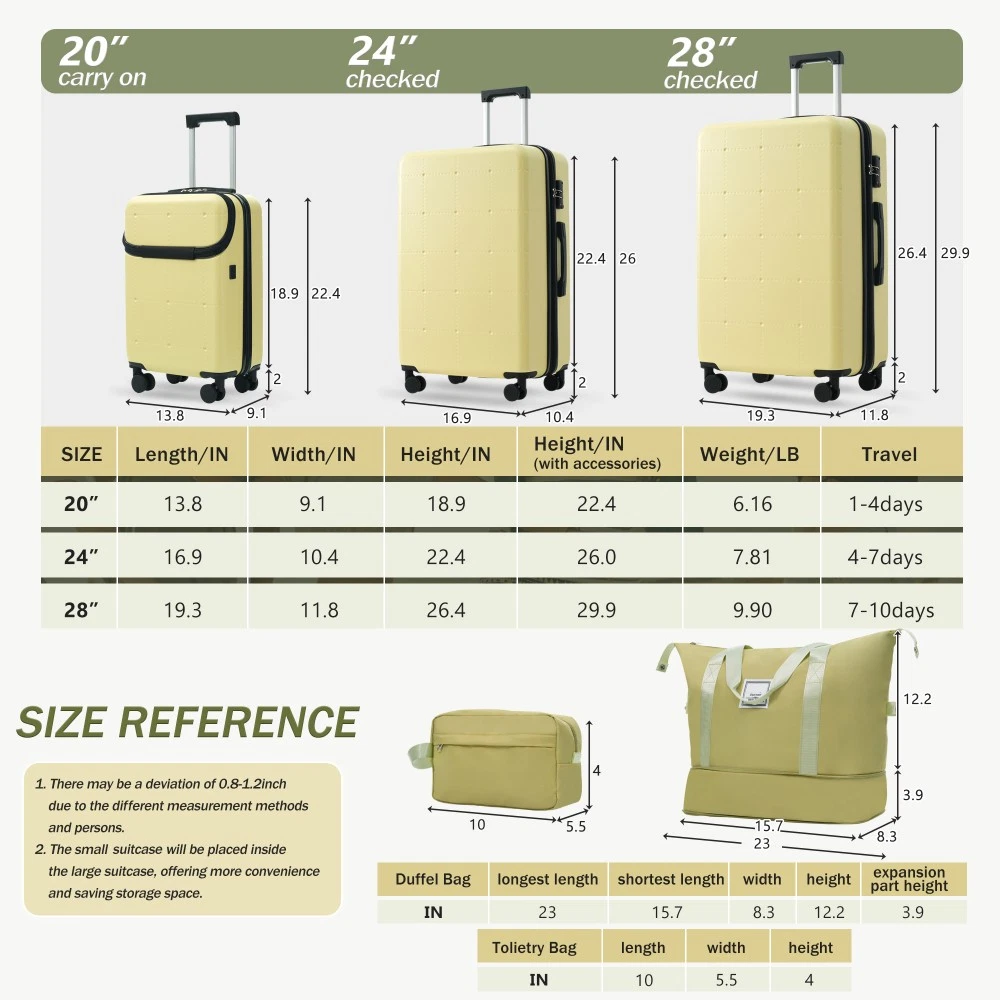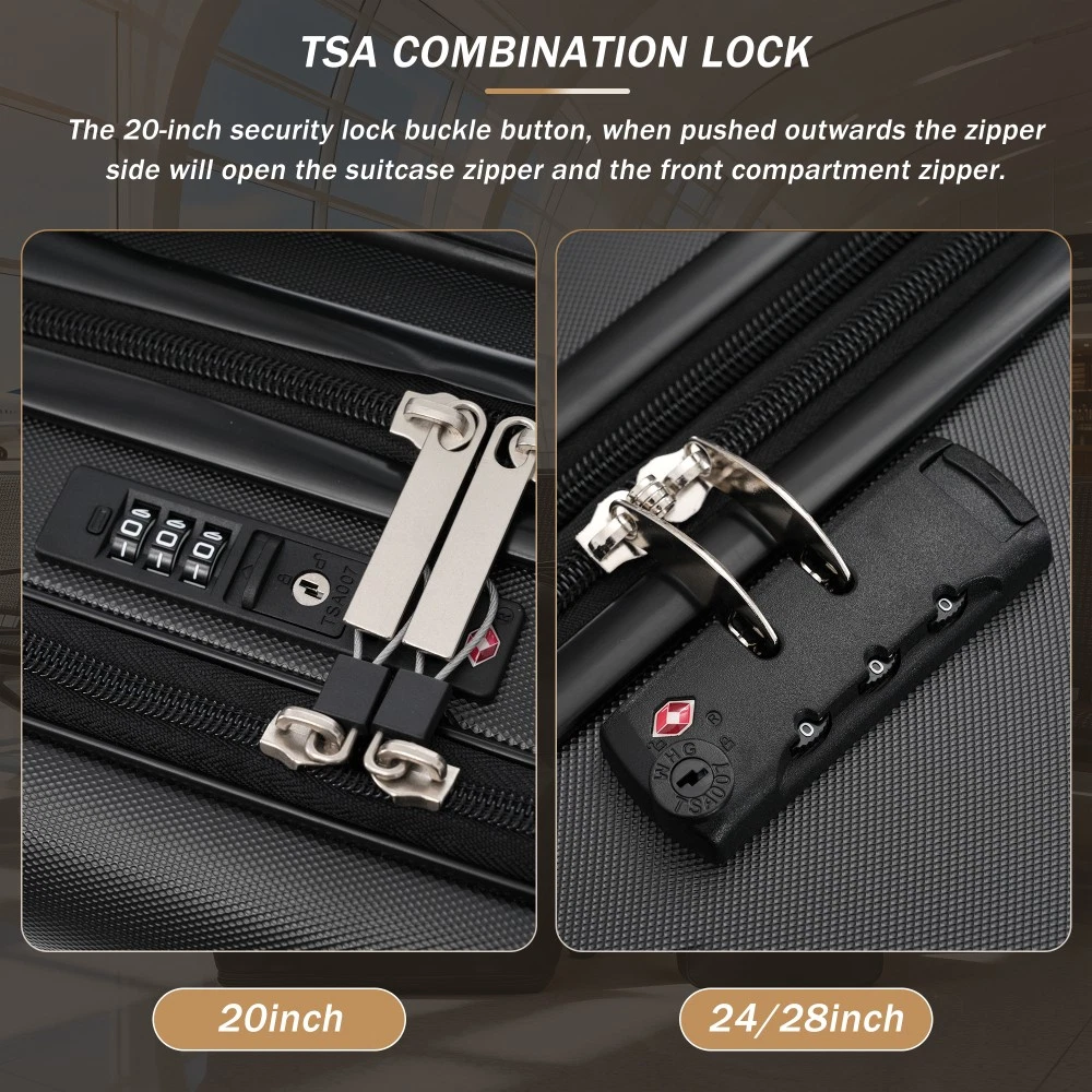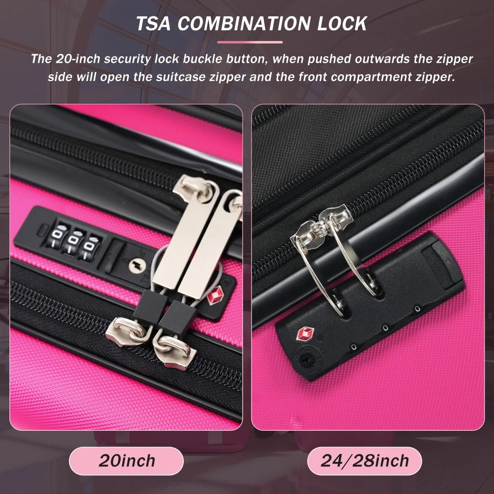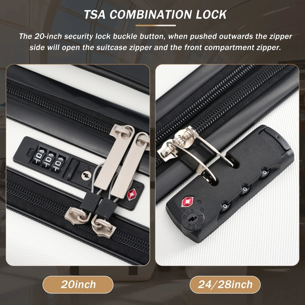 Durable Material: Crafted from high-quality ABS, this 5-piece luggage set includes 20"(half-opening)24" (common) and 28"(common) suitcases and 1 duffel bag & 1 toiletry bag that are lightweight .The matching bags are made of tightly crafted fabric, adding more convenience to your travel. 20 Carry on Luggage: The 20-inch carry-on is ideal for short trips, built-in USB port and data cable for charging devices on the go (power supply not included). The front half-opening design allows you to carry computers, ipads and other items with easy access. Expandable Space (24"+28" ): The 24-inch & 28-inchsuitcase offer more expandable space, giving you more room for packing when you need it most, ideal for longer trips or extra belongings. Safe: Our 3-piece luggage sets are equipped with explosion-proof double zippers, offering an additional storage space. The TSA lock is designed to avoid violent damage to the luggage, which allows only customs agents to inspect your bags without damaging the lock when traveling. Travel Luggage Accessories: Duffel bag can be used to organize and store personal items for easy portability. The luggage bag has a pocket on the back that can be put on the luggage handle, which is very convenient for travel. We have perfected our hard case luggage collections, with high quality material molded body coveted. Instructions for Reset the 3 Digit Secure TSA Lock--20 inch The original combination is 0-0-0. To set your own combination, please follow these steps: 1) With the lock in the 0-0-0 position. 2) Press down the reset button [A] with a pen or other tool until you hear a "click"sound. 3) Set your own combination by turning the dials [B]. For example, 8-8-8. 4) Push the button [C] in the direction of the arrow until you hear the "click"sound again, confirming that you have set your personal combination. Instructions for Reset the 3 Digit Secure TSA Lock--24 & 28 inch 1. The initial password of lock is 0-0-0. 2.Press the reset hole with the tip of the pen. 3.Set the new 3-digit code while pressing. 4.Now you can open the lock with the new password.