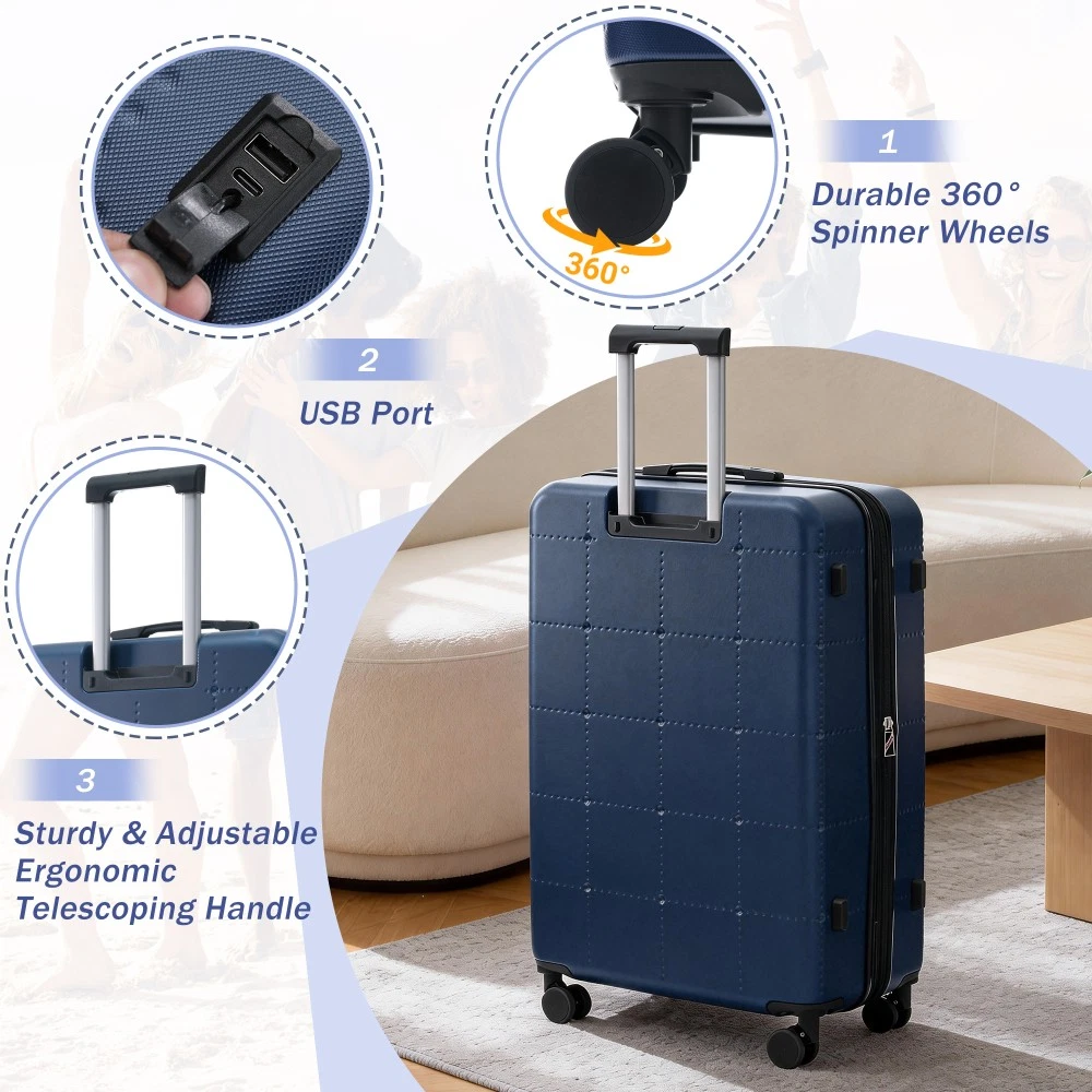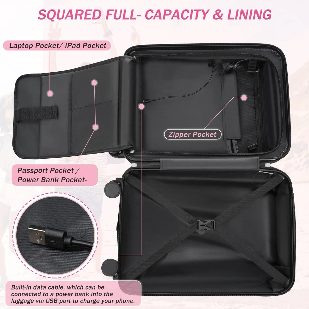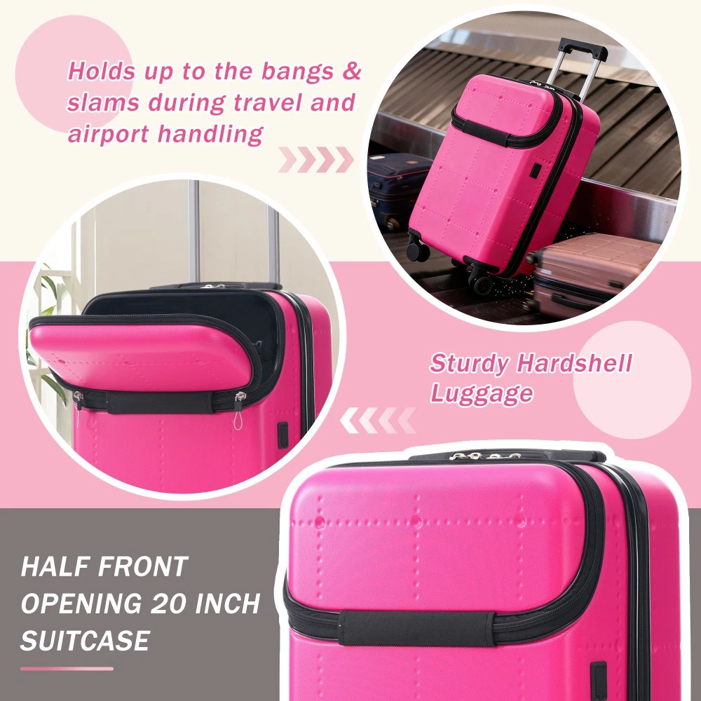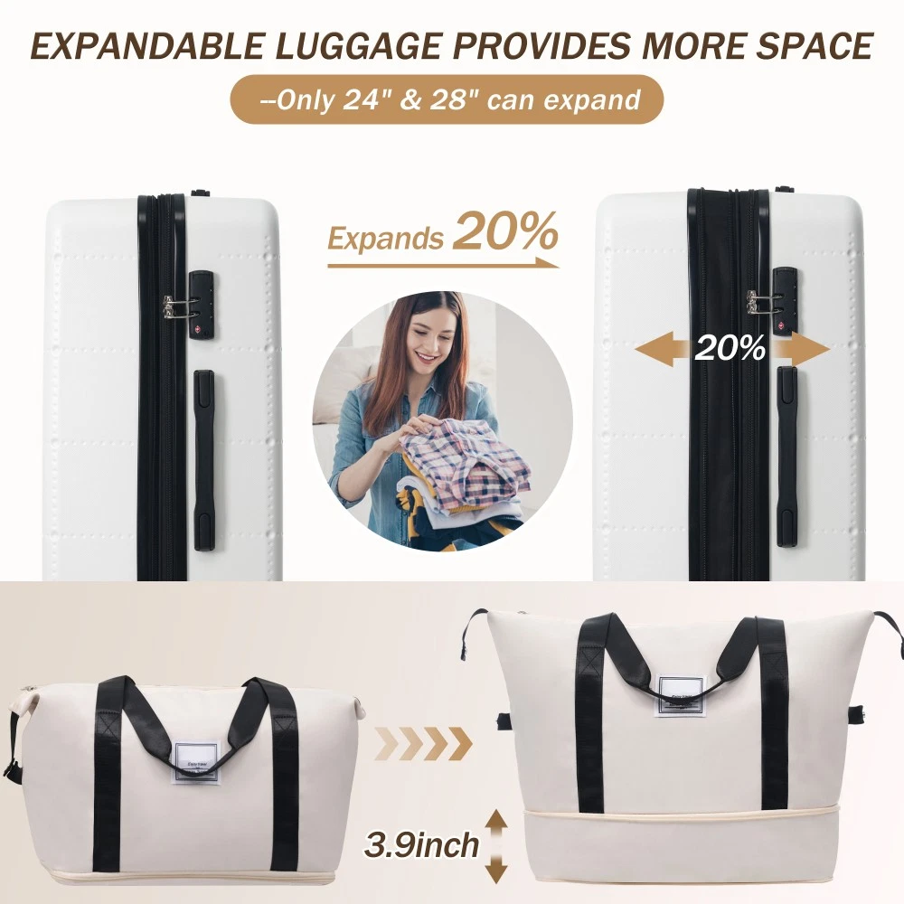 Durable Material: Crafted from high-quality ABS, this 5-piece luggage set includes 20"(half-opening)24" (common) and 28"(common) suitcases and 1 duffel bag & 1 toiletry bag that are lightweight .The matching bags are made of tightly crafted fabric, adding more convenience to your travel. 20 Carry on Luggage: The 20-inch carry-on is ideal for short trips, built-in USB port and data cable for charging devices on the go (power supply not included). The front half-opening design allows you to carry computers, ipads and other items with easy access. Expandable Space (24"+28" ): The 24-inch & 28-inchsuitcase offer more expandable space, giving you more room for packing when you need it most, ideal for longer trips or extra belongings. Safe: Our 3-piece luggage sets are equipped with explosion-proof double zippers, offering an additional storage space. The TSA lock is designed to avoid violent damage to the luggage, which allows only customs agents to inspect your bags without damaging the lock when traveling. Travel Luggage Accessories: Duffel bag can be used to organize and store personal items for easy portability. The luggage bag has a pocket on the back that can be put on the luggage handle, which is very convenient for travel. We have perfected our hard case luggage collections, with high quality material molded body coveted. Instructions for Reset the 3 Digit Secure TSA Lock--20 inch The original combination is 0-0-0. To set your own combination, please follow these steps: 1) With the lock in the 0-0-0 position. 2) Press down the reset button [A] with a pen or other tool until you hear a "click"sound. 3) Set your own combination by turning the dials [B]. For example, 8-8-8. 4) Push the button [C] in the direction of the arrow until you hear the "click"sound again, confirming that you have set your personal combination. Instructions for Reset the 3 Digit Secure TSA Lock--24 & 28 inch 1. The initial password of lock is 0-0-0. 2.Press the reset hole with the tip of the pen. 3.Set the new 3-digit code while pressing. 4.Now you can open the lock with the new password.
