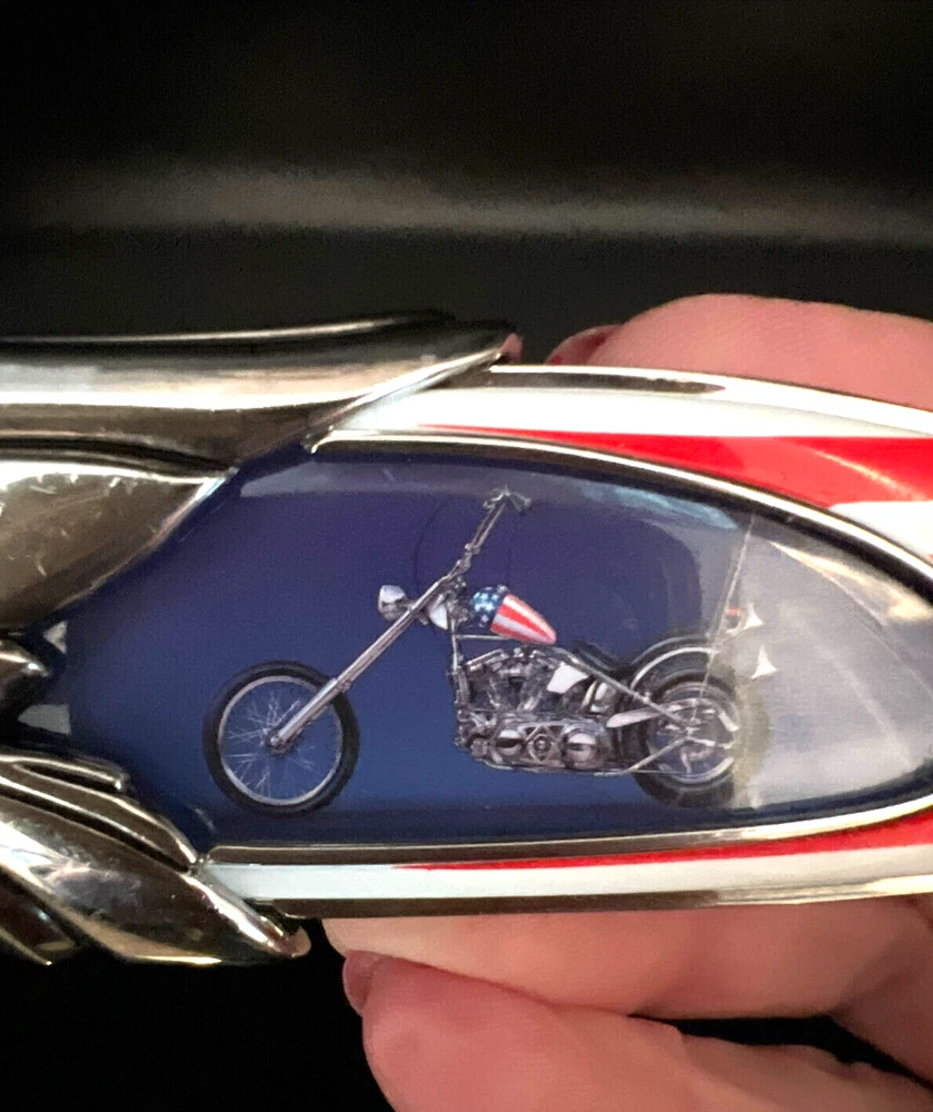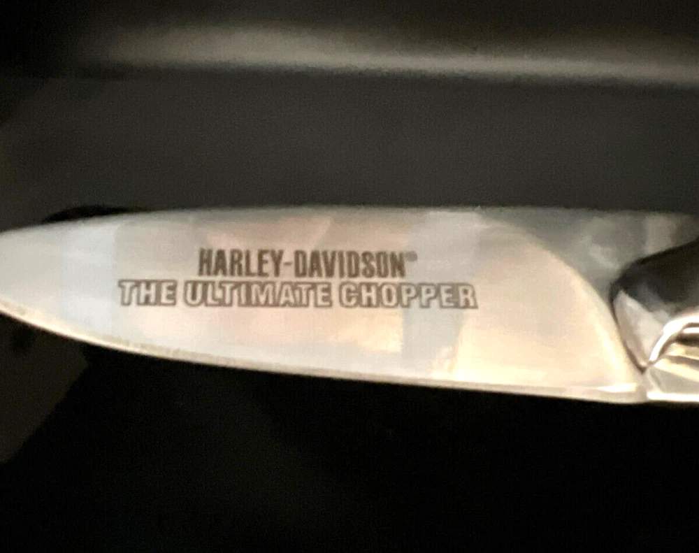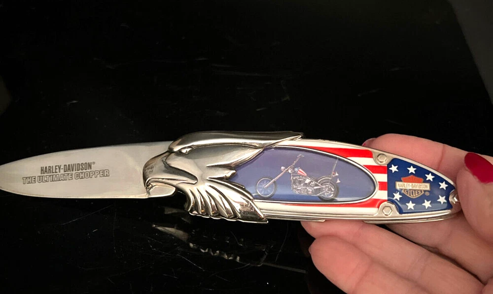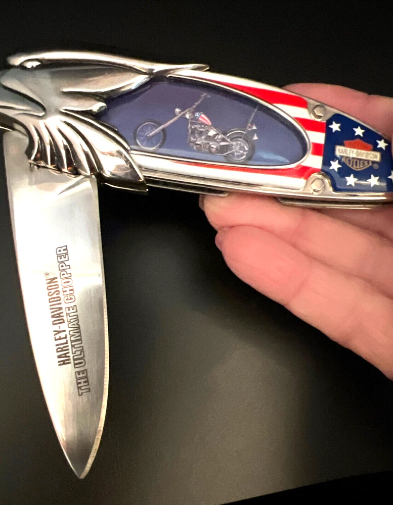 This Harley Davidson Series pocketknife by Franklin Mint is a must-have for any collector or fan of the iconic brand. The knife features a multi-colored handle and a plain edge stainless steel blade with a spear point. It is manually opened and has one blade. The handle is made of plastic and the knife is an original, not a reproduction. This knife is part of the Easy Rider Collector series and is perfect for display or use. The knife is a great addition to any collection and is sure to impress any fan of Harley Davidson. This knife has not been used and i in very nice condition I will pack with care and get it to you ASAP Thank you for looking !