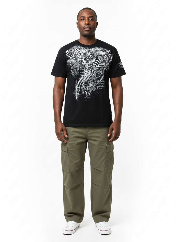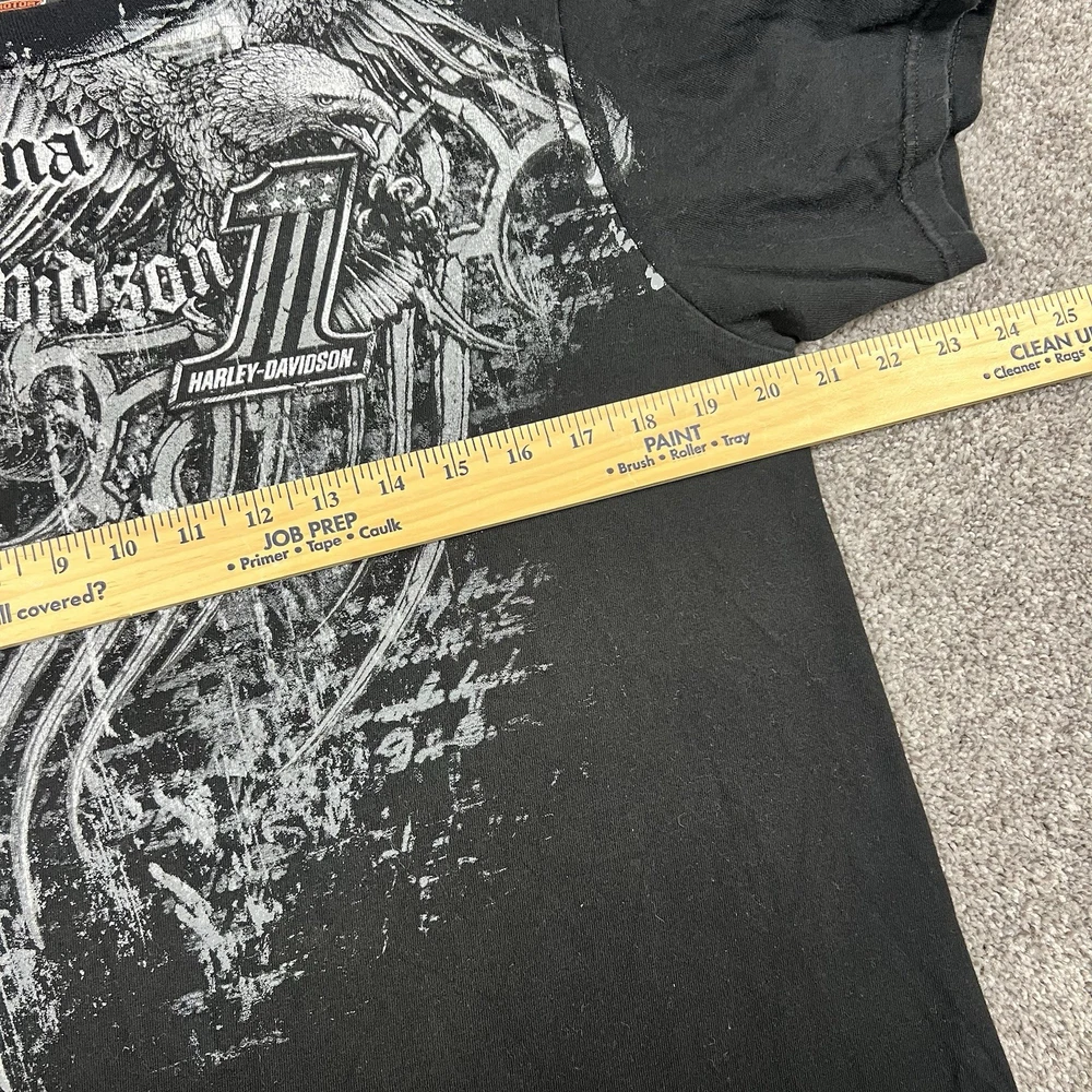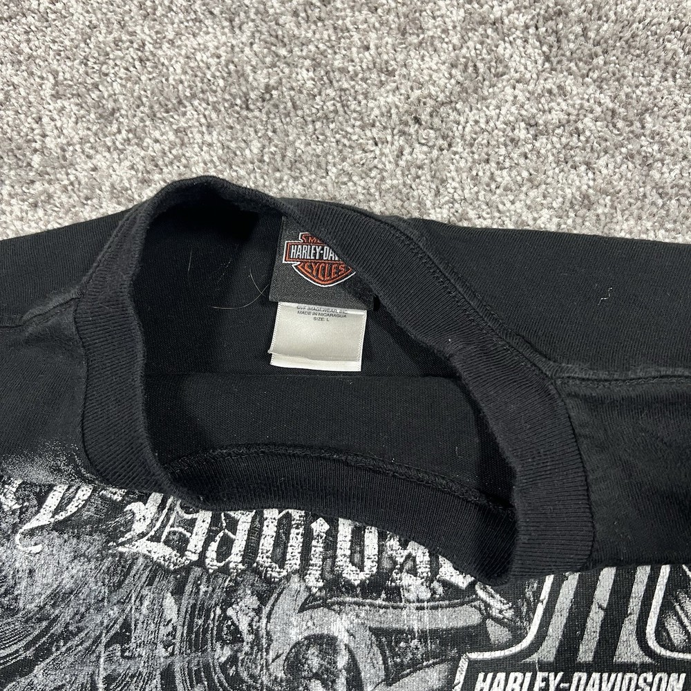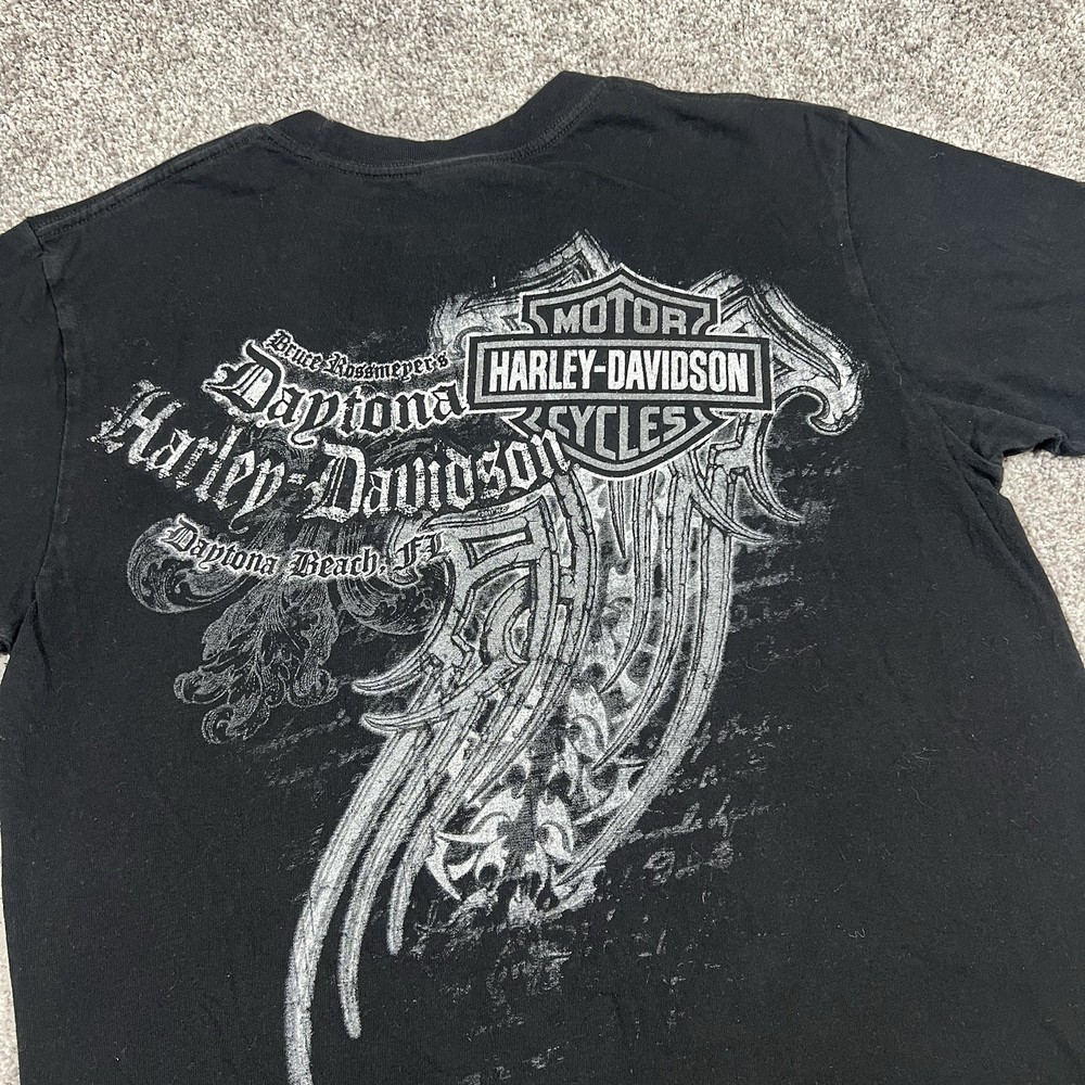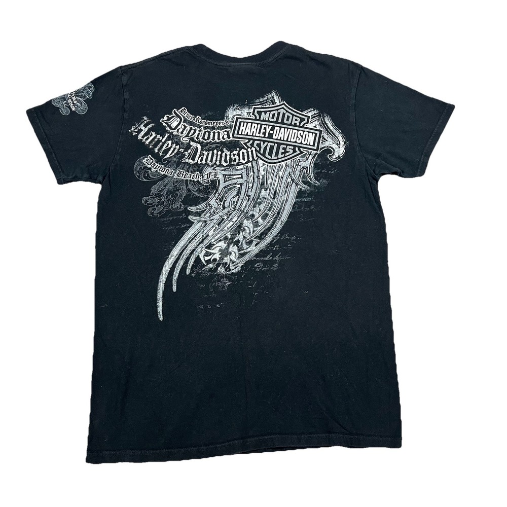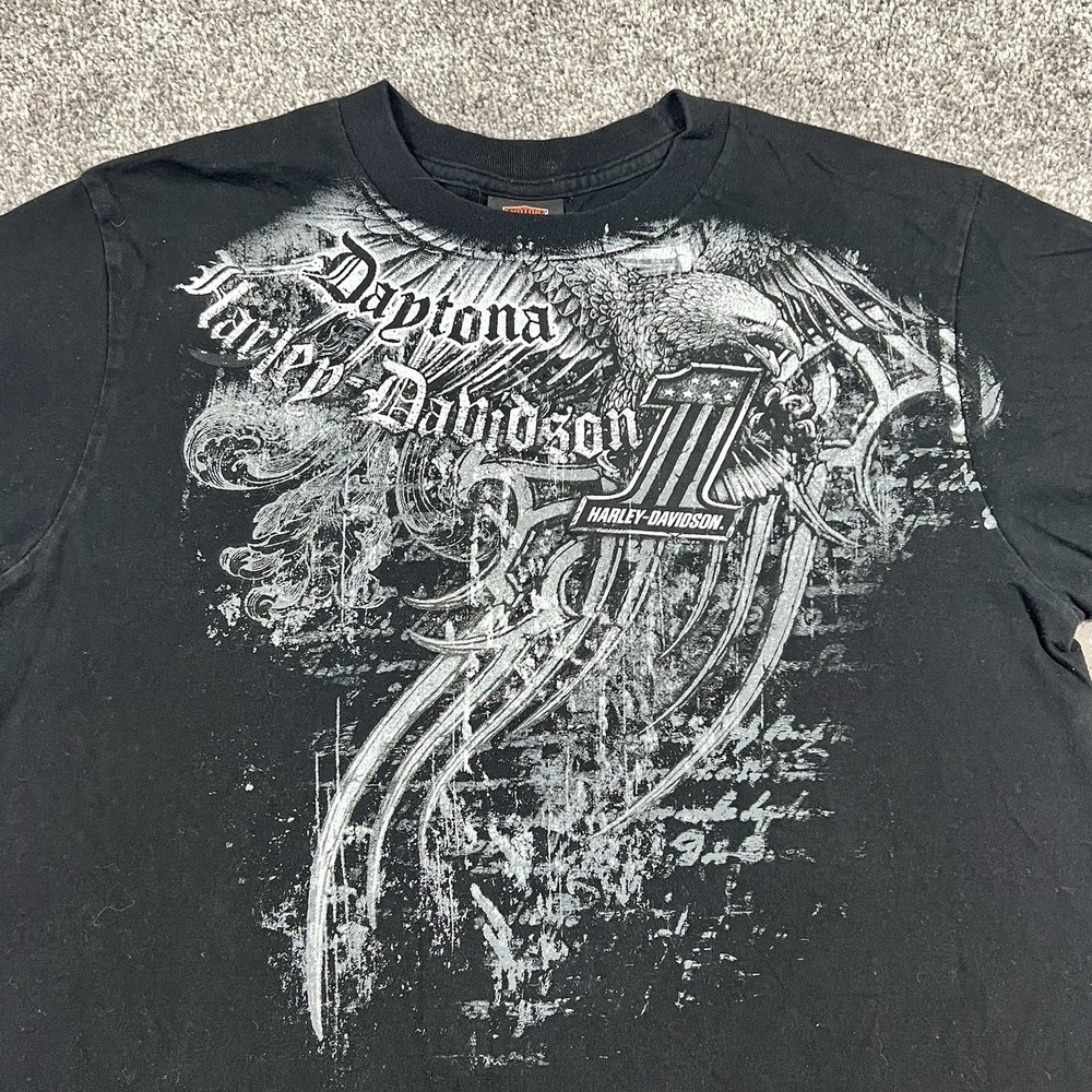 The Harley Davidson Medium T Shirt in Grunge Y2K Black Sleeve Logo design is a stylish and edgy addition to any man's wardrobe. Featuring the iconic Harley-Davidson logo on the sleeve, this regular fit T-shirt in size M is perfect for those who appreciate a grunge-inspired look. The black color adds a classic touch to the overall design, making it versatile for various casual outfits. Ideal for fans of the legendary motorcycle brand, this T-shirt captures the rebellious spirit of y2k grunge fashion.