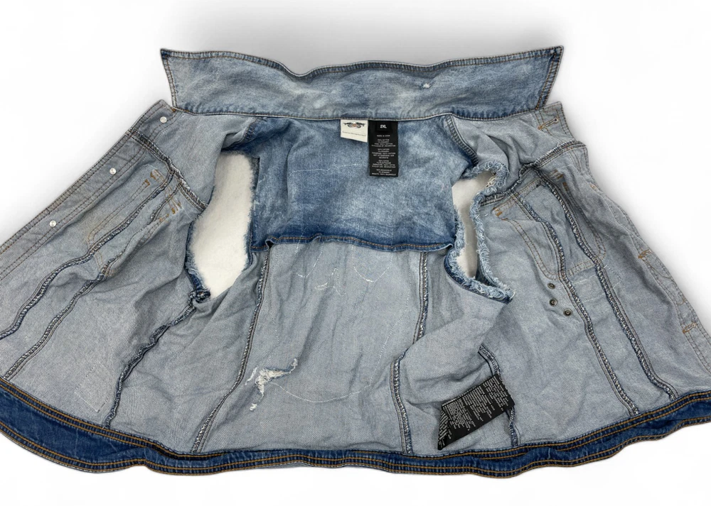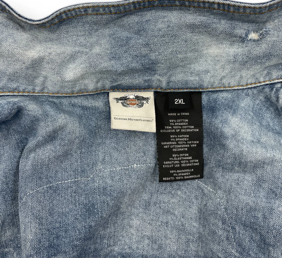 Closure: Button Fit: Regular Pattern: Solid Size: 2XL Sleeve Length: Sleeveless Features: Breathable, Pockets Department: Women Season: Fall, Spring, Summer, Winter Outer Shell Material: Cotton Accents: Logo Type: Jacket Size Type: Regular Style: Biker Brand: Harley-Davidson Theme: Biker Occasion: Casual Color: Blue