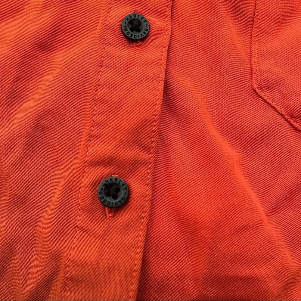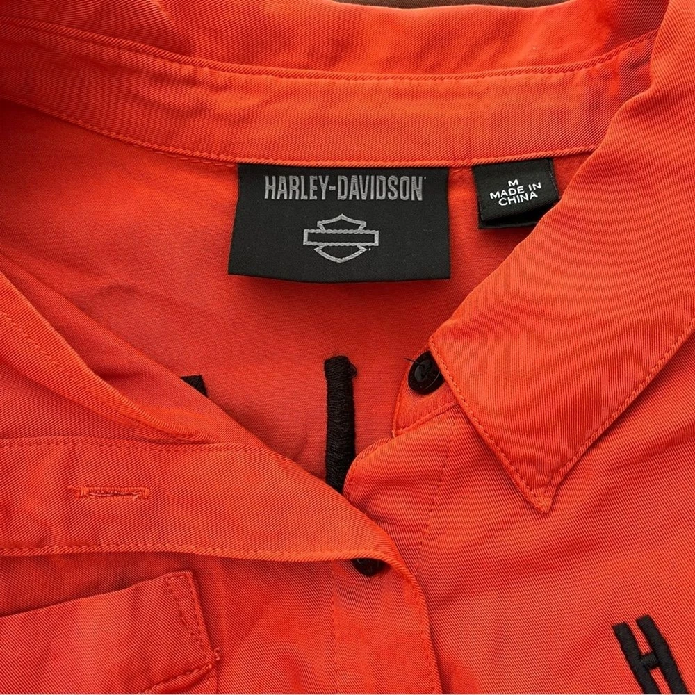 This Harley-Davidson button-up top is a must-have for any fan of the brand. It features a striking orange and black color scheme that is sure to turn heads. The top is made for unisex adults in a regular size medium and is perfect for wearing on any occasion. The top is made with high-quality materials and features the iconic Harley-Davidson logo on the front. It is perfect for anyone who wants to show off their love for the brand. This item is a great addition to any wardrobe and is sure to be a favorite for years to come. Harley Davidson button front top women’s medium orange black Sleeveless Collared Flowy fit and soft fabric Dip dyed look that goes from orange to black Embroidered on front and back with Harley Davidson motorcycles Like new All items ship the next business day! I love offers & give generous discounts on bundles