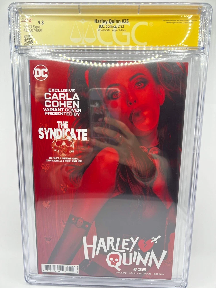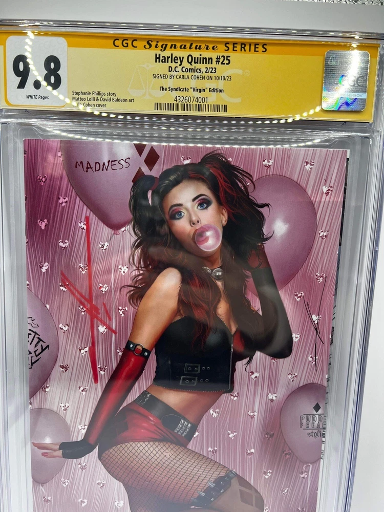 This is a highly sought-after Harley Quinn #25 Virgin Edition Variant comic book, signed by the respected Carla Cohen and graded 9.8 Near Mint/Mint by Certified Guaranty Company (CGC). The cover art is also done by Carla Cohen, adding a unique value to the comic. This is a US Comics tradition publication with a certification number of 4326074001, which assures its authenticity. The comic book is from 2023, belonging to the Modern Age (1992-Now) era, and is a must-have for comic book collectors and fans of Harley Quinn. The autograph authentication number is the same as the certification number, and the professional grader is also CGC. This piece is perfect for those who want to add a valuable and unique item to their collection.
