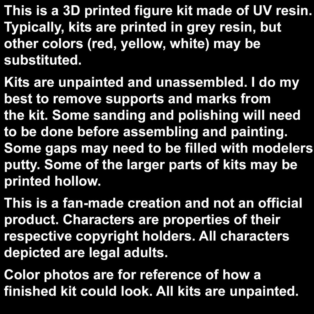 This is an unpainted, unassembled kit draws from the cosplay community to depict an adult lesbian couple dressed as Harly and Barbara engaged in consensual BDSM play. The kit has a choice of sizes 150mm 1/12 scale 100mm 1/18 scale 75mm 1/24 scale Note: This is a fan-made creation and not an official product. Characters are properties of their respective copyright holders. Everything is made and shipped from the United States. Thank you for supporting a veteran-owned studio. This is a 3D printed figure kit made of UV resin. Typically, kits are printed in grey resin, but other colors (red, yellow, white) may be substituted. Kits are unpainted and unassembled. I do my best to remove supports and marks from the kit. Some sanding and polishing will need to be done before assembling and painting. Some gaps may need to be filled with modelers putty. Some of the larger parts of kits may be printed hollow. This is a fan-made creation and not an official product. Characters are properties of their respective copyright holders. All characters depicted are legal adults. Color photos are for reference of how a finished kits could look. All kits are unpainted.