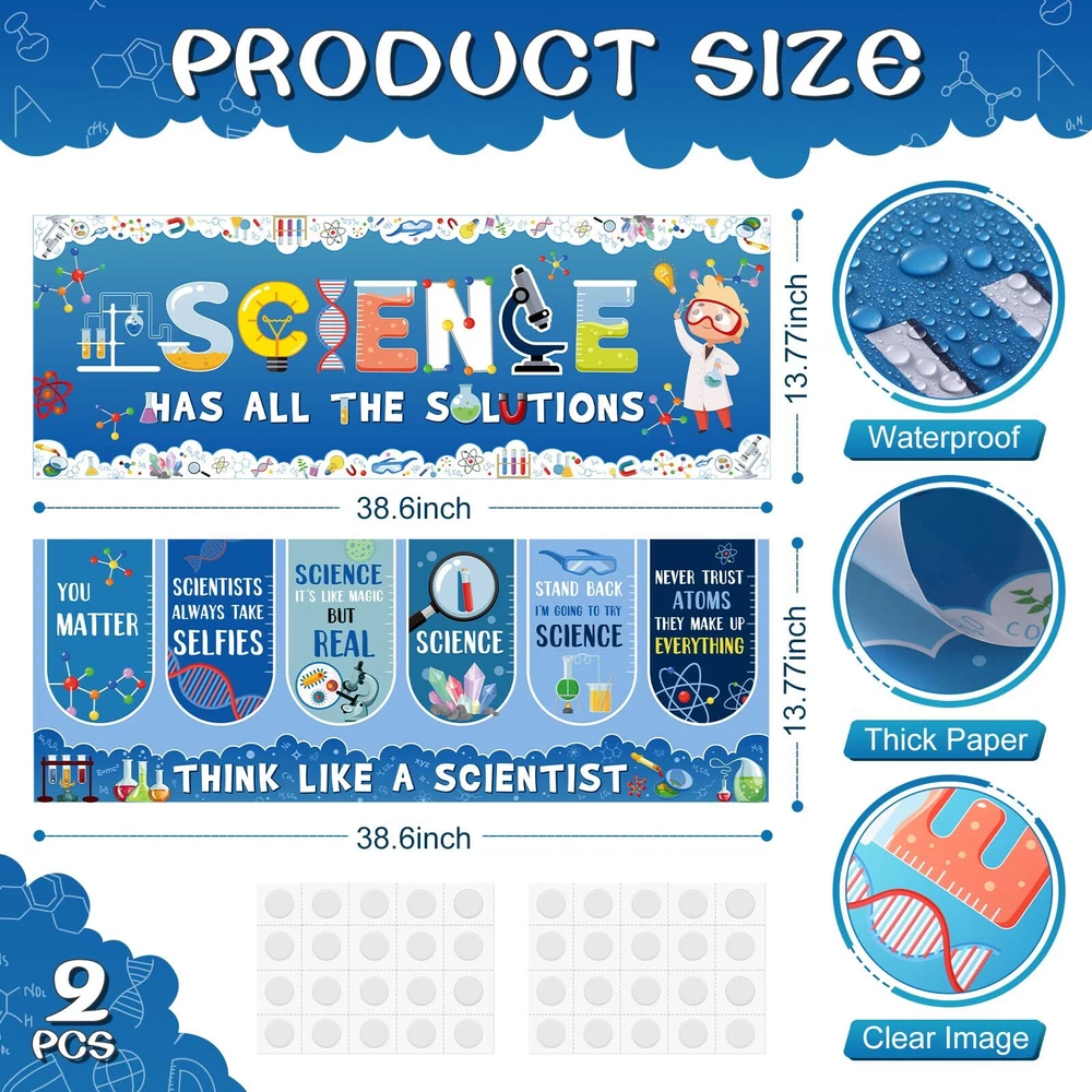 Features: Science classroom decor: Our science posters for classroom come with 2 sheets of adhesive dots, which aid in a quick and easy set up. Hanging these science banners and setting up your event or science decorations becomes a breeze. Get the bright celebration started in no time with our welcome banners. Specifications: Material: paper Color: as the picture shows Size: 13.8x38.6 inch Package includes: 2 x Science welcome banners 2 Sheets adhesive dots Notes: Manual measurement, please allow slight errors on size. The color may exist a slight difference due to different screen displays. Science Classroom Decor: 2 pieces of science banners which come with 2 sheets of adhesive dots to help easily secure the banners at your preferred location, ideal as party decorations or for fostering an appreciative environment in classrooms Classroom Decorations: these science posters for classroom are designed in cute science theme, combining education and decoration, printed colorful lab patterns and science related characters, embody a piece of commemoration with dazzling first day of school party decorations Material: our science bulletin board decor is crafted from paper, not easy to tear or wrinkle and fade resistant; This resilient material ensures your classroom decorations are durable and long lasting, ideal for celebrating and decorating Suitably Sized: each of the science motivational banners measures a substantial size of about 13.8 x 38.6 inches; This generous size makes them an eye catching addition to your party decorations, ensuring they command attention and conversation Multifaceted Celebratory Decoration: classroom cute science decorations cater to various needs, functioning as school decorations or science theme party decorations; Whether it's for a classroom celebration, community event, or a home setting, our banners bring a fitting touch to colorful sciences commemorations