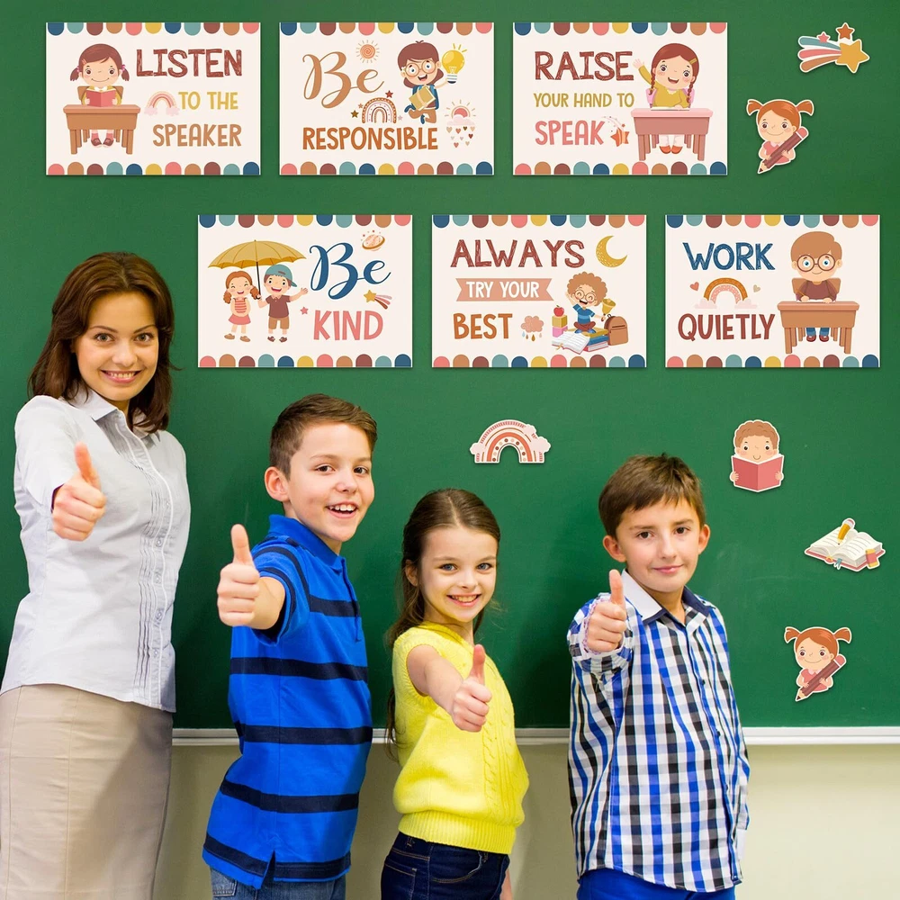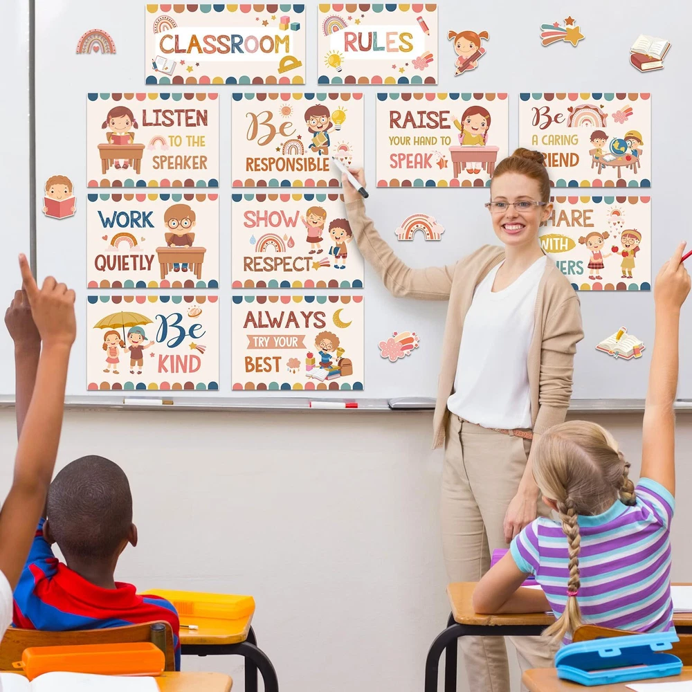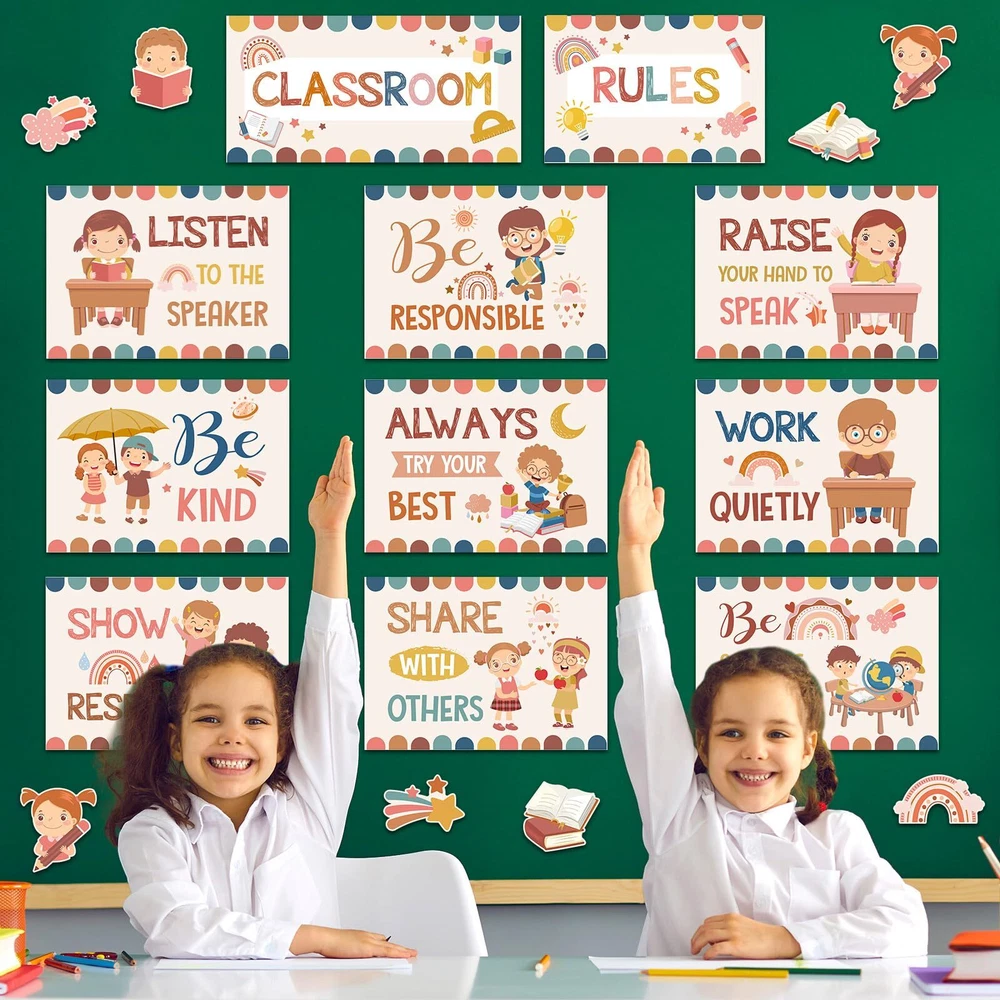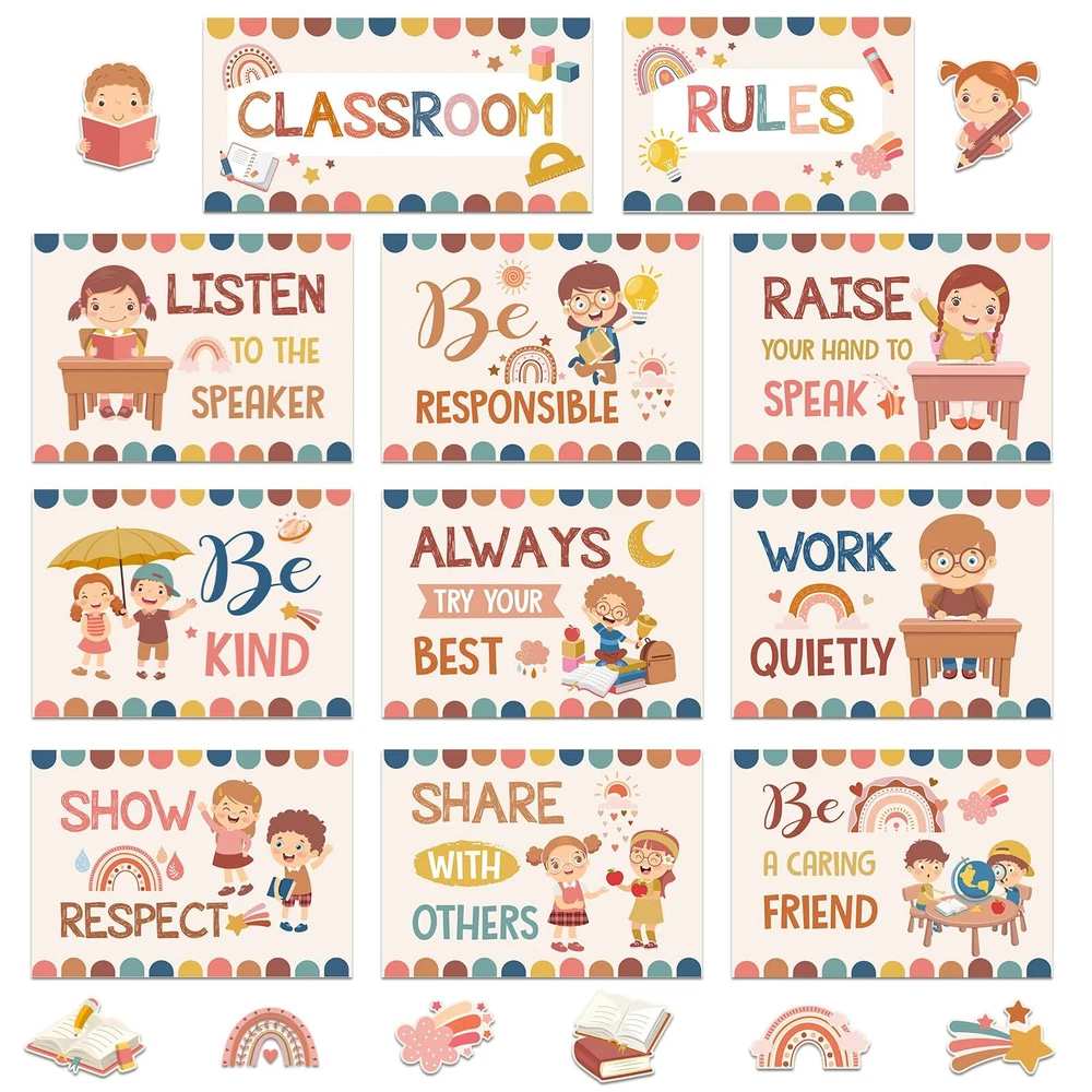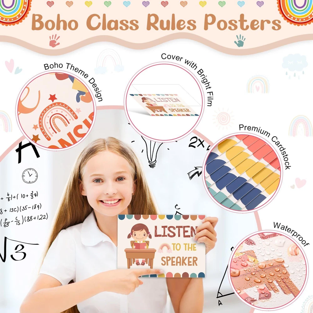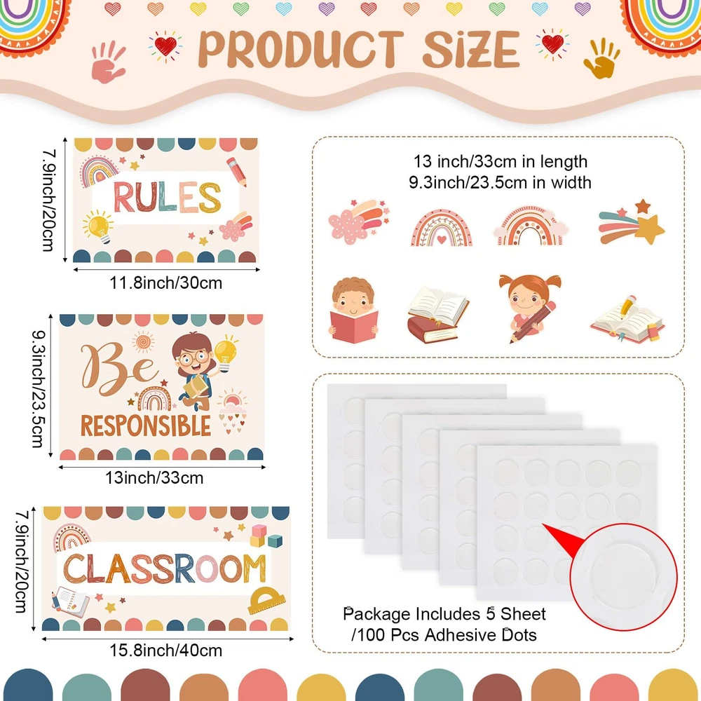 Features: Improve classroom habits: Each class rules poster features encouraging and positive messages, which can reinforce student good behavior and correct their living habits, creating a good environment for children to grow up. Easy to apply: Our class rules bulletin board decorations come with 5 sheets of adhesive dots, so you can easily apply these posters on the wall, and you can also show your creative and artistic talent and arrange them as you wish, decorate your own classroom educational decoration. Specifications: Material: card stock Color: as the picture shows Size: as the picture shows Package includes: 2 x Classroom rules title combined 9 x Classroom rules signs 32 x Pattern decorative paper cut 5 Sheet adhesive dots Notes: Manual measurement, please allow slight errors on size. The color may exist a slight difference due to different screen displays. Small items included, please keep away from little kids to avoid swallowing. Class Rules Decorations: you will get 43 pcs class rules bulletin board decorations, including 2 pcs classroom rules title combined, 9 pcs classroom rules signs and 32 pcs pattern decorative paper cut, come with 5 sheet adhesive dots for easily hanging, sufficient quantity for your classroom wall decoration Boho Theme Design: our classroom rules educational posters are designed with classical bohemian style, printed with rainbow, cloud, heart, the word of [Be Kind], [Share with Others], [Listen to the Speaker] and so on, fun and eye catching, our class rules bulletin board set can bring you refreshing feelings and adding charming beautiful bohemian to your class decoration Reliable Material: positive classroom rules posters are made of quality card stock, sturdy and durable, covered with PET film and waterproof, smooth surface and tear resistant, bright colors and not easy to fade, can serve you for a long time, encourage children to develop good habits Proper Size: the classroom rules title banners measure about 15.8 x 7.9 inch/ 40 x 20 cm and 11.8 x 7.9 inch/ 30 x 20 cm, and the classroom rules sign is 13 x 9.3 inch/ 33 x 23.5 cm, large enough to see the information and attract others' attention, these positive classroom bulletin board can make the classroom learning atmosphere more lively and interesting Wide Applications: these class rules posters set is ideal for elementary, middle, and high school classrooms, can be applied to chalkboard, whiteboard, walls, doors, windows and closet to create stylish classroom projects, which can create a good environment for children to grow up and help the students to enhance a positive attitude