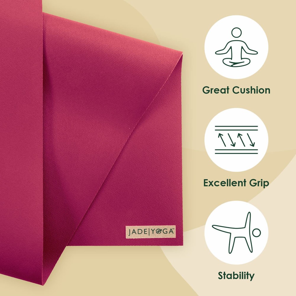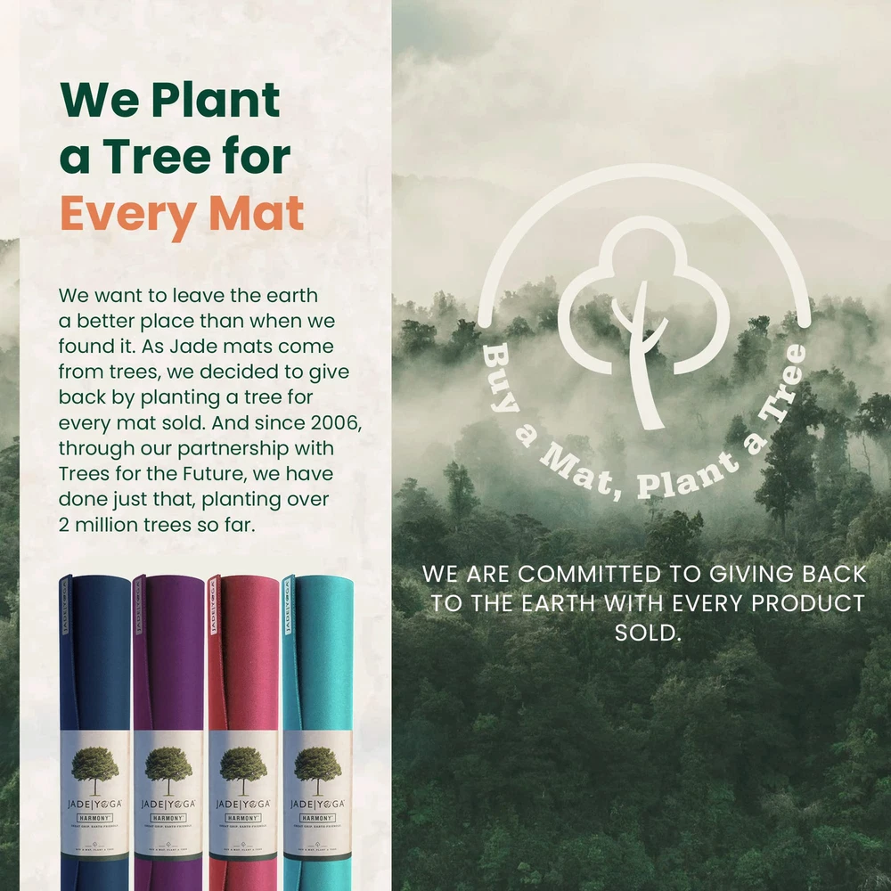 THE PERFECT YOGA MAT: Discover the ultimate yoga experience with the Jade Harmony Yoga Mat. At 3/16'' thick and 24'' wide, this mat strikes the ideal balance of grip, comfort, and weight, making it the top choice of yoga teachers and practitioners worldwide. With its exceptional performance, it provides a satisfying and fulfilling practice session every time. ENHANCED STABILITY AND GRIP: Crafted from natural, open-cell rubber, our mat provides superior cushioning and support compared to synthetic rubber alternatives. The non-slip surface ensures optimal stability, allowing you to maintain poses with confidence and ease. Experience the perfect workout companion that caters to men, women, and eco-conscious individuals seeking a slip-resistant mat. NATURAL MATERIALS: At , we prioritize your well-being and the planet's health. Our mats are meticulously constructed and do not contain PVC, phthalates, heavy metals, and harsh chemicals. In addition to promoting a clean practice, they are easy to clean themselves. We commend using 's plant-based Mat Wash to keep your mat fresh and ready for your next yoga session. SUSTAINABLE RUBBER PRODUCTION: Sustainability lies at the core of 's philosophy. Our mats are proudly made in the USA with imported rubber, carefully sourced to ensure a better future. By using natural rubber tapped from rubber trees, a rapidly renewable resource, we minimize our environmental impact while delivering the highest quality yoga mats. BE THE CHANGE WITH : When you choose , you're not just investing in a premium yoga mat; you're actively contributing to positive change. With every mat sold, we are dedicated to giving back to the earth. We've pledged to plant a tree for each mat purchased. Since 2006, in partnership with Trees for the Future, we have already planted over 2.5 million trees, making a tangible difference in reforestation efforts and preserving our planet for future generations.
