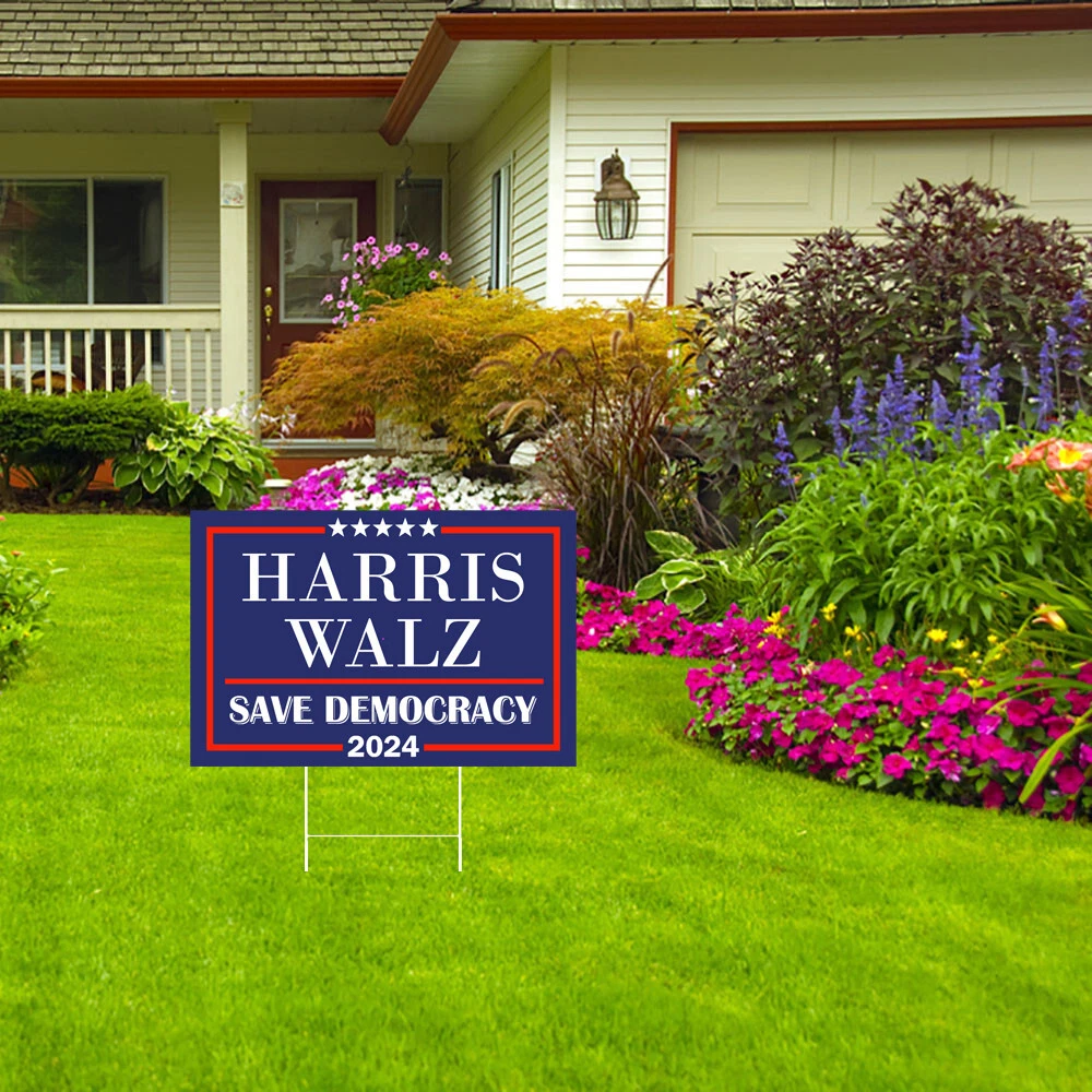 Harris Walz 2024 Yard Sign Double-sided Dimensions : 12x18 inches, perfect for visibility without overwhelming your yard or space. Material : Durable Coroplast, weather-resistant and designed for outdoor use in various climates. Design : Bold, legible text: "Harris Walz 2024" in prominent, eye-catching font. Secondary message: "Save Democracy" in a slightly smaller font to emphasize the campaign’s core message. Color scheme: Patriotic colors (e.g., red, white, and blue) to reflect the American spirit. Versatile Use : Ideal for lawns, gardens, or as a display in windows and public spaces. Easy Installation : Includes metal H-stakes for quick and secure placement in grass or soil. Purpose : Show your support for the Harris Walz 2024 campaign and the movement to protect democratic values.