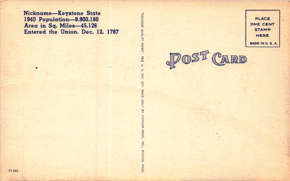 MAKE AN OFFER. THE MORE YOU BUY THE BETTER DEAL I WILL ACCEPT This postcard provides information about the state of Pennsylvania. The state flower is the Mountain Laurel, and the capital is Harrisburg, known as the Keystone State. In 1940, the population was 9,900,180 people, and the state covers an area of 45,126 square miles.