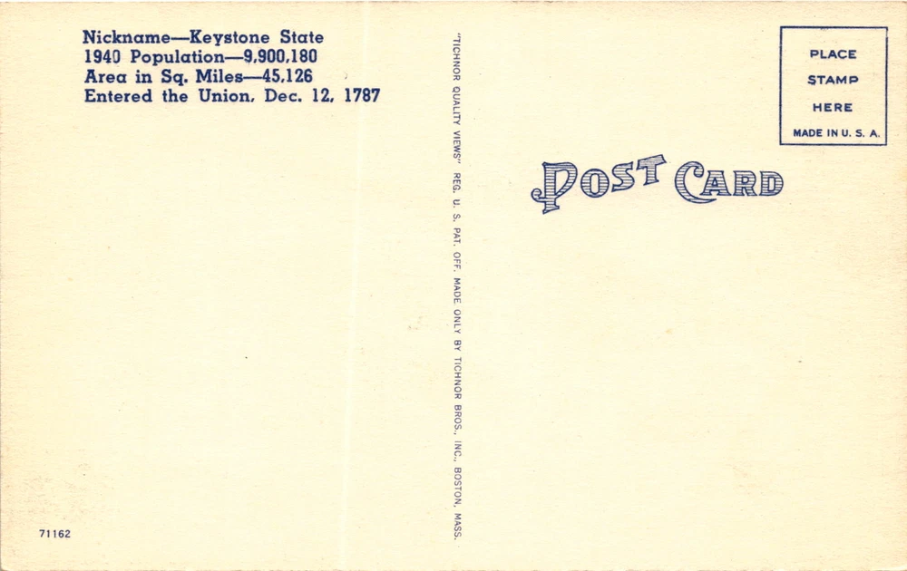 Harrisburg, Keystone State, Dec. 12, 1787, 1940 Population Postcard