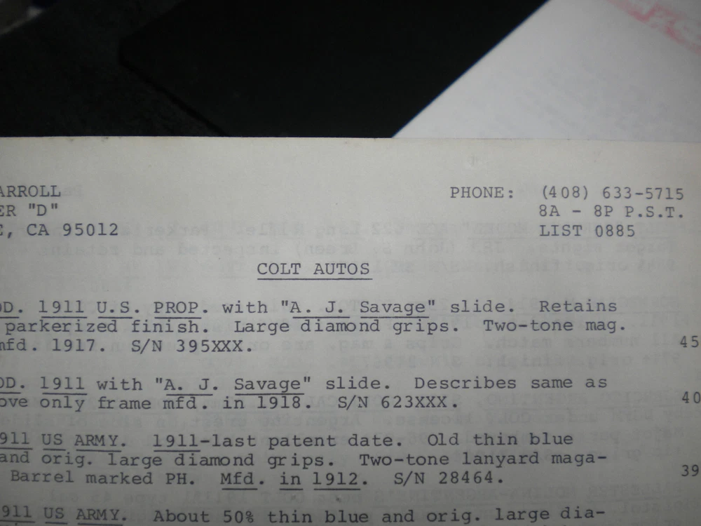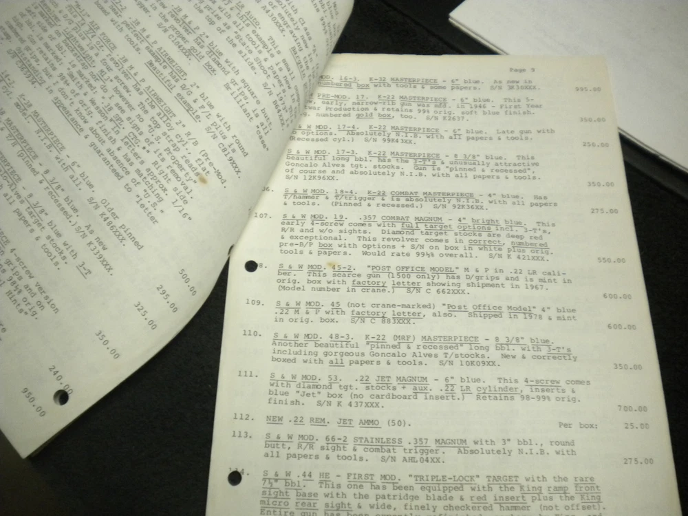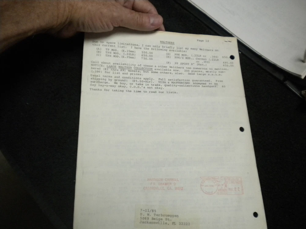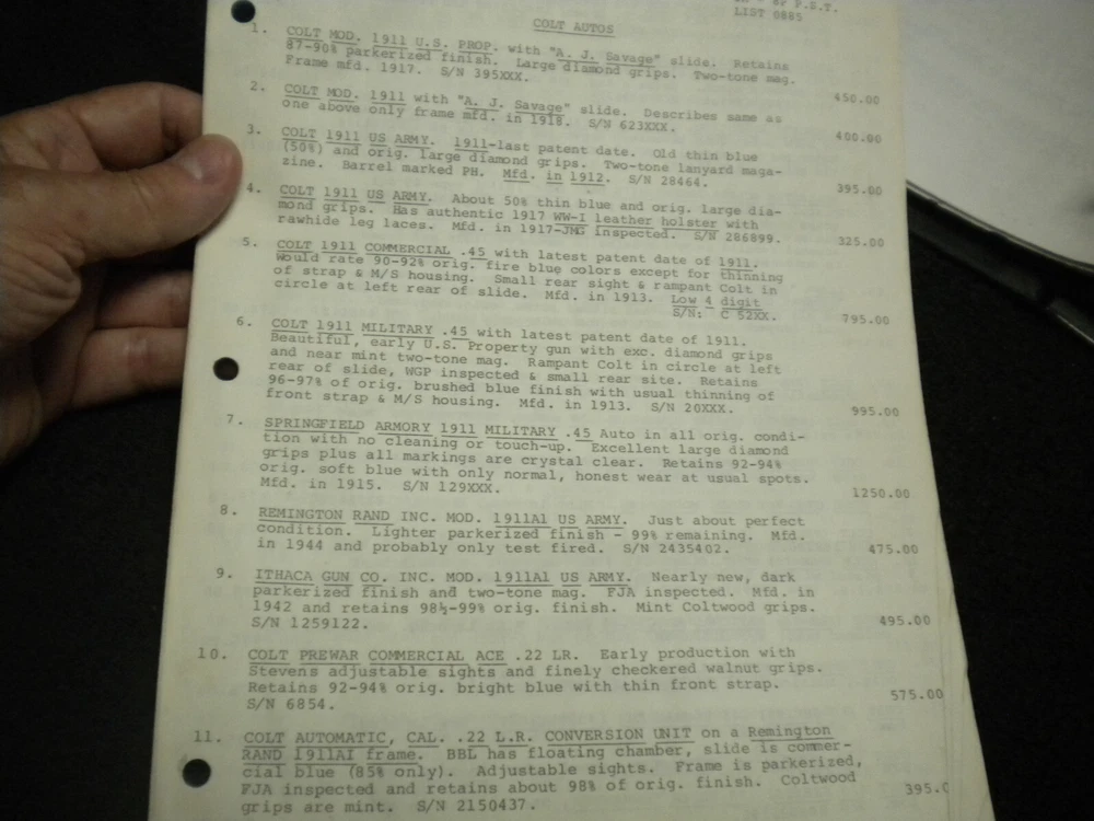 this auction is for a Harrison Carroll List 0885 July 1985 Colt SAAs Colt Autos, S&W , price list used good cond, list shows some wear, the last owner had punched holes and had it stored in a notebook with others, see pictures free shipping