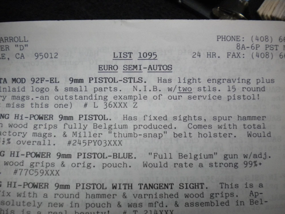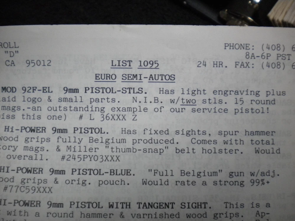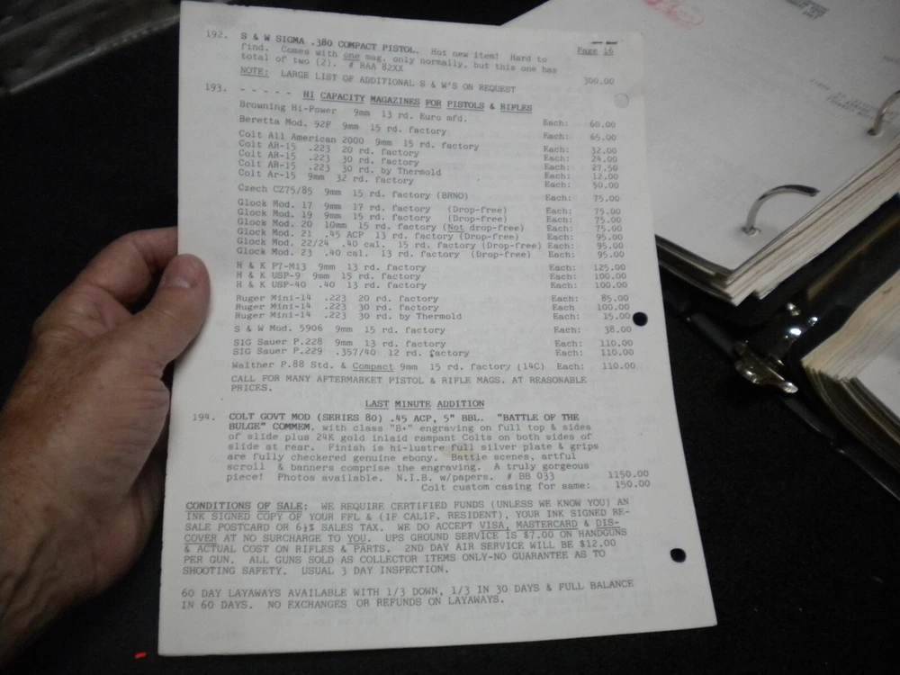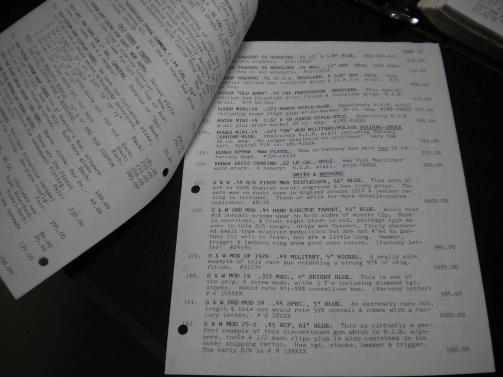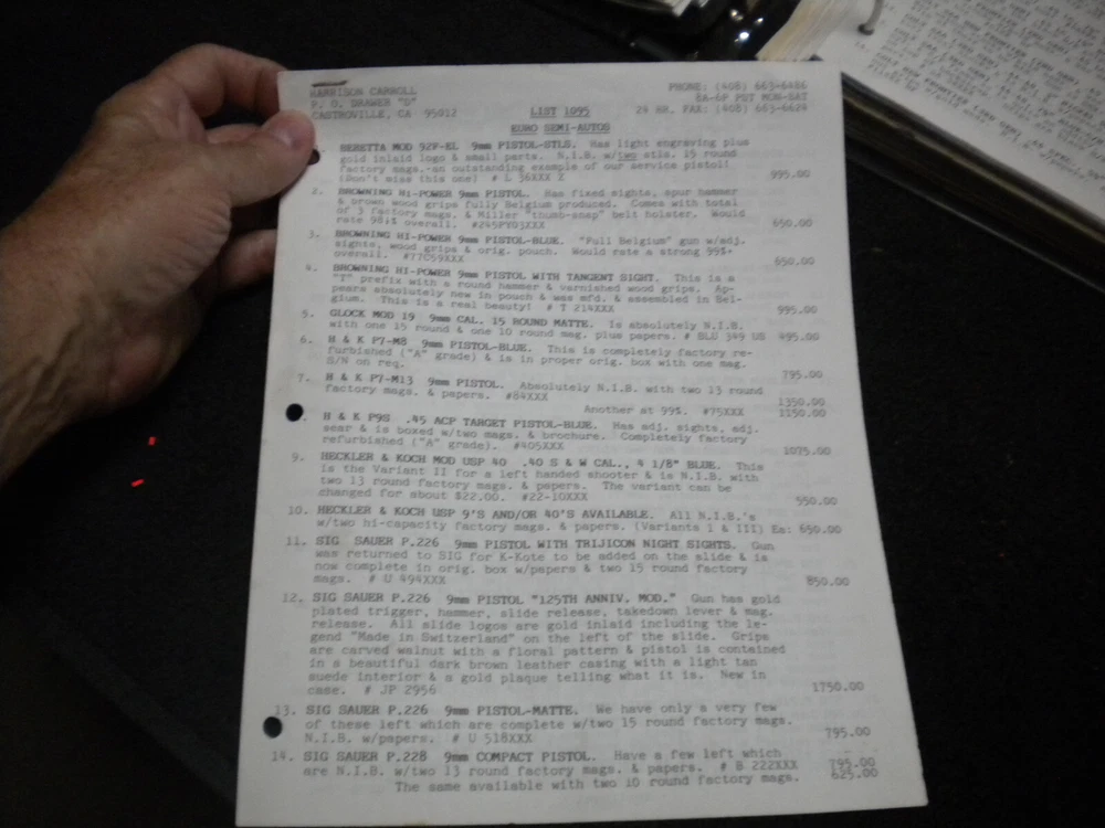 this auction is for a Harrison Carroll List 1095 Colt SAAs, euro pistols , S&W, Price List used good cond, list shows some wear, the last owner had punched holes and had it stored in a notebook with others, see pictures free shipping