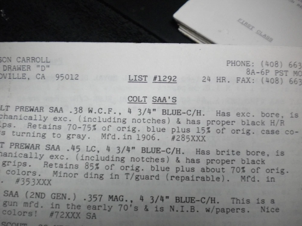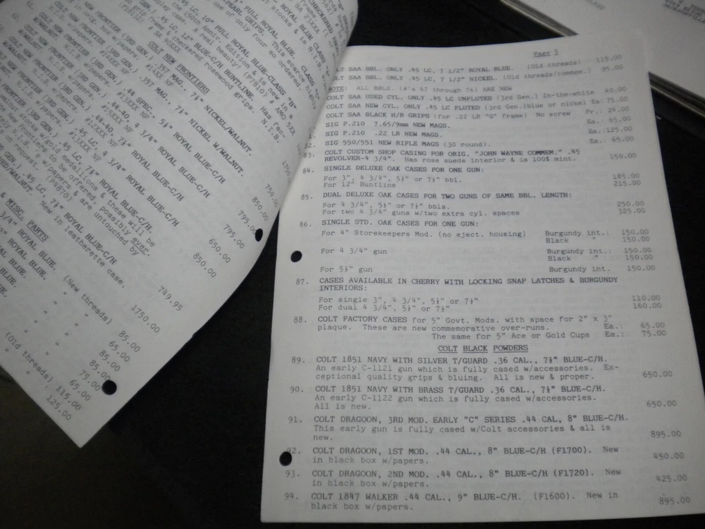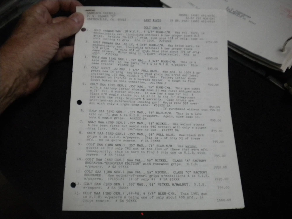 this auction is for a Harrison Carroll List 1292 ,Nov , 1992 Colt SAAs,S&W, Blk powder Price List shows some wear, the last owner had punched holes and had it stored in a notebook with others, see pictures free shipping