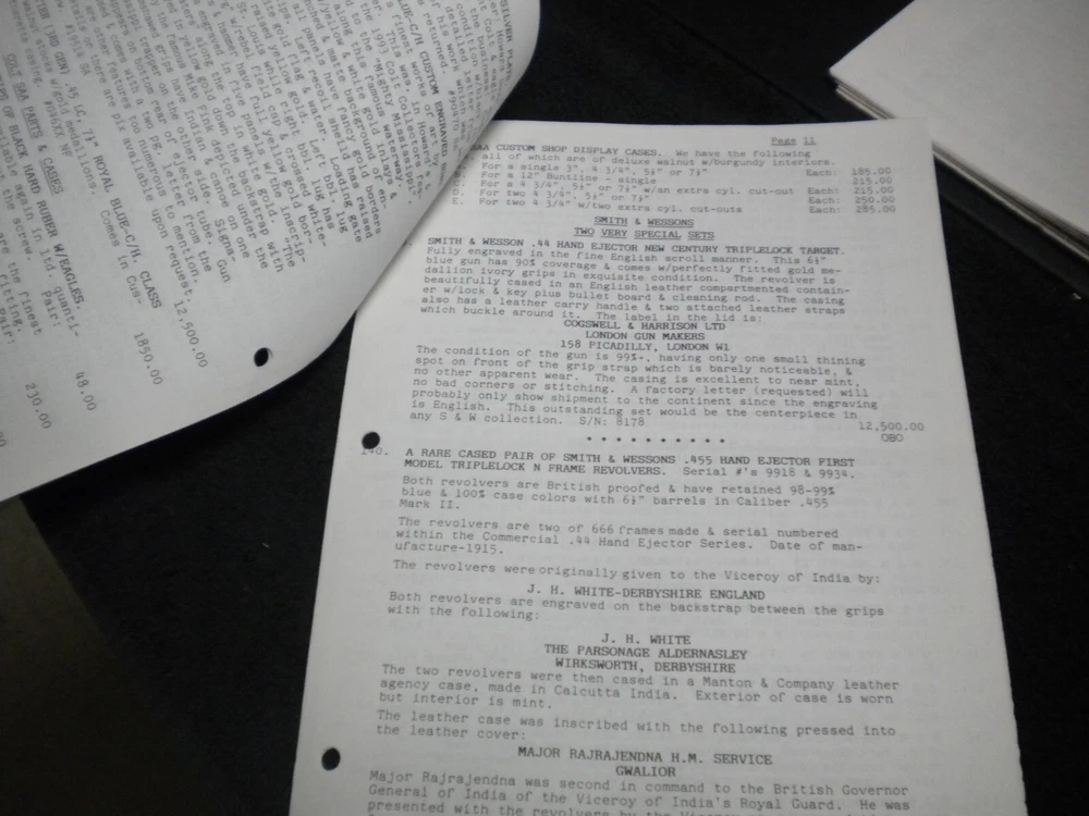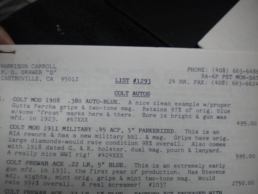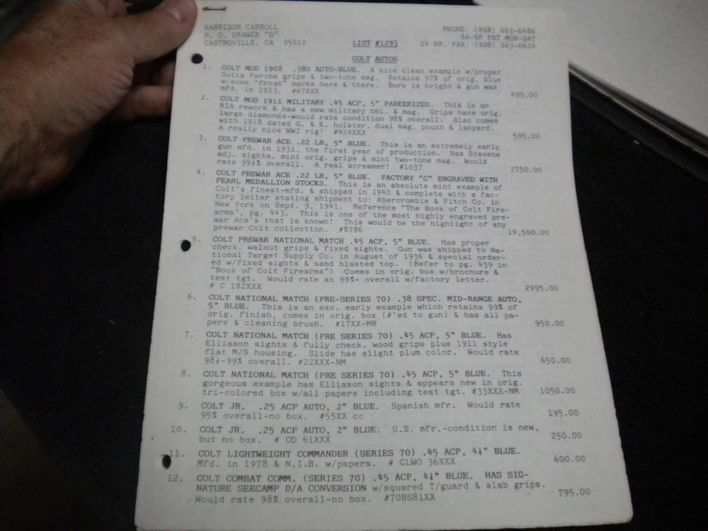 this auction is for a Harrison Carroll List 1293 ,Nov , 1993 Colt SAAs,S&W, Blk powder Price List shows some wear, the last owner had punched holes and had it stored in a notebook with others, see pictures free shipping