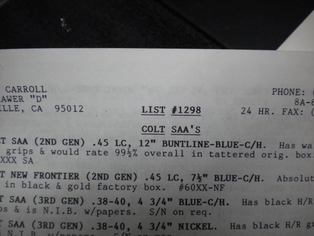 this auction is for a Harrison Carroll List 1298 Dec 1998 Colt SAAs,S&W, Blk powder Price List shows some wear, the last owner had punched holes and had it stored in a notebook with others, see pictures free shipping