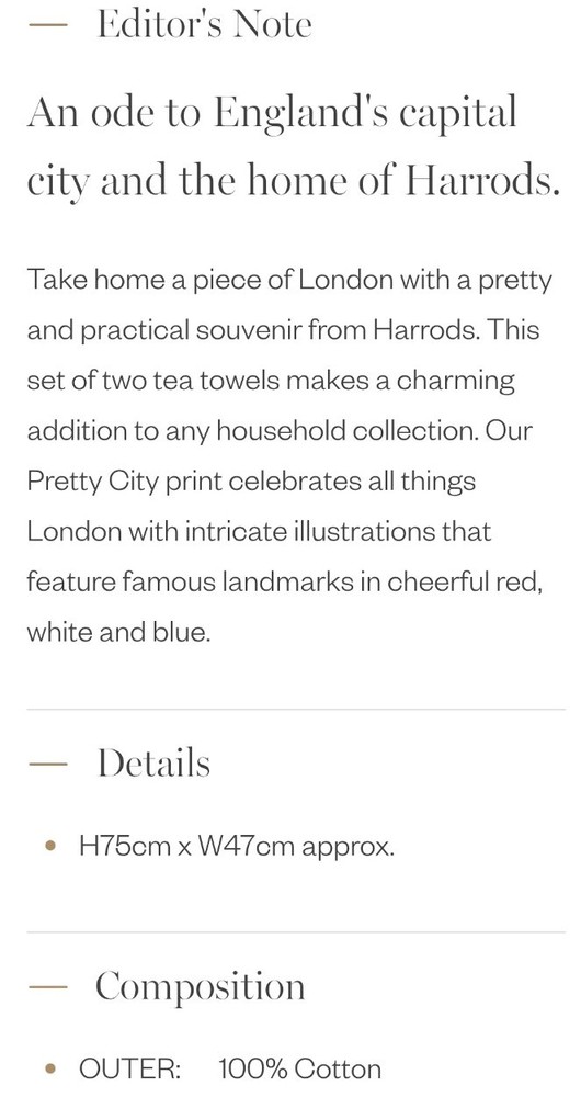 MPN: n/a Style: Traditional Set Includes: Tea Towel Number of Items in Set: 2 Country of Origin: Unknown Item Length: Less Than 40 in Occasion: Multipurpose Materials sourced from: United Kingdom Country/Region of Manufacture: london Theme: London Personalize: No Care Instructions: Machine Washable up to 100°F Color: Multicolor Features: Machine Washable Material: 100% Cotton Type: Towel Set Brand: Harrods Item Width: 16-20 in