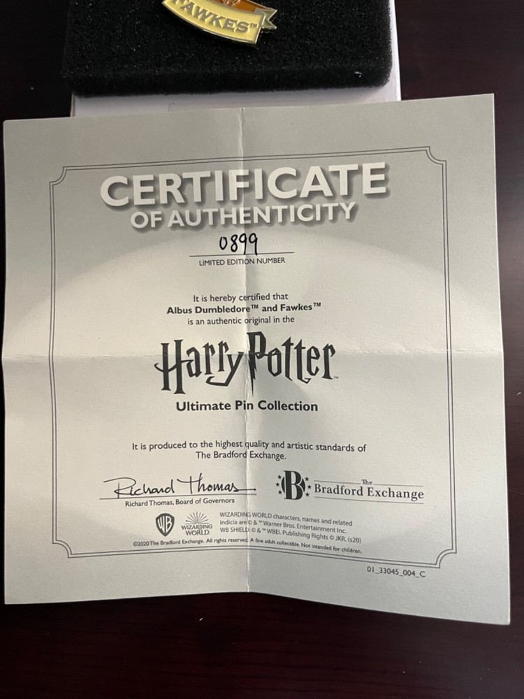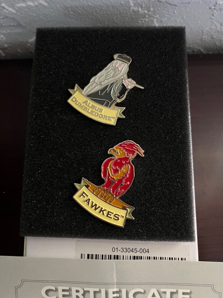 Bradford Exchange partnered with Warner Brothers and created a limited edition pin collection. This listing is for the Albus Dumbledore and Fawkes pins. The set comes with the COA and this set is # 0899 and was available in 2020. Please see the photos. All sales are final. I will combine shipping whenever possible and I am selling my entire Harry Potter Collection. Please review photos carefully. All sales are final and items are sold as is.