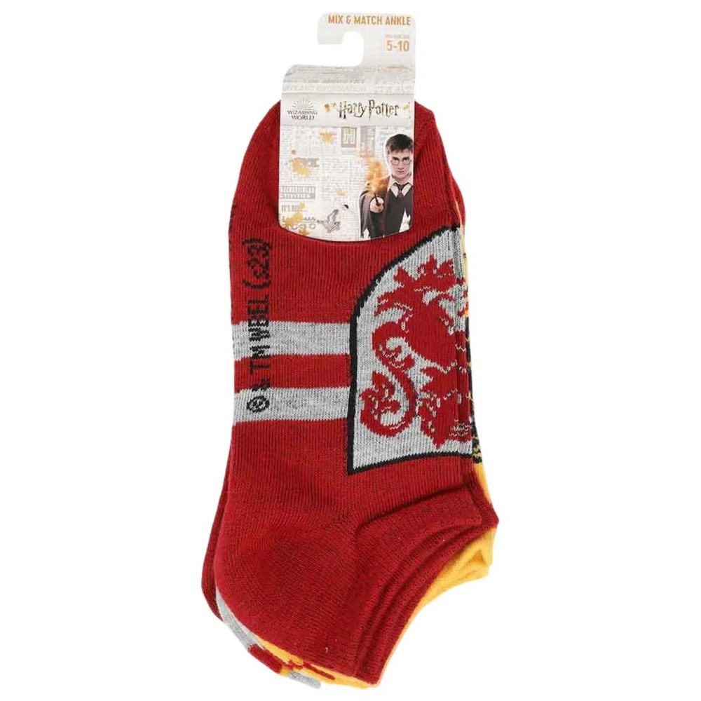 Harry Potter - Gryffindor Socks Set (5 Pack) - Bioworld Condition: Shoe Size 5 - 10 Show off your house pride with the Harry Potter Gryffindor Socks Set (5 Pack) from Bioworld. Perfect for Gryffindor fans, this set features vibrant designs that celebrate the iconic house, making it a must-have addition to any Harry Potter collection. Crafted from a poly-spandex blend, these socks provide a comfortable fit with flexibility and extra comfort. The material is designed to keep your feet feeling great throughout the day, whether you're studying in the library or casting spells at Hogwarts. Sized to fit sock size 9-11, which corresponds to shoe size 5-10, these socks offer a reliable and snug fit for most feet. The set comes with five unique pairs, each showcasing the bold colors and symbols of Gryffindor, so you can represent your favorite house in style. For easy care, simply machine wash cold with like colors, avoid bleach, and tumble dry on low heat. These socks come with a custom hanging header card for convenient display and are imported. Whether you're a Gryffindor at heart or looking for the perfect gift for a fellow fan, this set is sure to be a hit. Browse what else we have in stock - thousands of toys, games, and other fun merchandise from Poggers, the best toy store in the world!