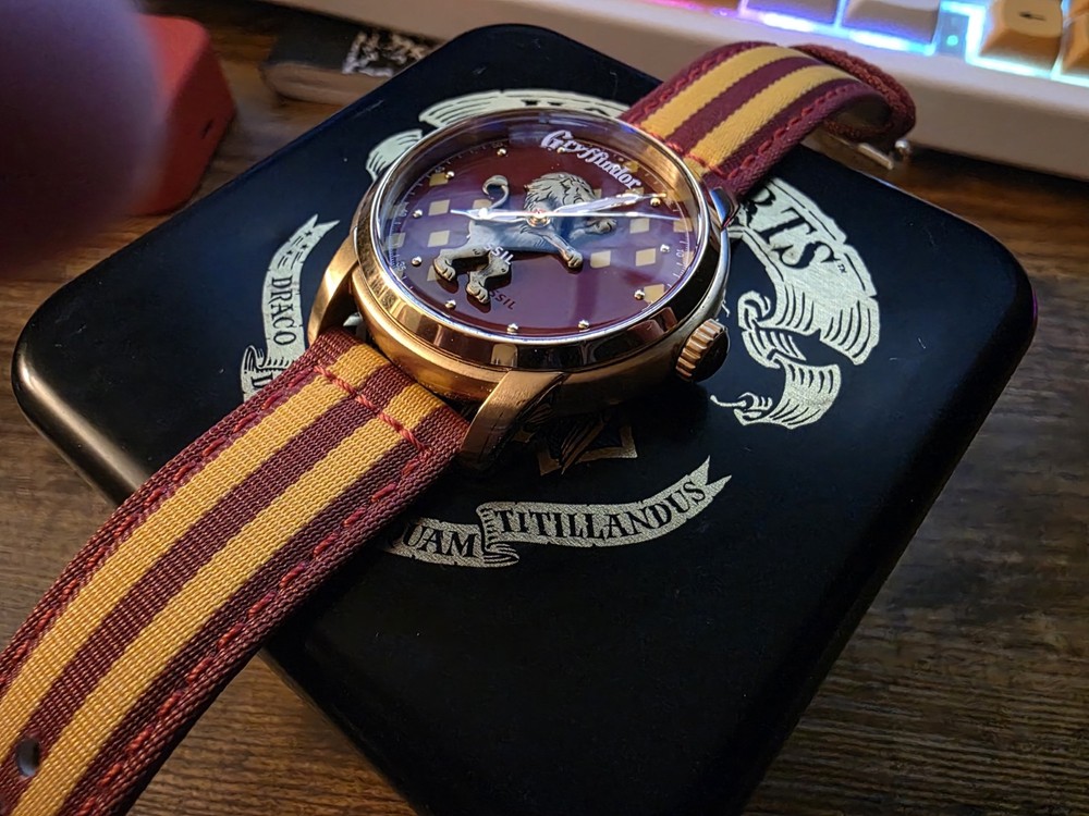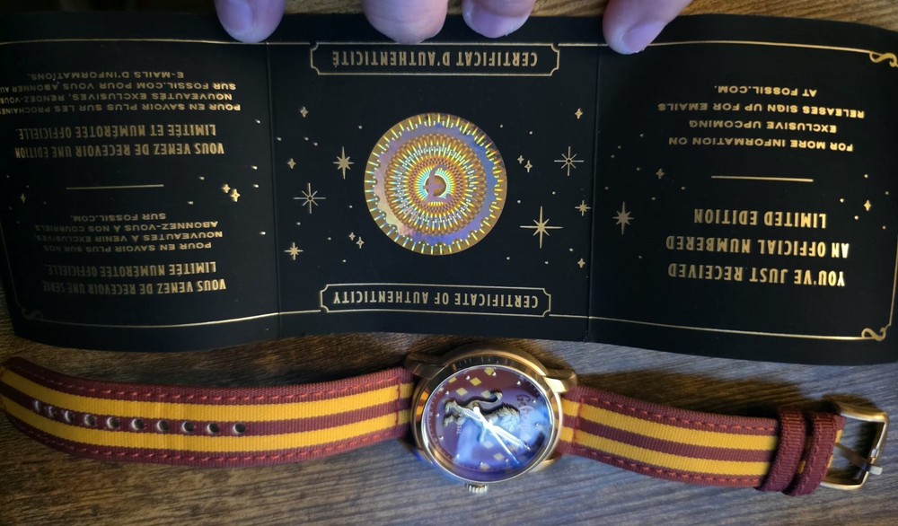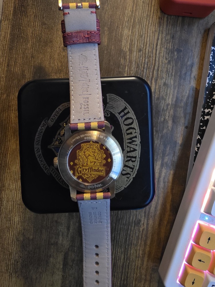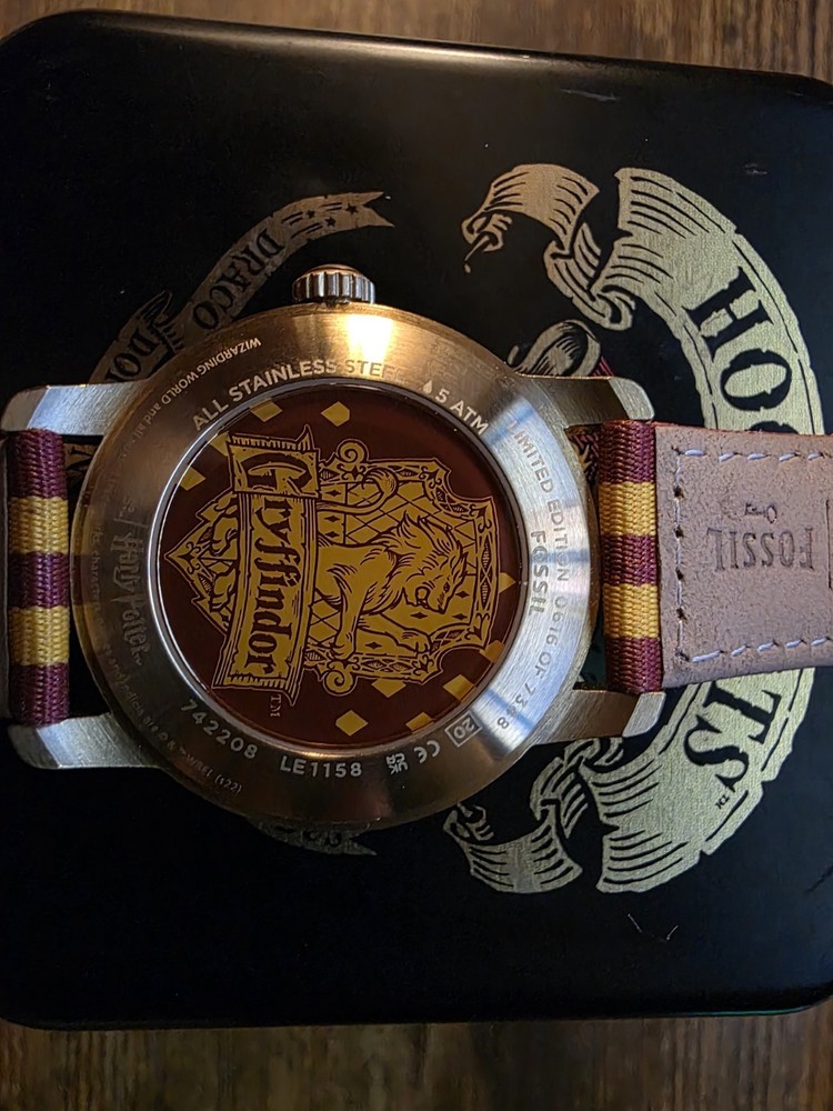 The Harry Potter Gryffindor Fossil Watch is a limited edition wristwatch inspired by the popular Harry Potter franchise. Created by Warner Bros., this fantasy-themed timepiece features intricate details and symbols from the magical world of Harry Potter. This collectible item is a must-have for fans of the series, showcasing the iconic Gryffindor colors and emblem. Made in the United States, this branded watch is a unique and special addition to any Harry Potter enthusiast's collection. Watch is in great condition, the original box is a bit scratched up with tiny dents.