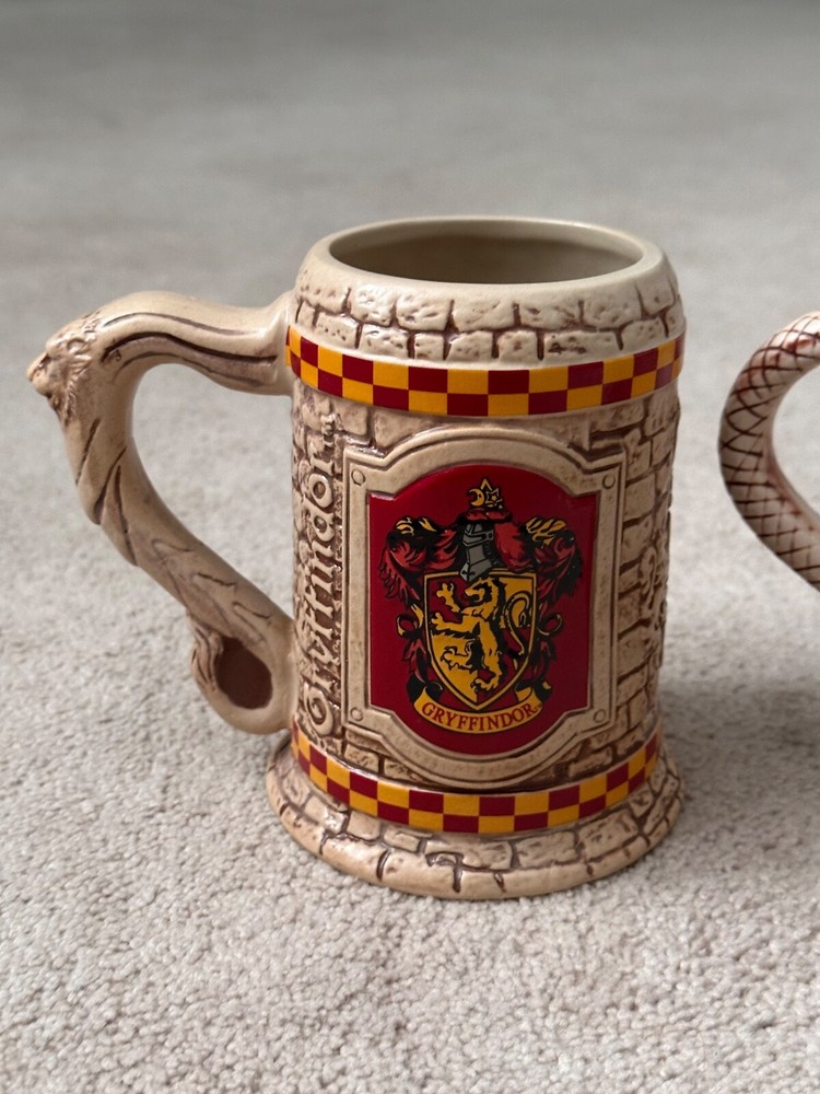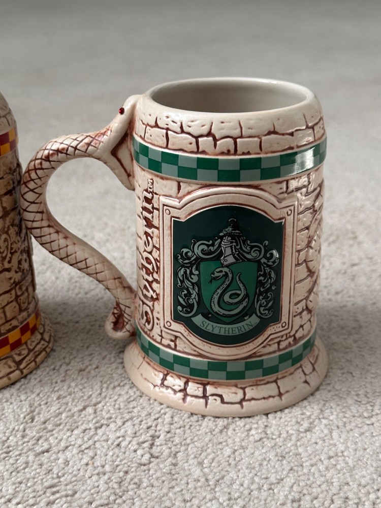Wizarding World of Harry Potter - Sculpted Ceramic Gryffindor + Slytherin Steins Ceramic 16 oz Approx. 5.5" (height) x 4" (diameter) Beautifully sculpted details reflecting Gryffindor and Slytherin houses Never used or washed, stored with care in a smoke-free home. Buy with confidence!