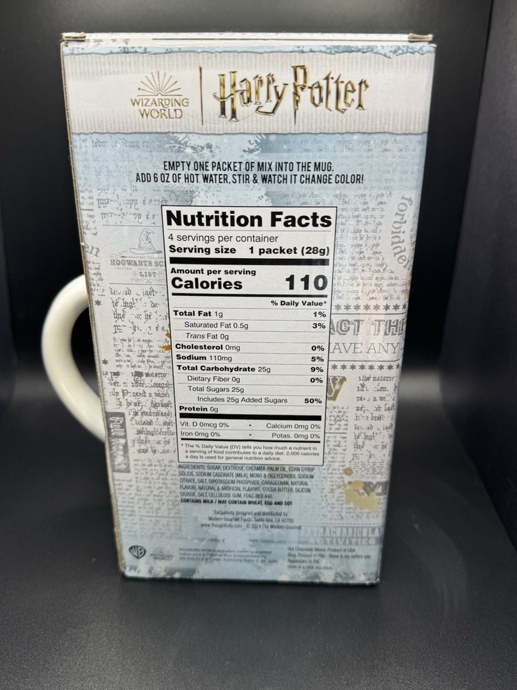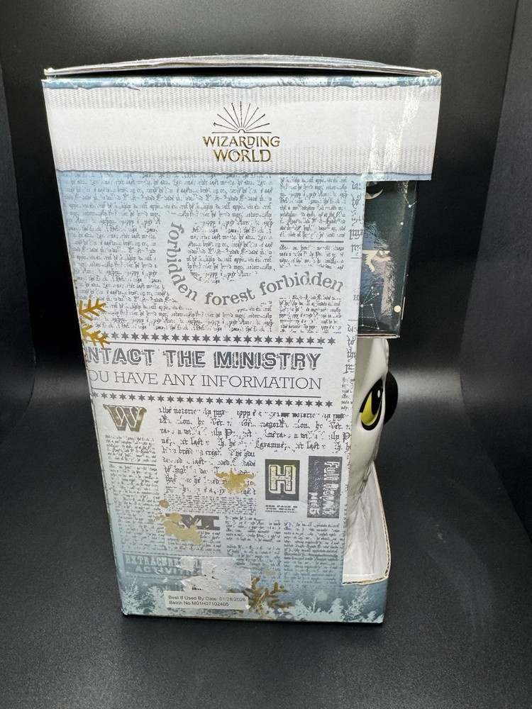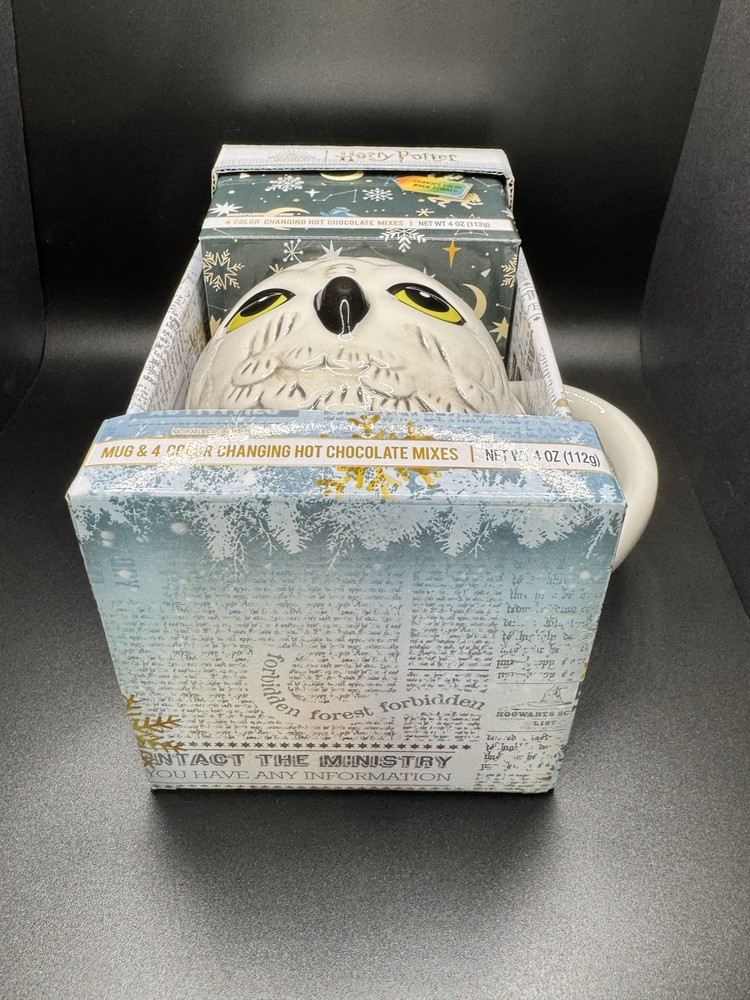 The Harry Potter Owl "Hedwig" Mug with Color Changing Hot Chocolate Mix is a whimsical and magical addition to any wizard's kitchen. This jumbo mug features an oval shape with a white ceramic design accented with animal print patterns and the iconic owl character from the Harry Potter series. Perfect for all occasions, this mug comes with four color changing hot chocolate mixes that add a touch of enchantment to your hot beverage experience. With its 12 fl oz capacity, this mug is both practical and enchanting for any Harry Potter fan.