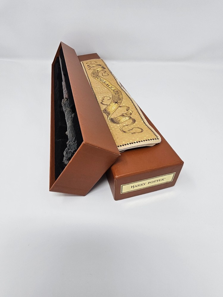 Experience real magic with this official Harry Potter interactive wand from Universal Studios’ Wizarding World of Harry Potter! This authentic wand works with interactive spell locations throughout the parks — wave it at marked areas to cast spells just like a true Hogwarts student. Comes complete with the original Hogsmeade collector’s box and spell location map to guide your magical journey. Includes: Official interactive wand (resin with IR sensor) Collector’s box with Hogsmeade design Interactive map with spellcasting zones Purchased directly from Universal Studios Orlando Key Features: Fully functional at Universal theme parks (Orlando & Hollywood) High-quality theme park collectible Great for display, cosplay, or real wizarding adventures Condition: Gently used – tested and fully functional in-park. Wand, box, and map all in excellent condition with minimal signs of use