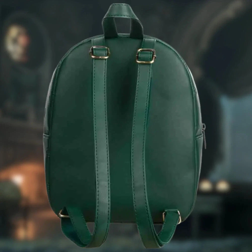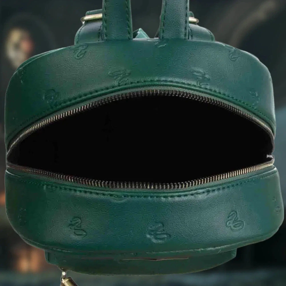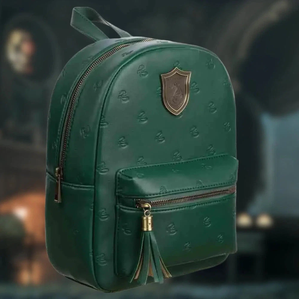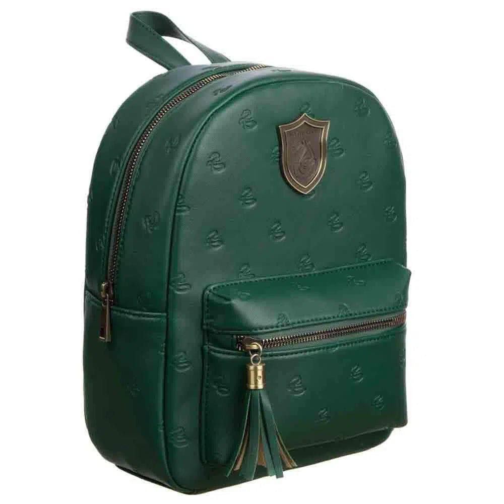Harry Potter - Slytherin Mini Backpack - Bioworld Condition: New The Harry Potter - Slytherin Mini Backpack by Bioworld is the perfect accessory for fans of the Slytherin house. Designed with a sleek, green synthetic leather exterior, this backpack showcases a metal badge and an embossed pattern, reflecting the house's distinctive style. Whether you're off to class or out for an adventure, this backpack is a stylish way to carry your essentials. The backpack features a convenient tassel zipper puller for easy access, while the adjustable shoulder straps ensure a comfortable fit. With its compact yet functional design, this backpack provides ample space to carry your items securely. The interior is fully lined, offering extra durability and protection for your belongings. Made from high-quality synthetic leather, this mini backpack is both stylish and practical. It measures 11" H x 8.5" W x 4" D, making it the perfect size for everyday use. Easy to maintain, simply wipe it clean with a damp cloth to keep it looking new. This officially licensed Harry Potter accessory is an essential for any Slytherin fan looking to display their house pride.